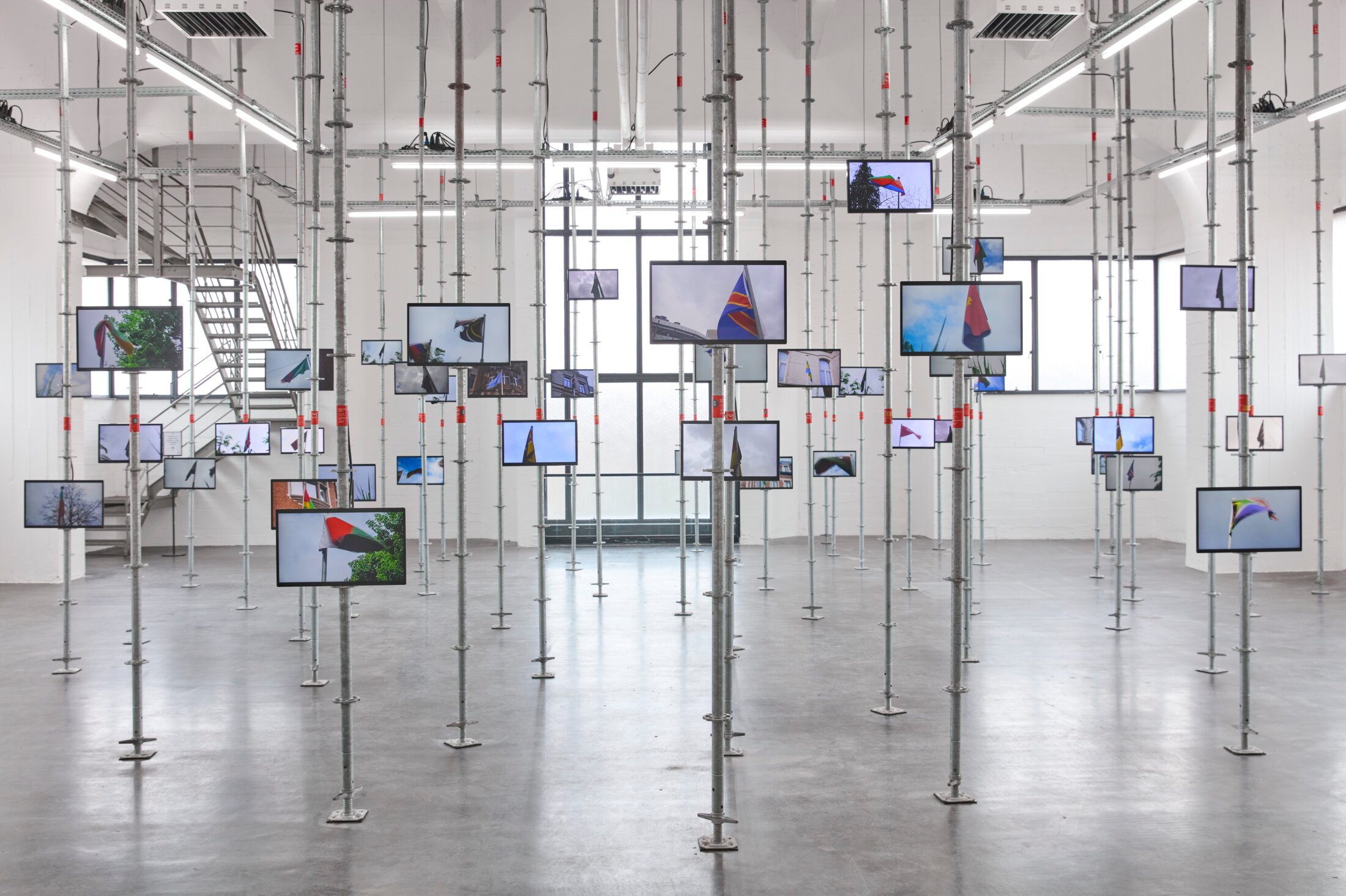 La deuxième salle est entièrement occupée par l’installation immersive, « Banderas Rotas » (Drapeaux brisés, 2014), composée de dizaines d’écrans vidéo montés sur des échafaudages, qui donnent à voir des drapeaux en décomposition, métaphore de la fragilité croissante des États-nations. Les cinquante-quatre drapeaux des états du continent africain rappellent l’artificialité des frontières coloniales tout en faisant le constat de la persistance de leur pouvoir, continuant à contribuer à la prospérité de l’Europe et, plus largement, de l’Occident. À l’étage, face à une fenêtre panoramique donnant sur Bruxelles, est projeté le film « Ol Ori Buruku » (2015) qui met en scène un immigré nigérian se tenant au sommet de l’Edificio Itália de São Paulo, observe la silhouette de la ville en proférant des insultes en yoruba. Le film évoque la violence de l’adaptation forcée. La préservation de la langue devient ici un acte de résistance. La présentation superpose Bruxelles à São Paulo pour mieux rappeler que cette violence est partout.