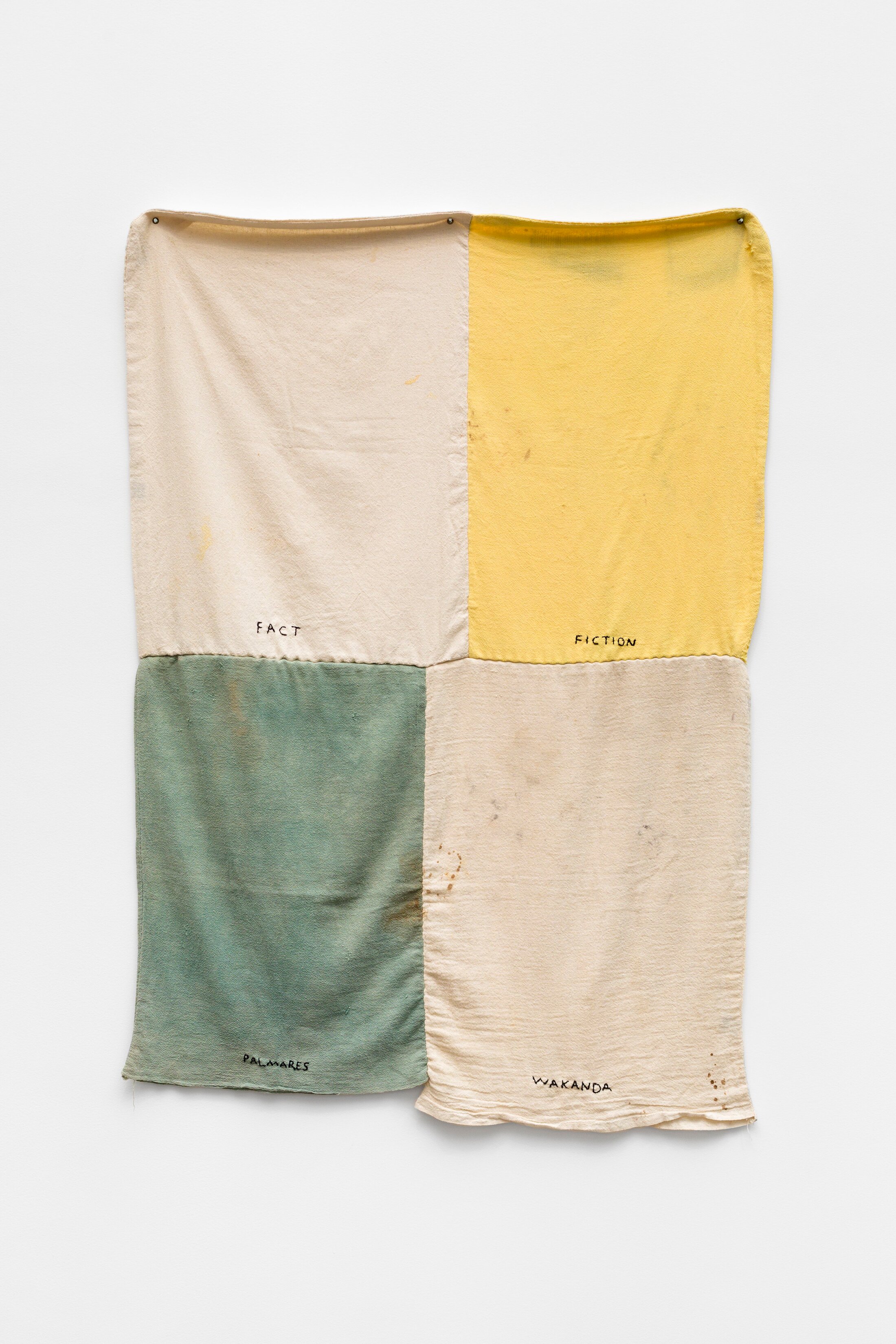 À proximité, le travail brodé « Palmares/ Wakanda » (2023) relie, par-delà le temps et l’espace, deux utopies noires. Le Quilombo dos Palmares fut le plus organisé et le plus durable des territoires autonomes d’esclaves marrons – ou quilombos en portugais –, du Brésil. Pendant près d’un siècle, de 1605 à 1694, il réussit à tenir en échec les expéditions militaires hollandaises et portugaises, demeurant la révolte d'esclaves la plus longue de l’histoire. L’artiste le rapproche du royaume de Wakanda, pays fictif d’Afrique dans la bande dessinée Black Panther de Marvel, qui figure une société épargnée par le colonialisme, entrelaçant la résistance historique avec les rêves contemporains de liberté.