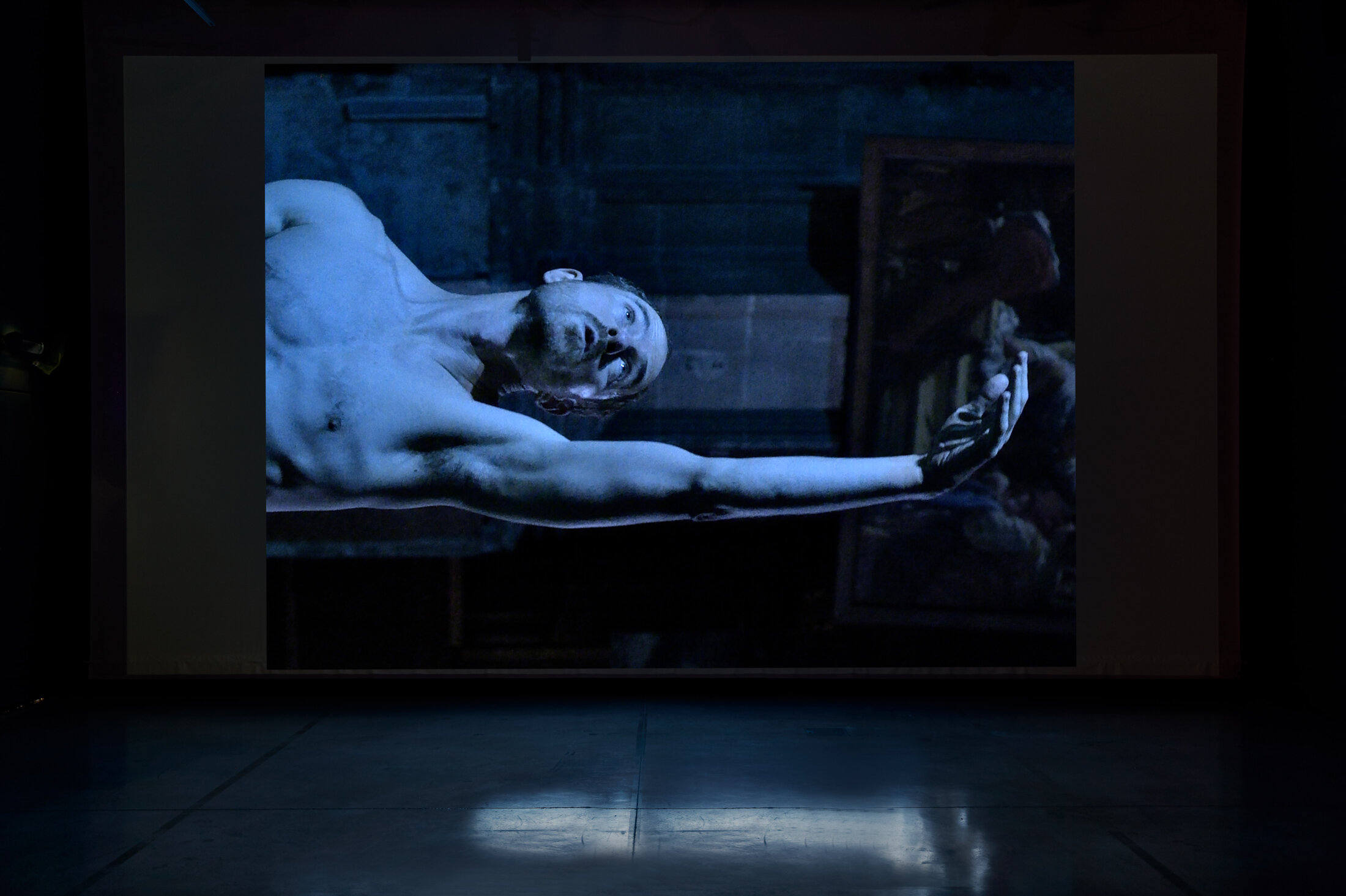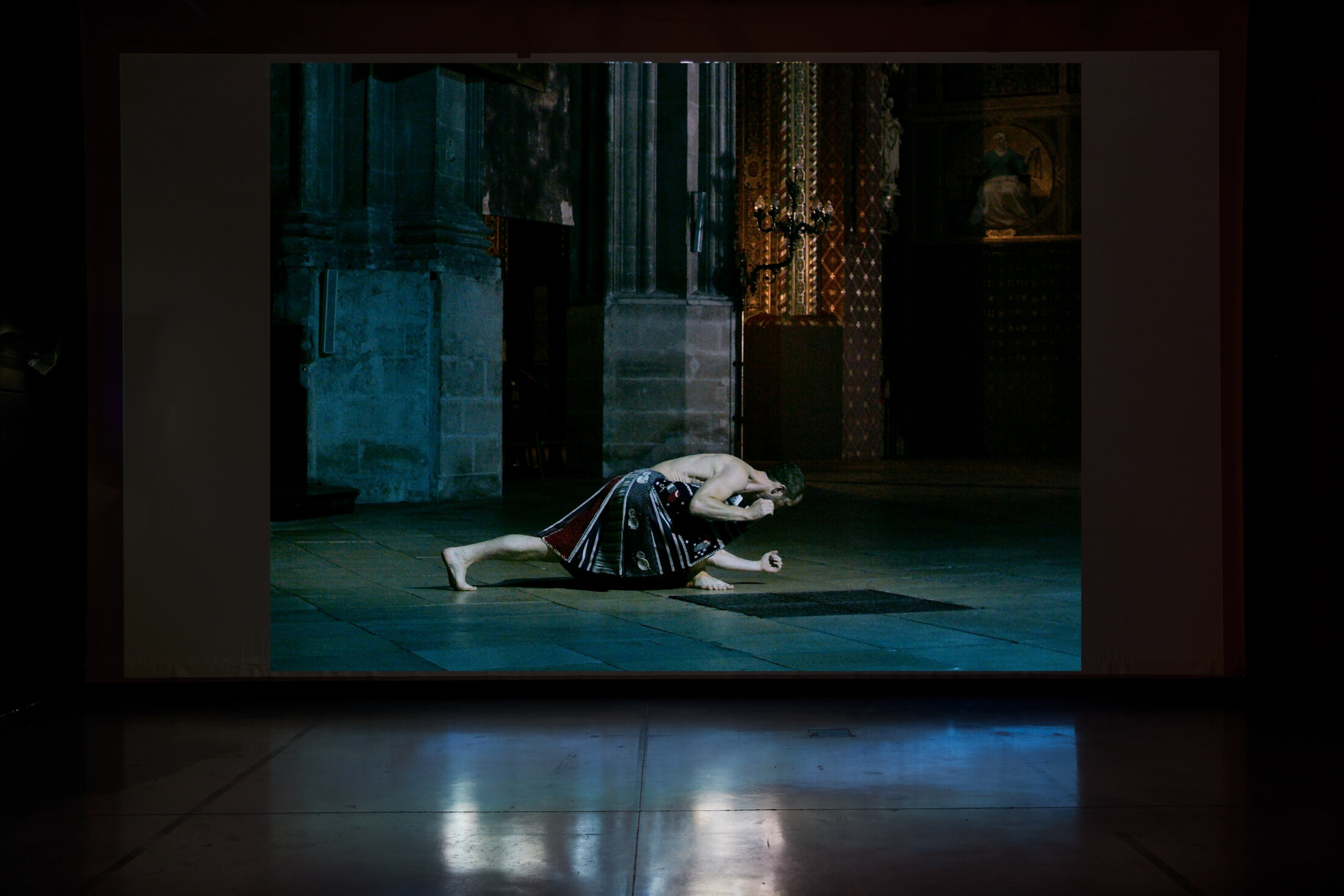 « Les disparates » (1999), film le plus ancien, accueille les visiteurs en marquant l’entrée de l’exposition. Il émane d’une pièce solo pour Boris Charmatz chorégraphiée à quatre mains avec Dimitri Chamblas. Tourné à Dieppe, il est découpé en saynètes qui, rapportées au musée, figurent autant de tableaux. Le travail, assez pictural, est à rapprocher des « Disparates » de Francisco de Goya y Lucientes. Aussi appelée « Proverbios »,la série de l’artiste espagnol compte vingt-deux estampes exécutées entre 1815 et 1823, et est sans doute incomplète. Mais on y décèle également l’influence du cinéma de Jacques Tati et de celui de Jacques Demy. Dans la danse classique, ce sont les corps qui parlent, les visages restant impavides tels des masques. Le film sort de cette assertion pour proposer des visages expressifs. « Les disparates » ouvre et ferme l’espace du rez-de-chaussée. « TRANSEPT » lui fait pendant à l’étage, prolongeant ainsi l’exposition à la manière d’une ouverture vers de nouveaux possibles dans des temps incertains. Tourné en 2023 à l’église Saint-Eustache à Paris, le film est tiré du spectacle « Somnole », conçu pendant la période de confinement. Le solo est un exercice rare chez Boris Charmatz. Il est en plus ici entièrement sifflé d’airs classiques et populaires par un dormeur éveillé. « De Jean-Sébastien Bach à Wolfgang Amadeus Mozart en passant par des airs de chansons populaires, il nous invite à prendre conscience que la musique nous rassemble, que nous connaissons et partageons ce patrimoine quelle que soit notre histoire[2] » explique Muriel Enjalran. Dans ce voyage intérieur, la question du sacré se charge ici du parfum du scandale. Les références aux actes de pédophilie dans l’Église catholique traversent la pièce, et lorsque Charmatz siffle la « chanson de Solveig » ce n’est pas à « Peer Gynt » que l’on pense bien qu’elle en est extraite, mais à l’antienne sifflée à plusieurs reprises par le tueur d’enfants dans « M le Maudit » de Fritz Lang. Le film devient alors une expérience aussi époustouflante qu’éprouvante.