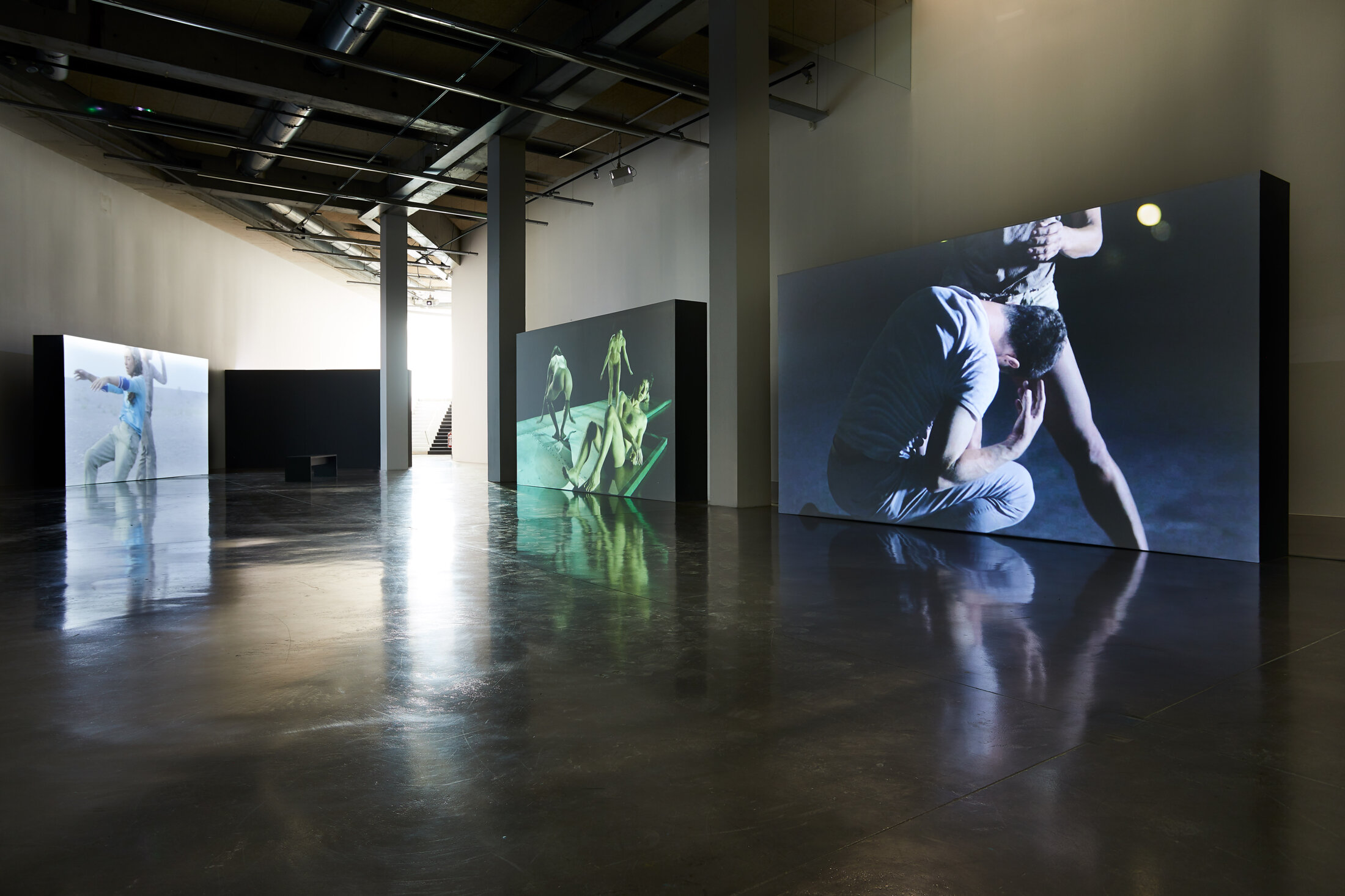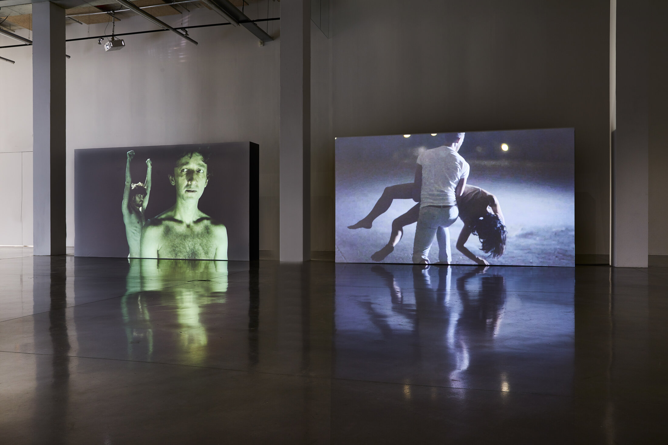 Un système de cimaises spécialement pensé pour l’exposition permet un rapport contemplatif muséal aux œuvres, les écrans étant placés au même niveau que les danseurs. Ils sont ici divisés en trois diptyques : « Les disparates » (1999), le plus ancien, avec « Transept » (2023), le plus récent, d’après le solo « Somnole » ; « Levée » (2014) qui reprend partiellement le titre de la pièce « Levée des conflits », avec « Danse gâchée dans l’herbe » (2023), qui donne son titre pluriel à l’exposition et qui reprend les gestes de « Levée » ; « Étrangler le temps » (2021), avec Emmanuelle Huynh, hommage à Odile Duboc qui en a conçu la chorégraphie[1] avec Françoise Michel en 1996. avec « Une lente introduction » (2007), film pour deux couples, qui revisite la pièce « Herses (Une lente introduction) » conçue dix ans plus tôt.