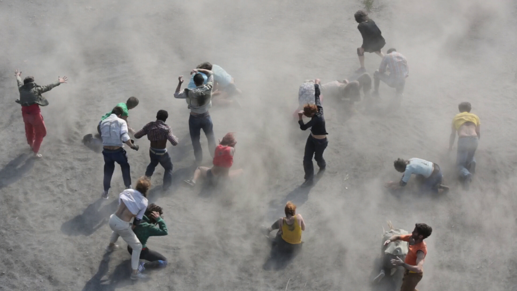 Dernière production de la compagnie, « Danse gâchée dans l’herbe » (2023) est conçue directement pour l’exposition. Marion Barbeau, qui collabore ici pour la première fois avec Boris Charmatz, y interprète un solo d’après les matériaux chorégraphiques de « Levée des conflits » (2010). Le tournage, sur un terrain vague à proximité du Centre Pompidou-Metz, a été attaqué par une impressionnante colonie de hannetons à la nuit tombée. Elle danse malgré tout, les oreilles emplies des improvisations ininterrompus du violon d’Amandine Beyer. « Levée » (2014) s’inspire aussi de la pièce chorégraphique « Levée des conflits ». Les deux films entrent en dialogue, composant des tableaux vivants solo et collectifs, issus de la même création chorégraphique. Sous le regard de César Vayssié, ils deviennent des compositions originales, diurne et nocturne. Ici, un groupe de danseurs forme une composition frénétique dans un nuage de poussière sur un terril dans la Ruhr. « Ils semblent ici, en vêtements de couleurs vives, sortir tout droit du tableau flamand La Danse de Noces de Pieter Brueghel l’Ancien où l’on retrouve cette composition en spirale et cette énergie dégagée par une communauté dans un moment de convivialité sociale[3] » analyse Muriel Enjalran. Le film apparait en contrepoint du solo nocturne dansé par Marion Barbeau.