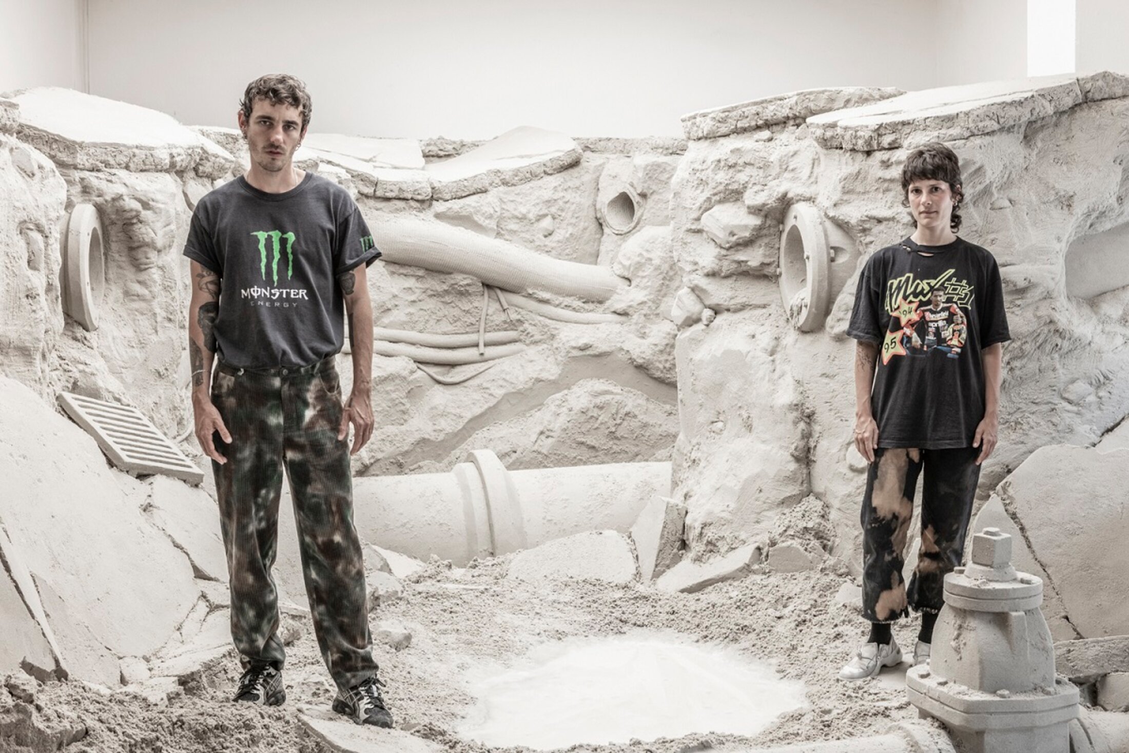 Intitulée « GUT CITY PUNCH », que l’on peut traduire par « Coup de poing dans le ventre de la ville », l’installation, entièrement sculptée dans le sable, évoque l’urbanisation massive autant que les entrailles de nos sols. Une trentaine de tonnes de sable de provenance locale – prélevé le long de la Vitava, à quelques kilomètres, où il reviendra à l’issue de l’exposition, inscrivant la production dans un modèle de circuit court – a été nécessaire à l’édification de la représentation de la ville en perpétuel chantier par les sculpteurs de sable Enguerrand David, Jiří Kašpar et Jeroen Advocaat. Une bande sonore a été composée par Théo Mercier et le musicien Joseph Schiano di Lombo, spécifiquement pour l’œuvre dont la vision impressionne, « un geste maximaliste au niveau de son impact visuel et un geste minimaliste au niveau de son impact écologique[3] » précisent les artistes dans leur note d’intention, qui nous invitent à nous questionner sur le regard que l’on porte sur notre environnement, « sur l'évanescence de la matière autant que du temps[4] ». Vivarium ou diorama de la catastrophe, l’installation offre le spectacle d’une ville éventrée par l’urbanisation, un glissement de terrain d’où émergent des canalisations souterraines, entrailles post-industrielles d’une terre exploitée sans fin dont témoigne l’extrême fragilité du sable. Les votants ne s’y tromperont pas, attribuant au pavillon français le prix du jury de cette quinzième édition.