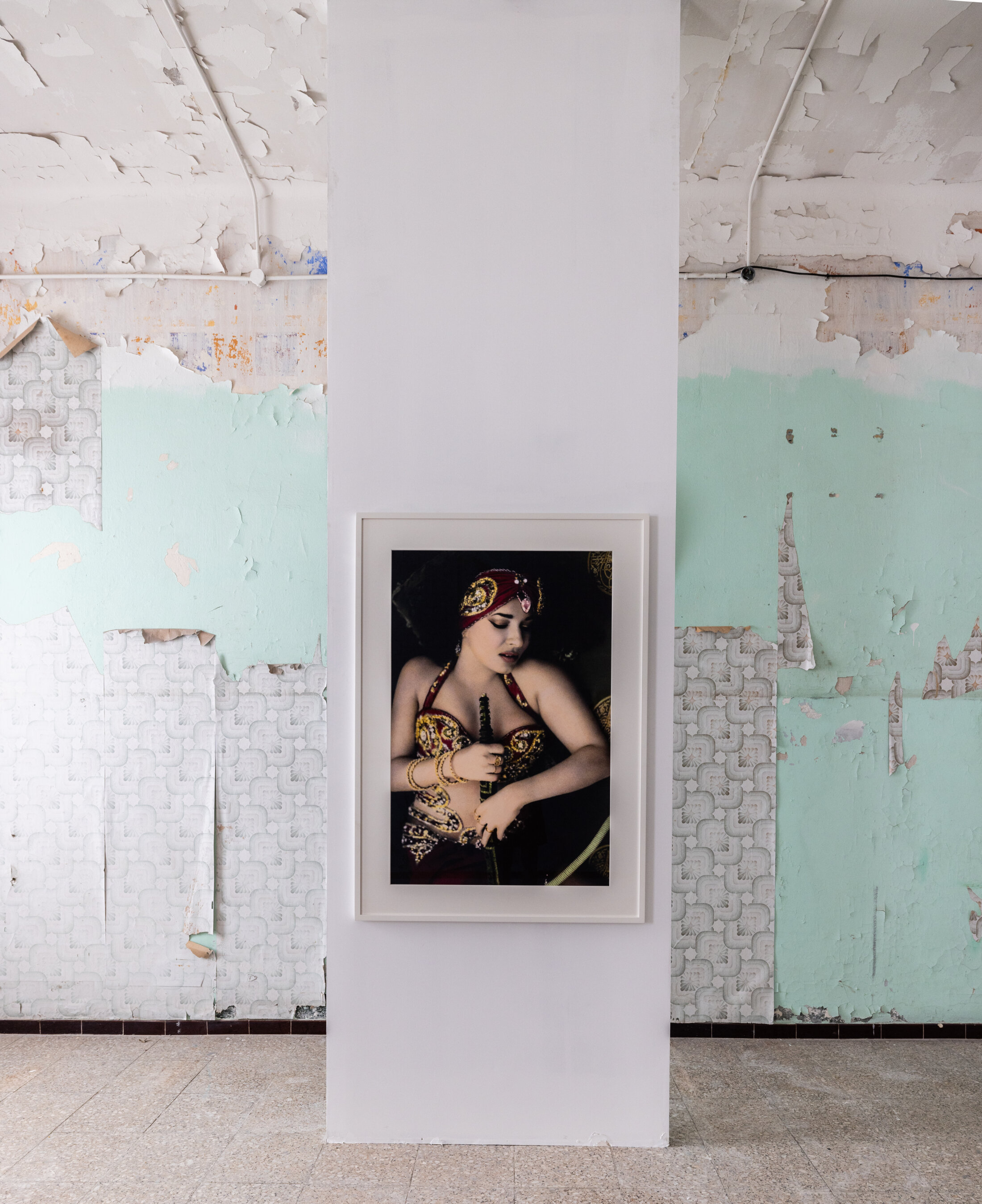 Cette déclaration d’amour à l’imagerie d’un cinéma égyptien aujourd’hui disparu, on la retrouve dans les trois photographies qui accompagnent le film, parmi lesquelles « Natacha fume le narguilé, Cairo, 2000 » en apparait comme la quintessence. Flanquée d’un costume chatoyant qui l’habille autant qu’il la dénude, la chanteuse égyptienne Natacha Atlas, photographiée à mi-corps, est alanguie, les yeux clos, tenant entre ses mains l’embout d’un narguilé. L’artiste rejoue les codes et les stéréotypes orientalistes pour livrer la représentation fantasmée de la femme arabe. Présentée sur un pilier blanc immaculé qui tranche avec le reste de la salle dont subsiste çà et là plusieurs morceaux de papier peint se juxtaposant à un mur au bleu aigue-marine délavé, l’image, coloriée à la main selon les techniques des années quarante, n’en apparait que plus mélancolique encore. Deux autres photographies, pétries de la même esthétique, transgressent un peu plus les mœurs d’une société de plus en plus puritaine. La première, d’une sensualité érotique extrême, montre deux danseuses du ventre dans un moment de repos s’abandonnant à un lâcher-prise confondant, la seconde est cadrée sur les jambes de deux hommes en djellabas, l’une noire, l’autre blanche. Quelque peu relevées, elles laissent voir les cuisses se croiser dans un geste d’infini tendresse, tandis que l’embout d’un narguilé serpente au premier plan sur un drap soyeux rose aux motifs floraux. L’artiste se joue d’un homoérotisme oriental dont seul le féminin semble permis, pour représenter toutes les formes de sexualité.