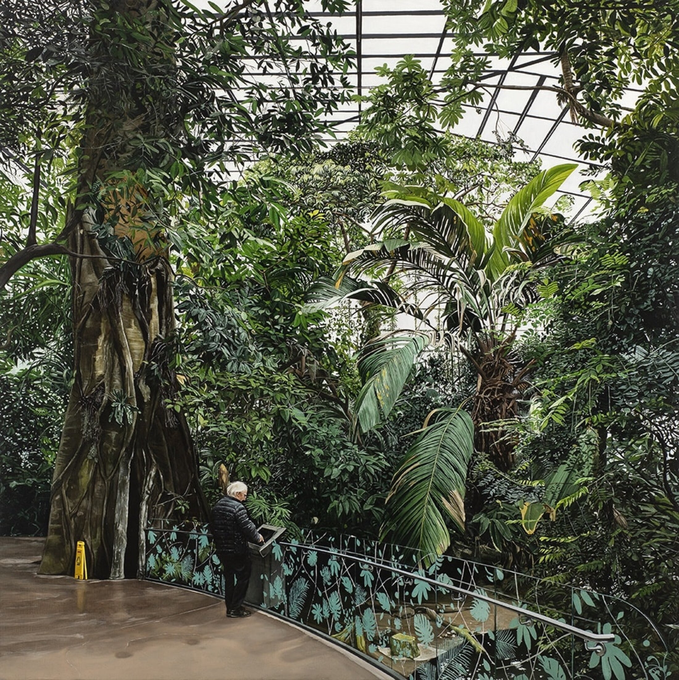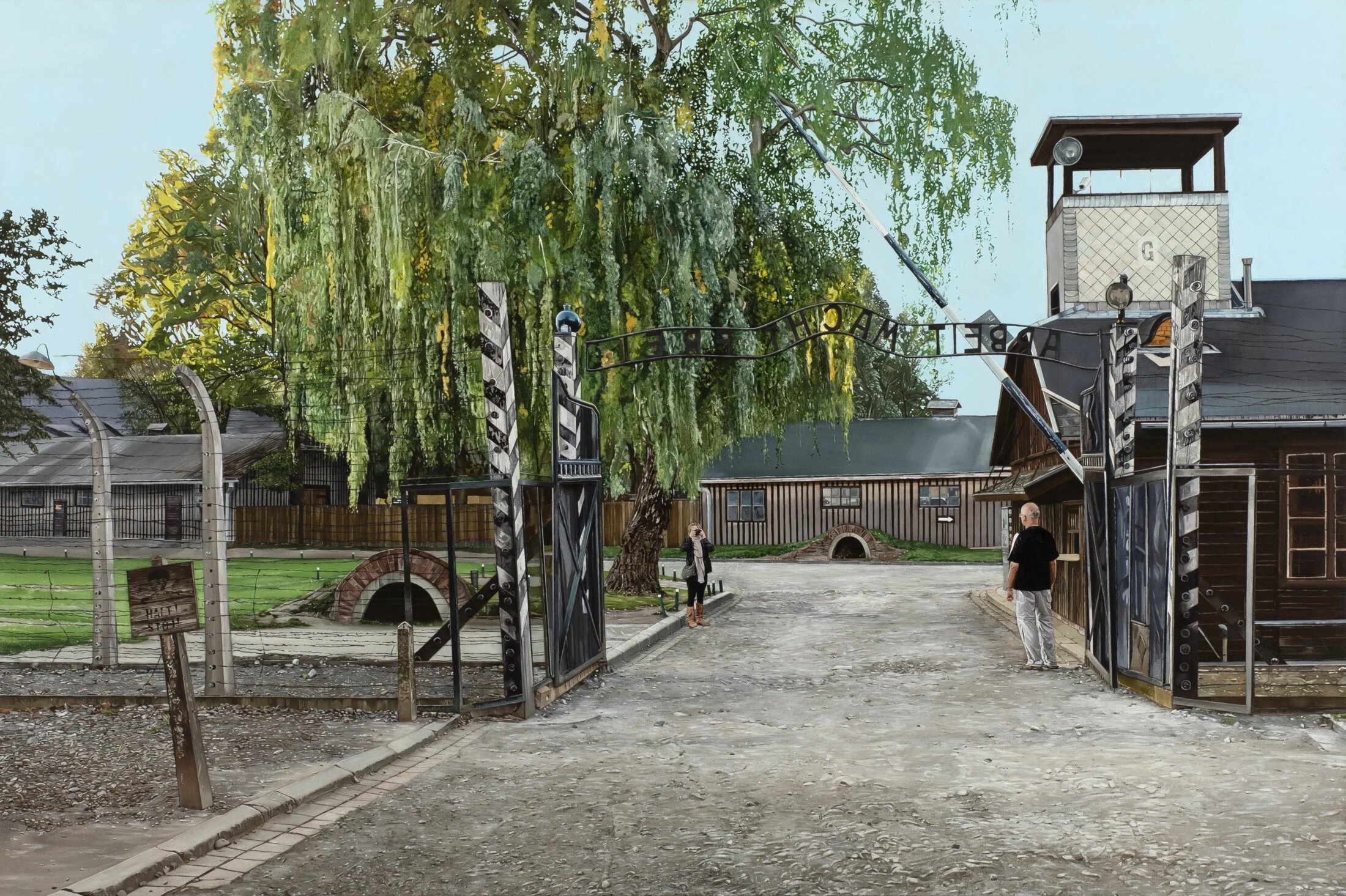 À partir de photos prises au smartphone à Montréal, il réalise « Au biodôme » (2019) qui montre un homme en train de contempler une jungle enfermée à l’intérieur d’une sorte de serre gigantesque. Le biodôme de Montréal est un musée qui se veut vivant alors même qu’il reproduit des biotopes artificiels. En reconstituant un climat tropical alors qu’à l’extérieur, la température avoisine les -30°C, c’est bien d’une catastrophe écologique qu’il s’agit. L’image parait à elle-seule contenir le paradoxe de notre époque. En 2020, Thomas Lévy-Lasne peint Auschwitz et Tchernobyl, « sa forêt rousse, sa ville fantôme », pour mieux parler du désenchantement du monde. Sur le premier tableau, un couple de touristes se photographie sous le portail d’entrée du camp d’extermination sur lequel est gravée la tristement célèbre devise : « Arbeit macht frei ». La représentation picturale d’une telle scène renvoie ce lieu symptomatique du mal à sa banalité. Le concept de « on est dans la photo » a explosé avec l’arrivée des smartphones au point de développer un marché de petits accessoires et de conseils dédiés à la réussite des selfies. Désormais, il est plus important d’apparaitre sur l’image avec la Joconde que de photographier la Joconde. Tout devient attraction touristique.