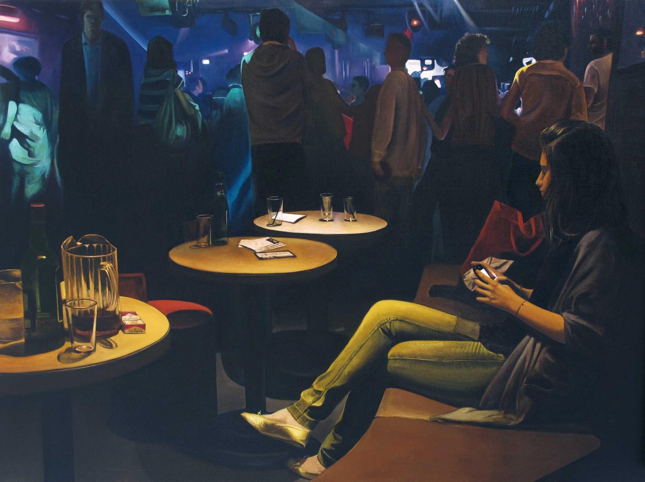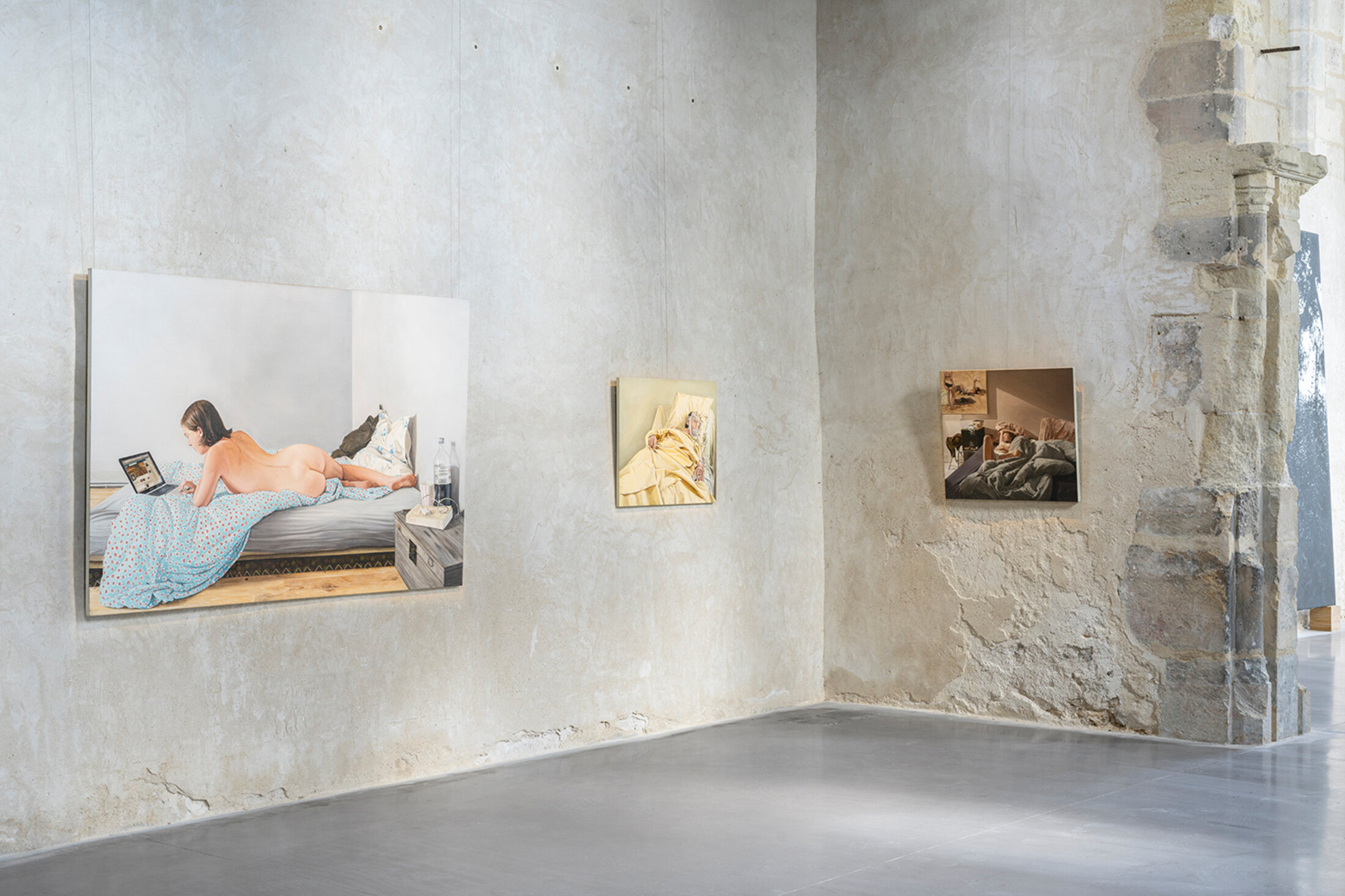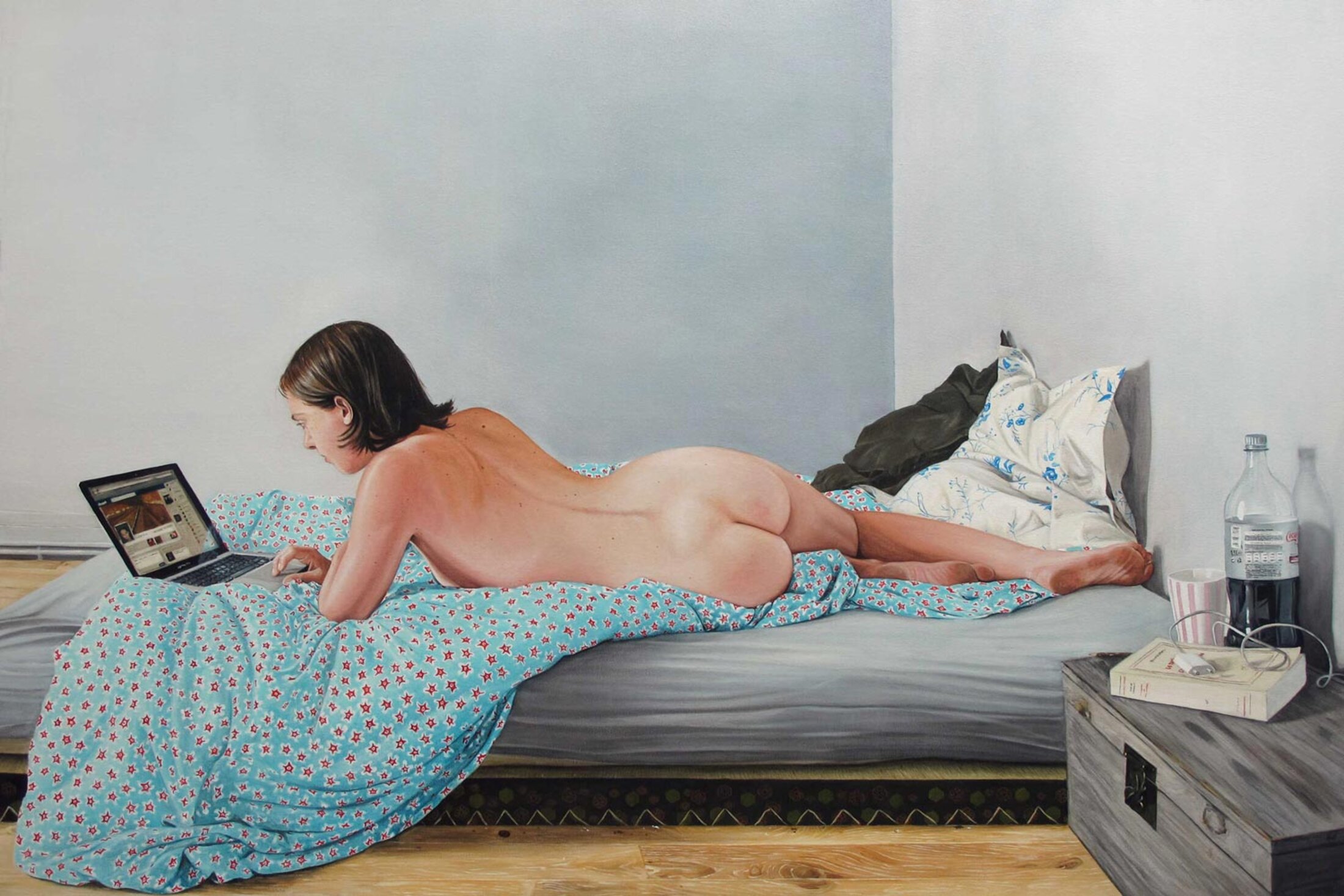 Lorsque Thomas Lévy-Lasne commence ses études à l’École nationale supérieure des Beaux-arts de Paris d’où il sera diplômé en 2004, la peinture n’est pas vraiment un médium à la mode, bien au contraire. Elle est envisagée comme obsolète. On annonce pour le énième fois sa mort mais la peinture survivra comme toujours. « Ce n’est pas de chance de tomber pendant LA période où l’école d’art nationale rejetait, en France, pendant 22 ans (1986-2008), l’idée même de la validité de la peinture[3] » confie-t-il. À Chelles, l’exposition traverse le temps et l’œuvre de l’artiste, conduisant des portraits de proches du début aux humains face à des écrans, des aquarelles de fête au sexe et à la mort. Dans un tableau intitulé « Laëtitia au lit » (2012), il reprend la pose de la figure de la « Vénus au miroir » (1649-51) de Velasquez. Si la jeune femme est bien allongée nue sur son lit, elle a les yeux rivés sur son MacBook. La page internet est ouverte sur celle d’un célèbre réseau social alors proche de son apogée en 2012. En actualisant la Vénus de Vélasquez, il en fait une icône d’aujourd’hui, une contre-proposition de nu féminin dans la peinture. On note au passage le souci du peintre pour le détail dans la très grande qualité d’exécution du rendu de la peau. Comment revivifier la peinture ? « Je ne crois pas à l’innovation » déclare-t-il, préférant subvertir les clichés. Thomas Lévy-Lasne prend soin du monde. La série des aquarelles exécutée entre 2010 et 2017 à pour sujet la fête. Si autrefois, des kermesses ou des carnavals étaient régulièrement organisés dans le but de manger les restes, la fête contemporaine doit sans doute être comprise comme un objet de consommation anthropologique. « La tension entre la scène ordinaire, le cadrage de type photo ratée et le médium de l’aquarelle, confère à la série des fêtes une beauté difficile à décrire[4] ».