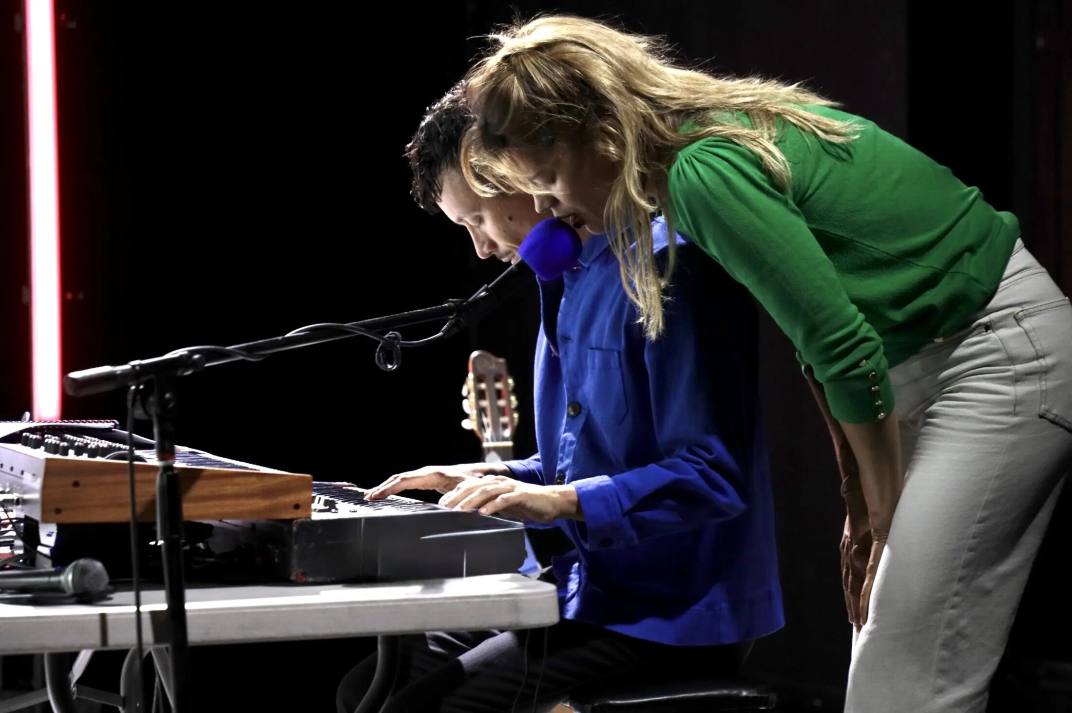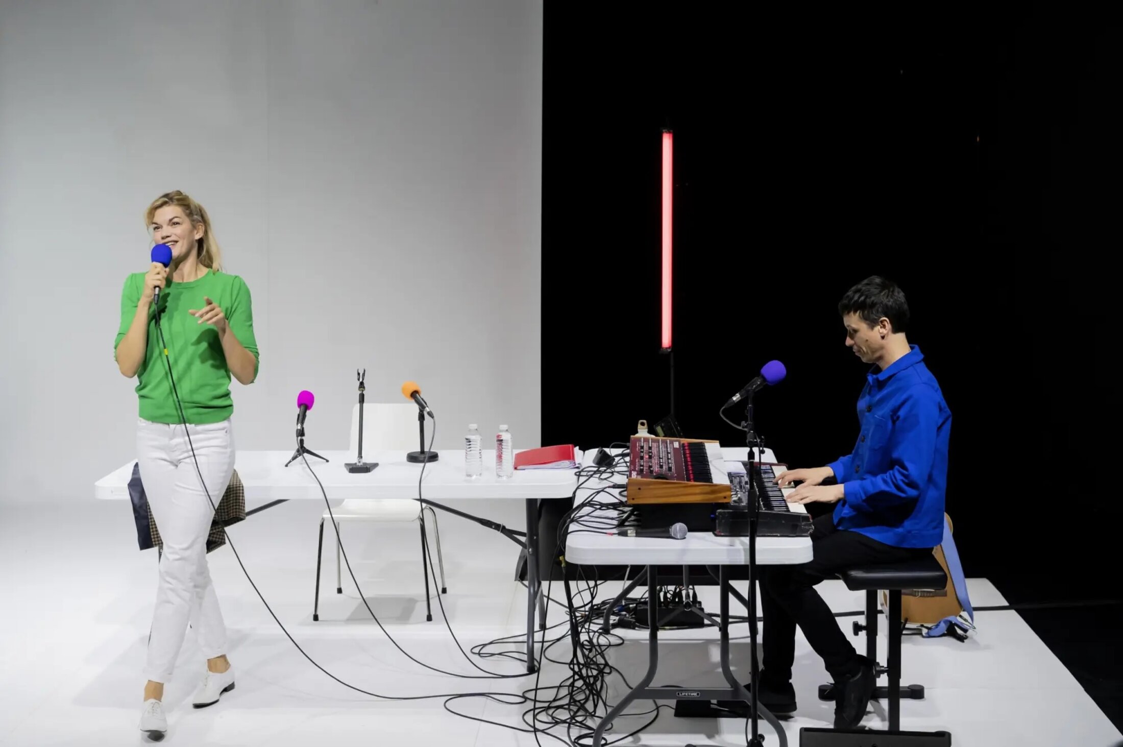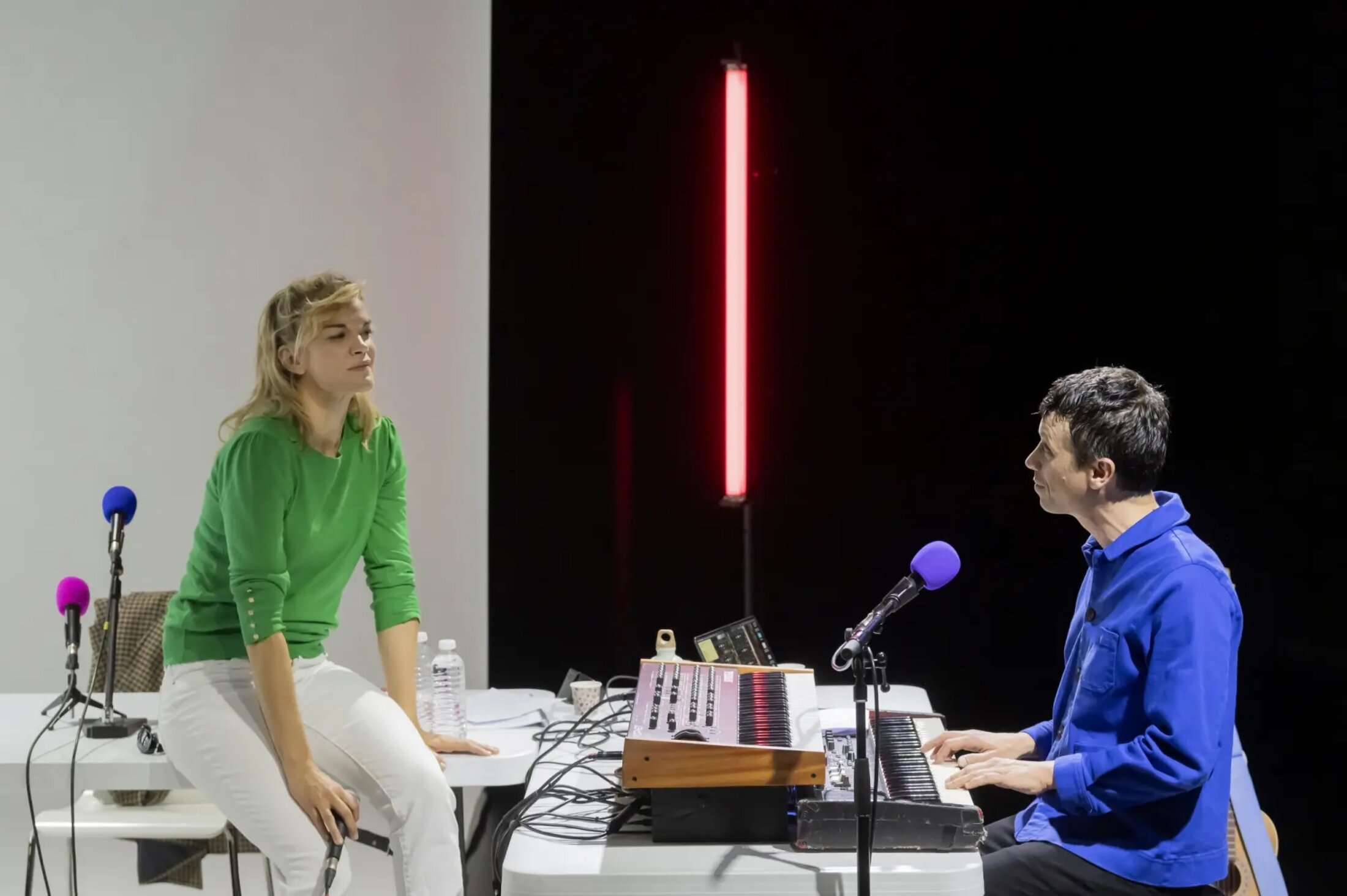 Ni récital nostalgique, ni pièce biographique déguisée en cabaret, « Barbara (par Barbara) » est une réflexion intime sur la parole d’une femme qui, de son vivant, dosait ses mots comme une décoction : un peu de mystère, beaucoup de vérité brute, et une pincée de malice pour repousser les curieux. Ici, sous la direction précise et élégante d’Emmanuel Noblet, Marie-Sophie Ferdane et Olivier Marguerit ne ressuscitent pas la chanteuse. Ils la laissent parler à travers un montage d’interviews et de lettres inédites qui révèle Monique Serf[1] derrière la « longue dame brune ». Le texte oscille entre fragments de chansons, notations biographiques et monologues intimes. Cette écriture fragmentaire est souvent vertueuse. Elle mime la manière dont la mémoire opère. Elle saute, reprend, hésite. Le spectacle touche à l’essence du théâtre : faire entendre l’absent et, dans ce silence chargé, trouver une musique plus vraie que les notes. En 2017, Clémentine Deroudille, commissaire de l’exposition « Barbara[2] » à la Philharmonie de Paris, exhume des archives oubliées : toutes les interviews radiophoniques de l’artiste, conservées par l’Institut national de l’audiovisuel (INA), et une correspondance amoureuse inédite, intime et fiévreuse. Avec Arnaud Cathrine, elle en tire un montage textuel, initialement lu par Marie-Sophie Ferdane à la Maison de la Poésie en 2017[3]. Ce qui n’était qu’une lecture devient, sept ans plus tard, un spectacle complet, mis en scène par Emmanuel Noblet, complice de longue date de la comédienne. La pièce opte pour une scénographie minimaliste, presque ascétique, composée d’une table entourée de micros vintage, comme les vestiges d’un interrogatoire radiophonique, et un double clavier – piano acoustique et électronique – qui attend l’arrivée d’Olivier Marguerit. Pas de rideaux sombres ni de spots dramatiques superflus, Olivier Oudiou signe des lumières délicates qui caressent les visages. Avec ce studio d’enregistrement pour tout décor, la pièce installe le public aux premières loges d’une émission de radio imaginaire dans laquelle Barbara répondrait enfin sans esquive.