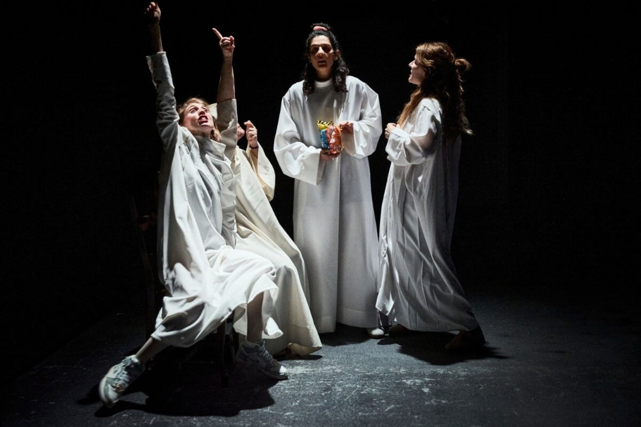 « HAUTES PERCHÉES » - avec Simon Avérous, Clara Bonnet, Émilie Incerti Formentini, Mathilde-Édith Mennetrier, Bedis Tir, Arnold Zeilig, Melissa Zehner, écriture Maurin Ollès avec l’ensemble de l’équipe artistique, mise en scène Maurin Ollès, collaboration artistique Clara Bonnet, assistant mise en scène et dramaturgie Hugo Titem Delaveau, dramaturgie Simon Avérous, Clara Bonnet, Maurin Ollès, composition musicale Bedis Tir, Arnold Zeilig, Simon Avérous, scénographie Zoé Pautet, lumière Bruno Marsol, costumes Marnie Langlois, régie générale Clémentine Pradier, Maureen Cleret, régie son Mathieu Plantevin, regard scientifique Marie Dos Santos, direction de production et diffusion Elsa Hummel Zongo, Julie Lapalus, production : La Crapule, coproduction : NEST – CDN transfrontalier de Thionville-Grand Est ; Théâtre de Sartrouville et des Yvelines – CDN ; La Criée – Théâtre National de Marseille ; Pôle Arts de la Scène – Friche la Belle de Mai ; MC2 – Maison de la Culture de Grenoble ; Les Célestins – Théâtre de Lyon ; Théâtre National de Nice – CDN de Nice ; La Comédie de Colmar – Centre dramatique national Grand Est Alsace, aide à la résidence : Théâtre Joliette – Scène conventionnée art et création pour les expressions et écritures contemporaines ; Domaine de l’Étang des Aulnes – Centre départemental de créations enrésidence ; L’Arche – Villerupt, soutiens : SPEDIDAM, Carte Blanche aux Artistes de la Région Sud, Département des Bouches-du-Rhône, Ville de Marseille. Le spectacle bénéficie du dispositif d’insertion professionnelle de l’ENSATT. Construction du décor dans Ateliers de la MC2 – Maison de la Culture de Grenoble. La compagnie La Crapule est conventionnée par le Ministère de la Culture-DRAC DRAC Provence-Alpes-Côte d’Azur. Maurin Ollès a été accompagné dans sa recherche par « Future Laboratory », un projet EUROPE CREATIVE 2021-2025 de résidences de recherches, rassemblant 12 institutions théâtrales européennes, coordonné par les Théâtres de la Ville de Luxembourg. Accompagné par la Comédie, CDN de Reims, Maurin Ollès a pu mener des immersions à Milan via le Piccolo Teatro di Milano, en Roumanie via le Teatrul Tineretului Piatra-Neamt, à Porto via le Teatro Municipal do Porto. La compagnie La Crapule est associée à La Comédie de Colmar et au Théâtre de Sartrouville et des Yvelines – CDN pour les 3 prochaines saisons. Maurin Ollès est Artiste au long cours au NEST – CDN Transfrontalier de Thionville – Grand Est depuis septembre 2024. Remerciements : Claire Duport, Renaud Colson, Michel Kokoreff, Perrine Roux, Serena Garbolino, Martin Bastien, Patrick Pharo, Jeremy Bacchi, Sonny Perseil, Sarah Perrin, Nelly Bertrand, Frédérique Iragnes, Morgan Donaz-Perrier, Matthieu Lepers, Estelle Arculeo, Sophie Desrousseaux, Ferdinand Garceau, Thomas Morisson, Elena Lofredi, les différentes structures qui nous ont ouvert leurs portes et toutes les autres personnes rencontrées durant les recherches de Maurin Ollès. Spectacle répété et créé au Théâtre de Sartrouville et des Yvelines – CDN le 14 janvier 2026, vu au Théâtre de Sartrouville et des Yvelines – CDN, le 16 janvier 2026.