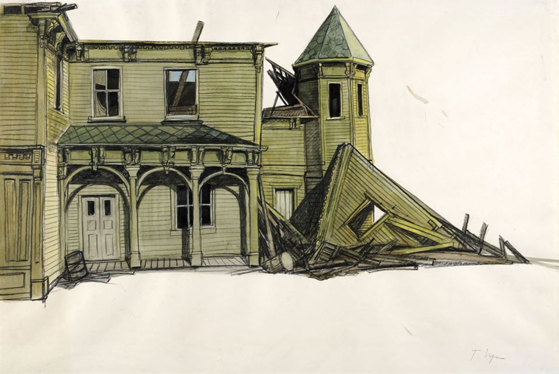 Dans ses dessins politiques, le temps et la mort occupent une place prépondérante. Ils apparaissent dans la satire sociale dès les années 1960 pour dénoncer la mise en place d’une société moderne dans laquelle le gain de temps et la rentabilité deviennent la norme, comme on peut le voir dans « Der Herzinfarkt » (l’infarctus) où la mort apparaît pressée, figurée sur un tracteur. La même approche sous-tend sa critique de la Middle Class américaine dans l’ouvrage « The Party » (1966). Il prend position contre la guerre du Vietnam en réalisant des images d’une extrême violence qui seront refusées par son éditeur. A ce moment, sa palette picturale n’est pas sans rappeler celle du peintre allemand de l’entre-deux-guerres Georg Grosz (1893 – 1959), ainsi que celle de Saul Steiberg (1914 – 1999), le célèbre dessinateur du New Yorker dans les années 1950-60. C’est au cours des années new-yorkaises qu’il découvre l’usage du papier calque qui demeurera son support de prédilection. Sa grande souplesse et sa transparence autorisent facilement les repentirs. Sa curiosité pour les techniques et les supports, le pousse à expérimenter, ce qui lui permet de renouveler régulièrement sa créativité et son style. Les dessins de la série « Slow agony » (les années canadiennes) traduisent son rapport à la mémoire et son besoin d’en garder des traces précises. Il donne à voir sa détestation de la Nouvelle-Ecosse, état du Canada dans lequel il semble avoir échoué après son départ des Etats-Unis en 1971, montrant la décrépitude de tout ce qui y est figé. Aucun humain n’apparaît dans ces grands dessins en couleurs, convoquant l’atmosphère désolée des tableaux réalistes d’Edward Hopper, comme dans « Wisdom has built her house, she has set seven pillars » (1981-82) où une maison effondrée illustre la déchéance humaine. Ungerer a représenté de nombreuses allégories de la mort comme dans cette lithographie en couleur dans laquelle le squelette vu de dos évoque une planche anatomique. On retrouve le motif du squelette dans un projet pour une campagne publicitaire allemande de prévention routière représentant le salage des routes (années 1970) où il rend palpable l’imminence de la mort. L’angoisse du temps qui passe, la décrépitude humaine, s’exprime particulièrement dans « le portrait de Dorian Gray » ou encore dans une troublante scène de psychanalyse où le patient est un ours en peluche chaussé de hauts talons tandis que le thérapeute prend les traits d’un gros bébé fripé suçant sa tétine.