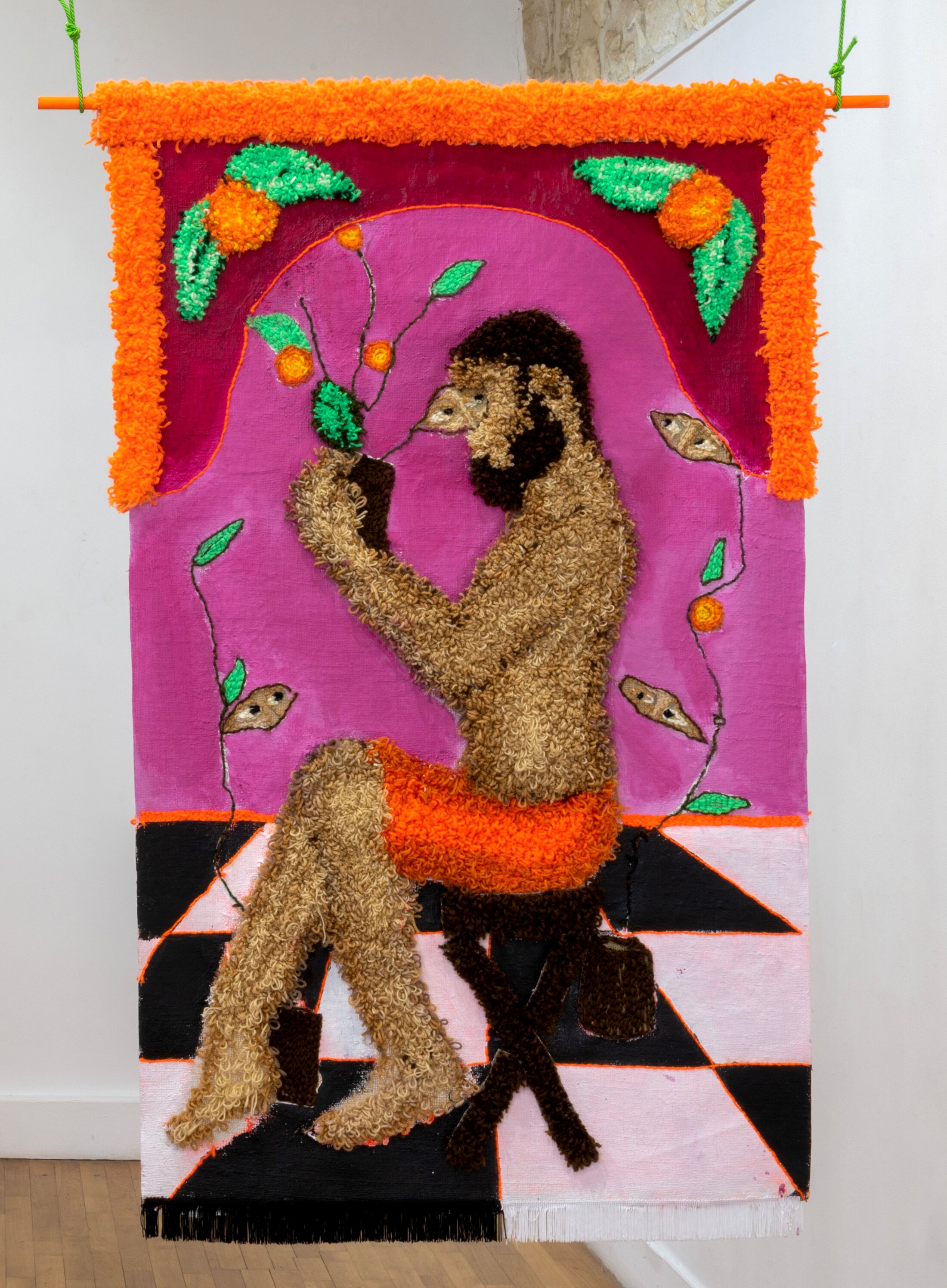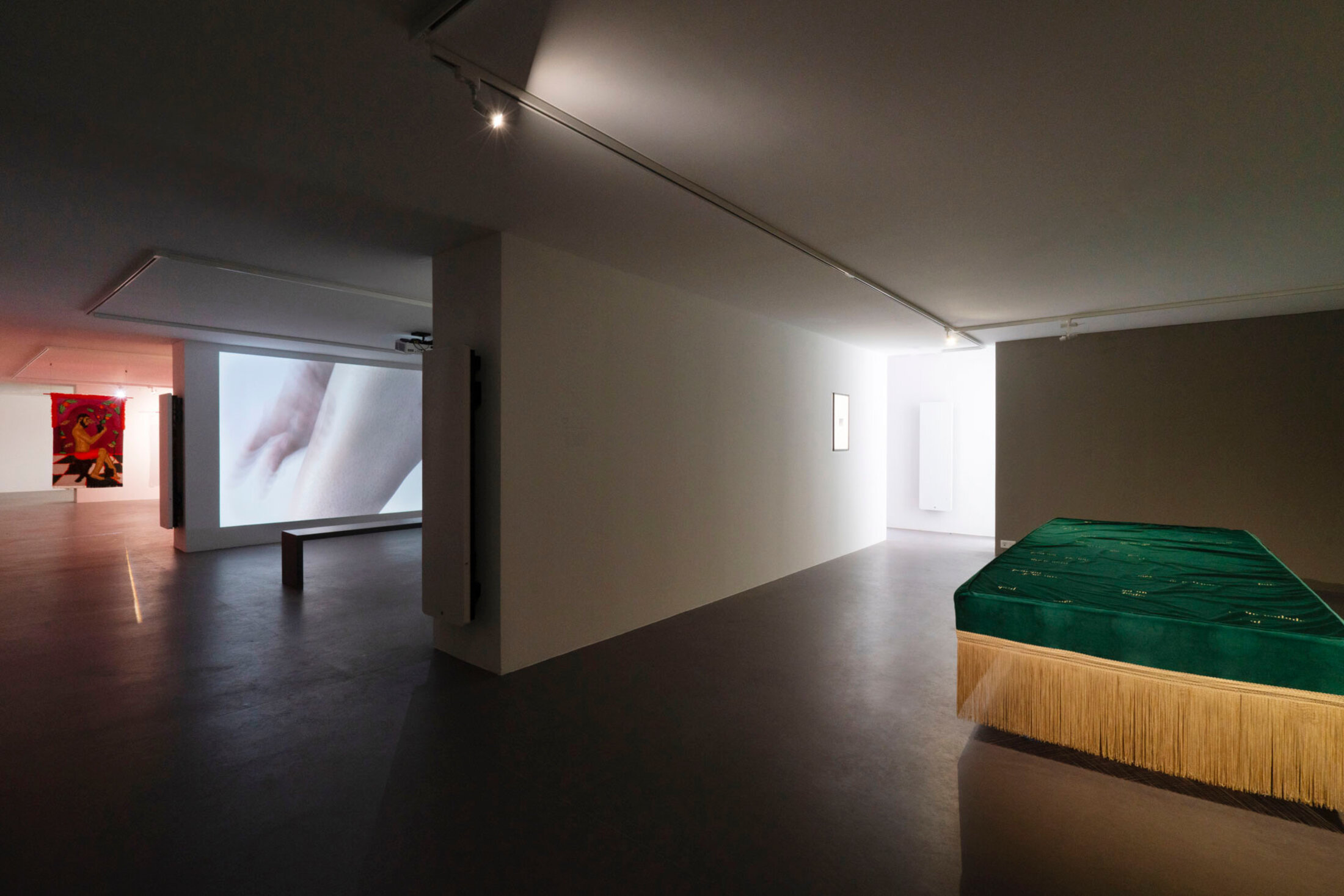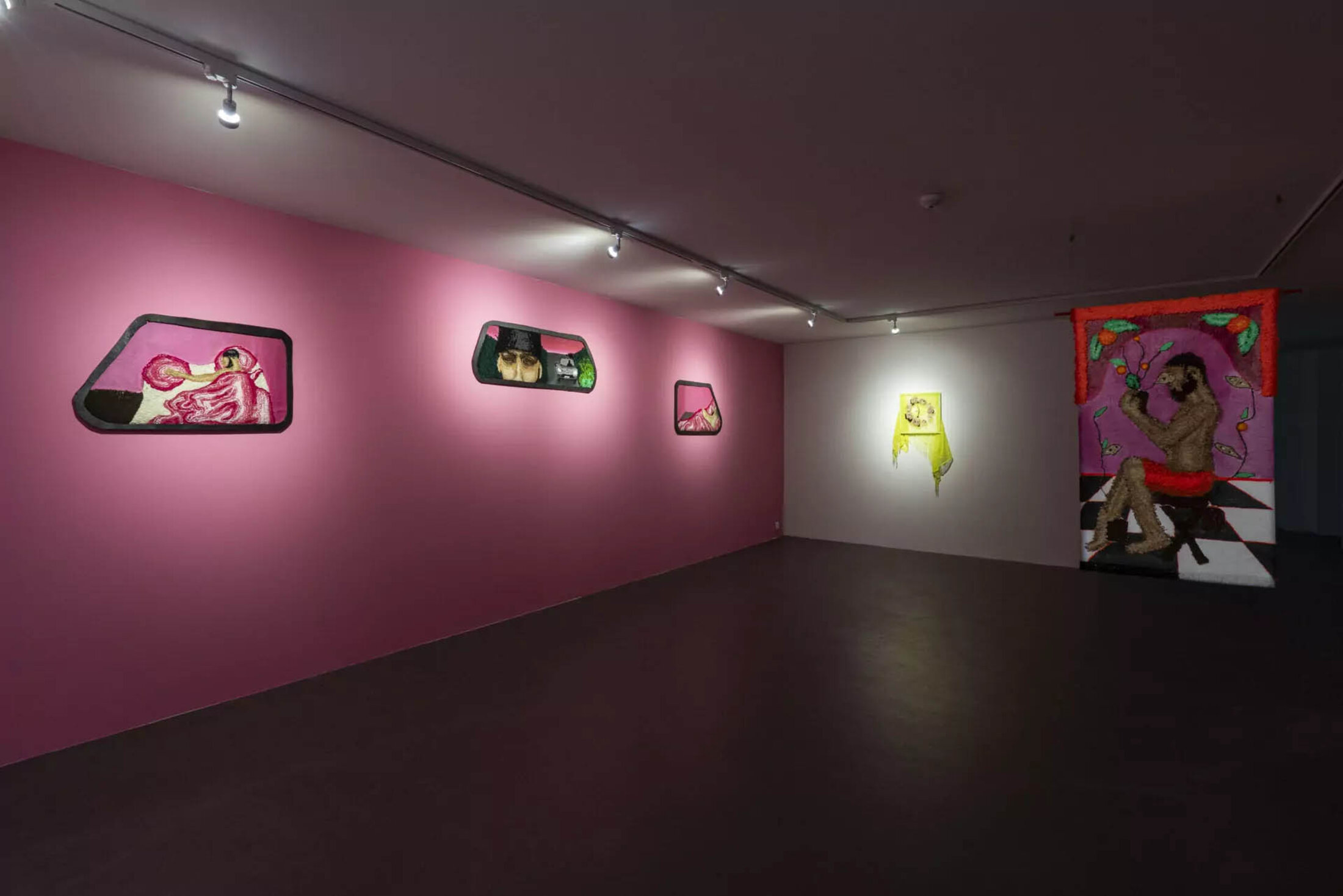 Deux vidéos montrent l’artiste Meryam Benbachir en train de faire disparaitre ses tatouages. Retirer ces éléments d’identification ou d’appartenance, est pour elle une façon de rendre visible « l’effacement qu’on s’inflige en entrant dans certains espaces » explique-t-elle. Sur le mur central, entre les deux vidéos, l’artiste présente un texte écrit spécialement pourn l’exposition mais dont elle ne conserve que la ponctuation, pour mieux créer un cadre à la récupération de son discours. « Mes mots, mes idées sont souvent récupérés, reformulés, utilisés dans d’autres espaces, par d’autres personnes, d’autres structures. Ici, je reconnais ce fait, je le rends visible – mais je garde un cadre[6] » indique l’artiste. « On peut imaginer ce que je dis, tenter de projeter des mots entre les signes de ponctuation, mais ce cadre-là, cette ponctuation, est fixe, inchangeable. Il crée une forme d’autorité, une manière de réempouvoirer le discours sans qu’il puisse être repris, vidé de son contexte ». Mehdi Görbüz, avec ses photographies aux tonalités saturées, apporte une dimension plus pop à l’exposition. Les couleurs vives et les compositions théâtrales contrastent avec la gravité des autres propositions, offrant un contrepoint bienvenu qui rappelle que l’affirmation identitaire peut aussi passer par la joie et l’autodérision.