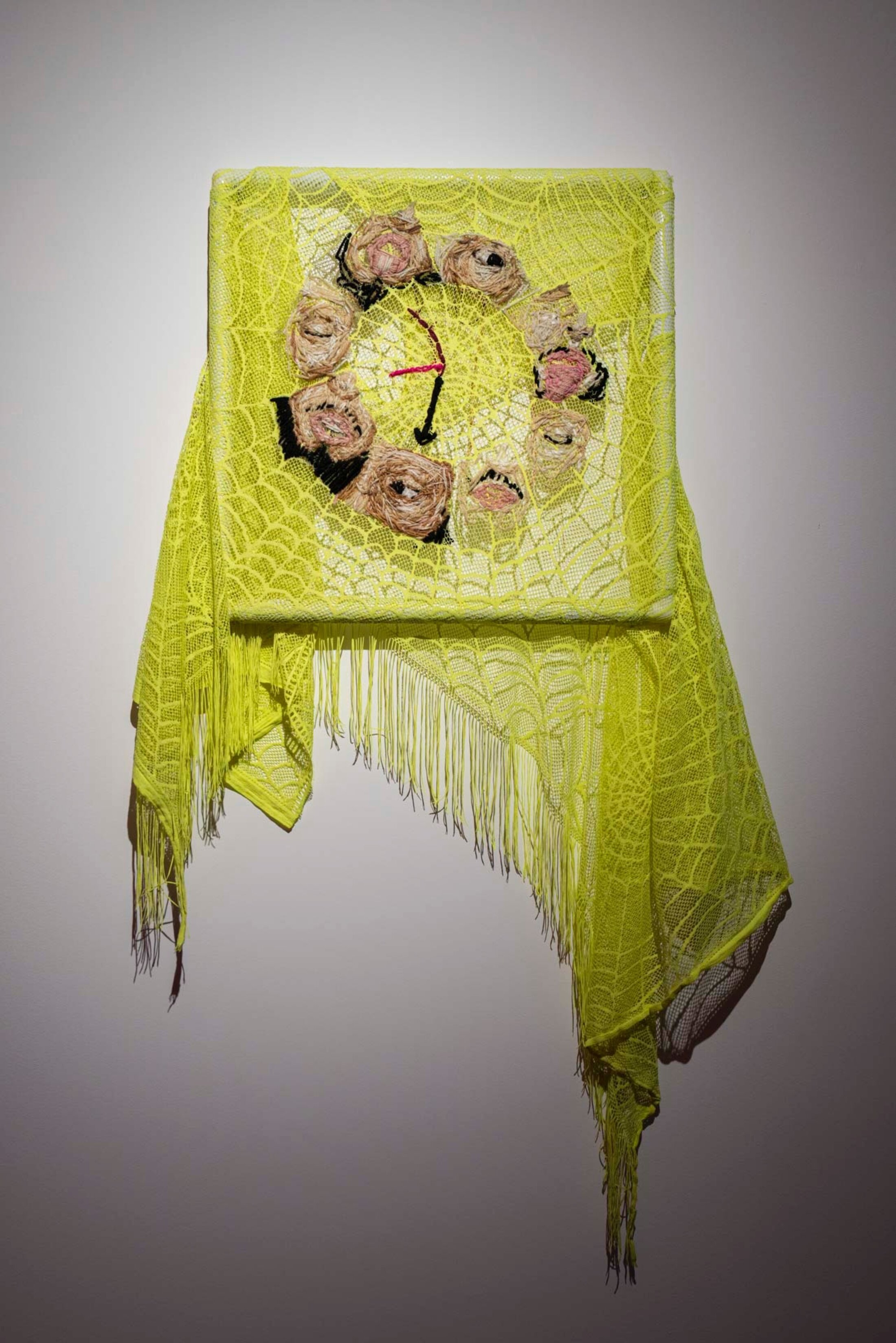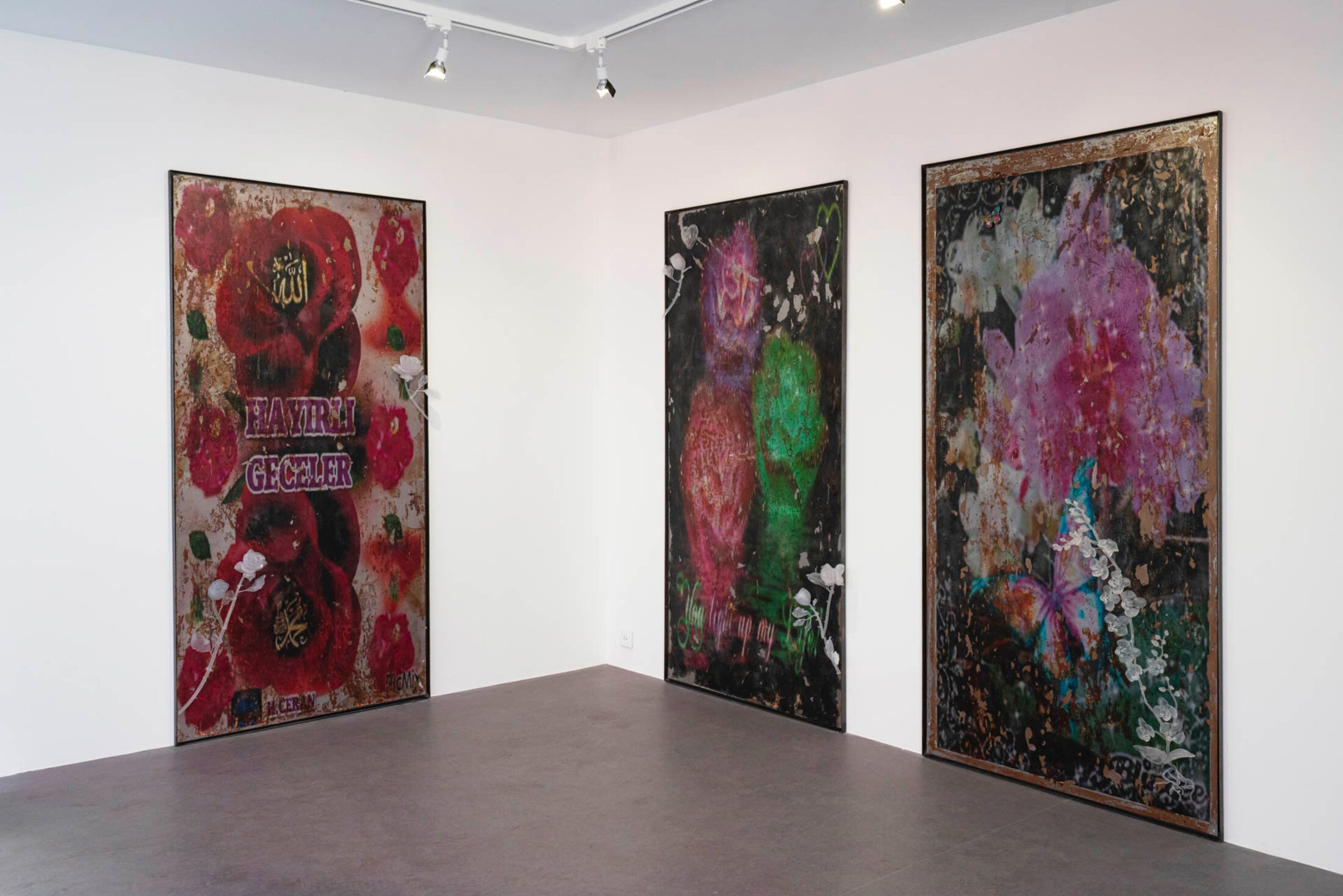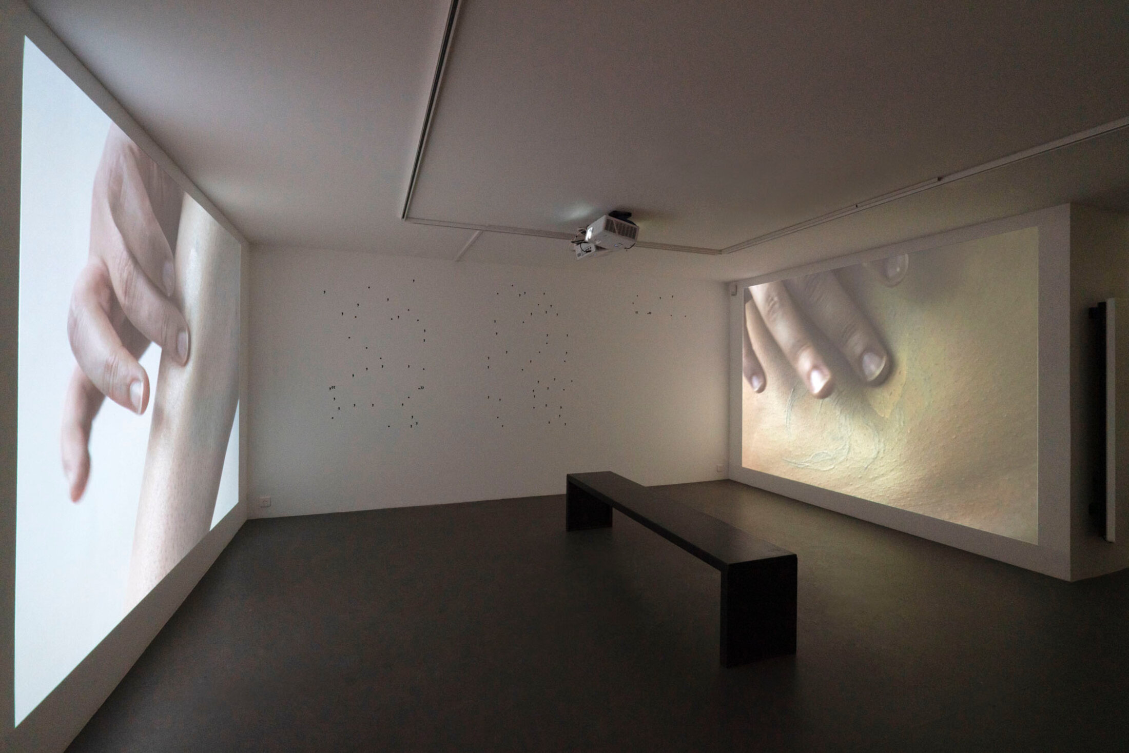 Deux vidéos montrent l’artiste Meryam Benbachir en train de faire disparaitre ses tatouages. Retirer ces éléments d’identification ou d’appartenance, est pour elle une façon de rendre visible « l’effacement qu’on s’inflige en entrant dans certains espaces » explique-t-elle. Sur le mur central, entre les deux vidéos, l’artiste présente un texte écrit spécialement pourn l’exposition mais dont elle ne conserve que la ponctuation, pour mieux créer un cadre à la récupération de son discours. « Mes mots, mes idées sont souvent récupérés, reformulés, utilisés dans d’autres espaces, par d’autres personnes, d’autres structures. Ici, je reconnais ce fait, je le rends visible – mais je garde un cadre[6] » indique l’artiste. « On peut imaginer ce que je dis, tenter de projeter des mots entre les signes de ponctuation, mais ce cadre-là, cette ponctuation, est fixe, inchangeable. Il crée une forme d’autorité, une manière de réempouvoirer le discours sans qu’il puisse être repris, vidé de son contexte ». Mehdi Görbüz, avec ses photographies aux tonalités saturées, apporte une dimension plus pop à l’exposition. Les couleurs vives et les compositions théâtrales contrastent avec la gravité des autres propositions, offrant un contrepoint bienvenu qui rappelle que l’affirmation identitaire peut aussi passer par la joie et l’autodérision.