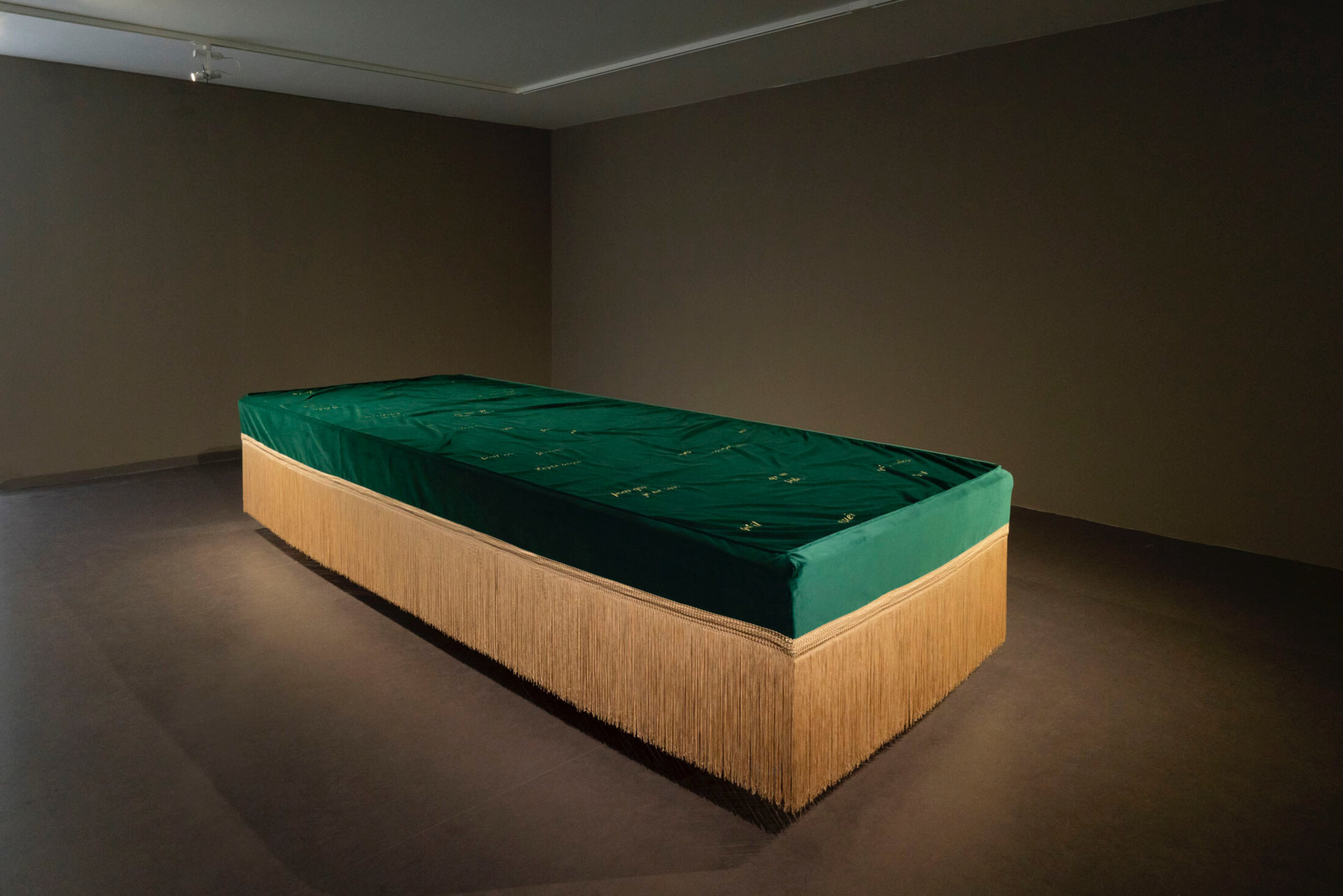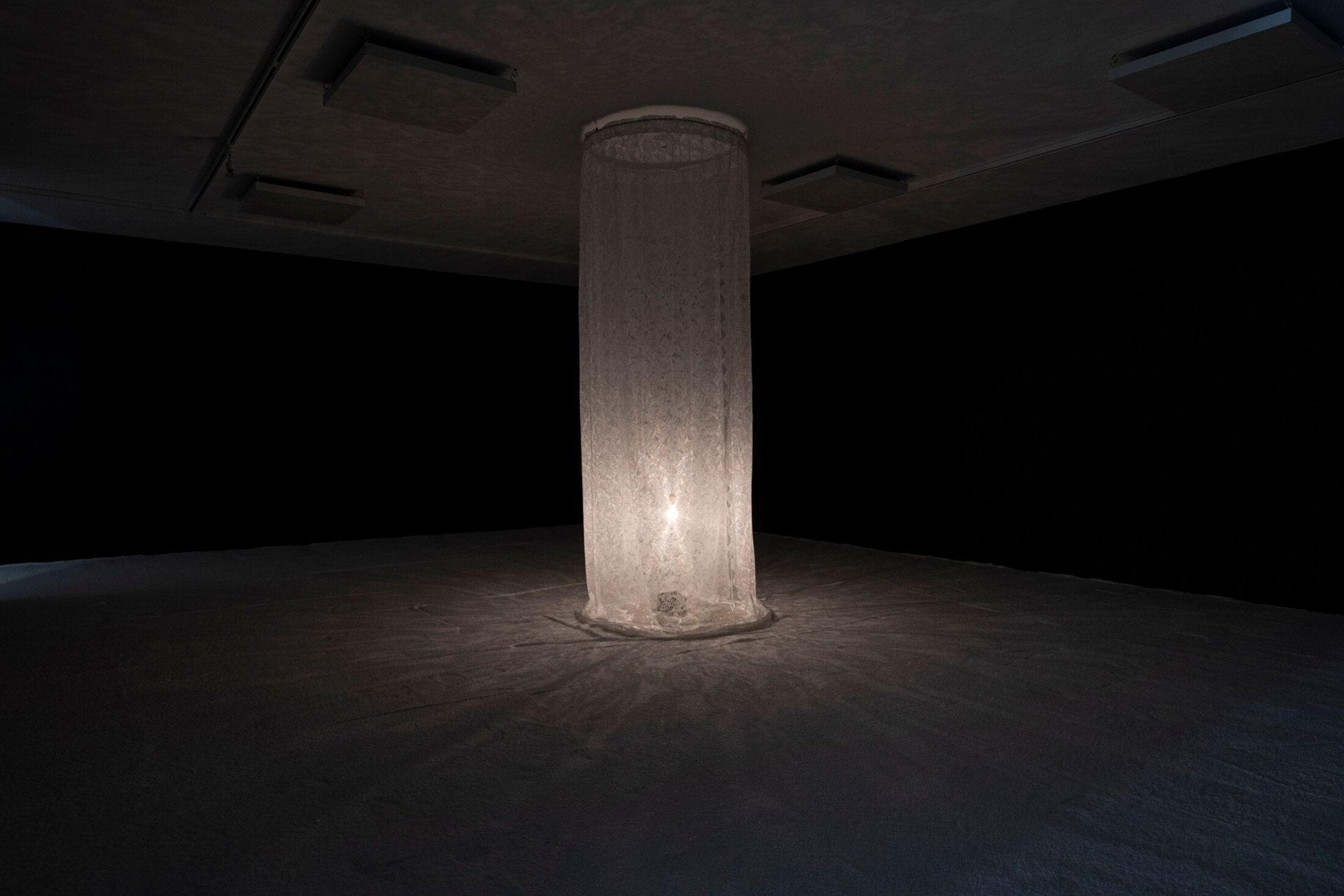 Dans son « Jardin des aveugles » (2022), Amine Habki incarne cette ambivalence avec une maîtrise remarquable. Ses tentures de lin et de soie, suspendues dans l’espace, créent des jeux de lumière et d’ombre qui évoquent à la fois la fragilité et la résilience. L’artiste développe une forme d’autoreprésentation pour mieux déjouer « les attentes liées aux représentations des masculinités dites subalternes[5] », construisant ainsi un contre-discours politique. Cette œuvre, d’une grande délicatesse, explore les tabous liés à l’intimité queer dans un cadre culturel où la pudeur et la spiritualité occupent une place centrale. Amine Habki ne cherche pas à trancher, mais à ouvrir un espace de coexistence, dans lequel le désir et la foi peuvent s’entrelacer sans se nier. De son côté, l’artiste franco-libanais Reda El Toufaili Kanaan explore l’amour familial à travers des installations textiles composées de rideaux de tulle, légers, presque éthérés. L’œuvre de Kanaan, empreinte d’une gravité contenue, touche par sa capacité à rendre palpable l’épaisseur des silences, tout en célébrant la beauté des liens qui persistent malgré les interdits. L’artiste présente ici une installation immersive à la grande puissance poétique, s’articulant autour d’un sol recouvert de sel, de moules à gâteaux en béton et d’une lumière activée par les vibrations sonores des pas des visiteurs. Inspirée des souvenirs de cuisine partagés avec sa mère, l’installation invite à transgresser l’interdit en foulant le sel, symbole de tabou et de sacré. La lumière, élément central, réagit au mouvement, créant un dialogue intime entre le visiteur et l’espace. Comme le note l’artiste, cette lumière « permet de voir l’ensemble de l’œuvre » tout en incarnant une quête de sacré et d’émancipation. L’œuvre, dans laquelle le corps, la mémoire et l’héritage culturel s’entrelacent dans un geste à la fois fragile et subversif, offre un espace de négociation entre visibilité et opacité, entre racines libanaises et identité queer.