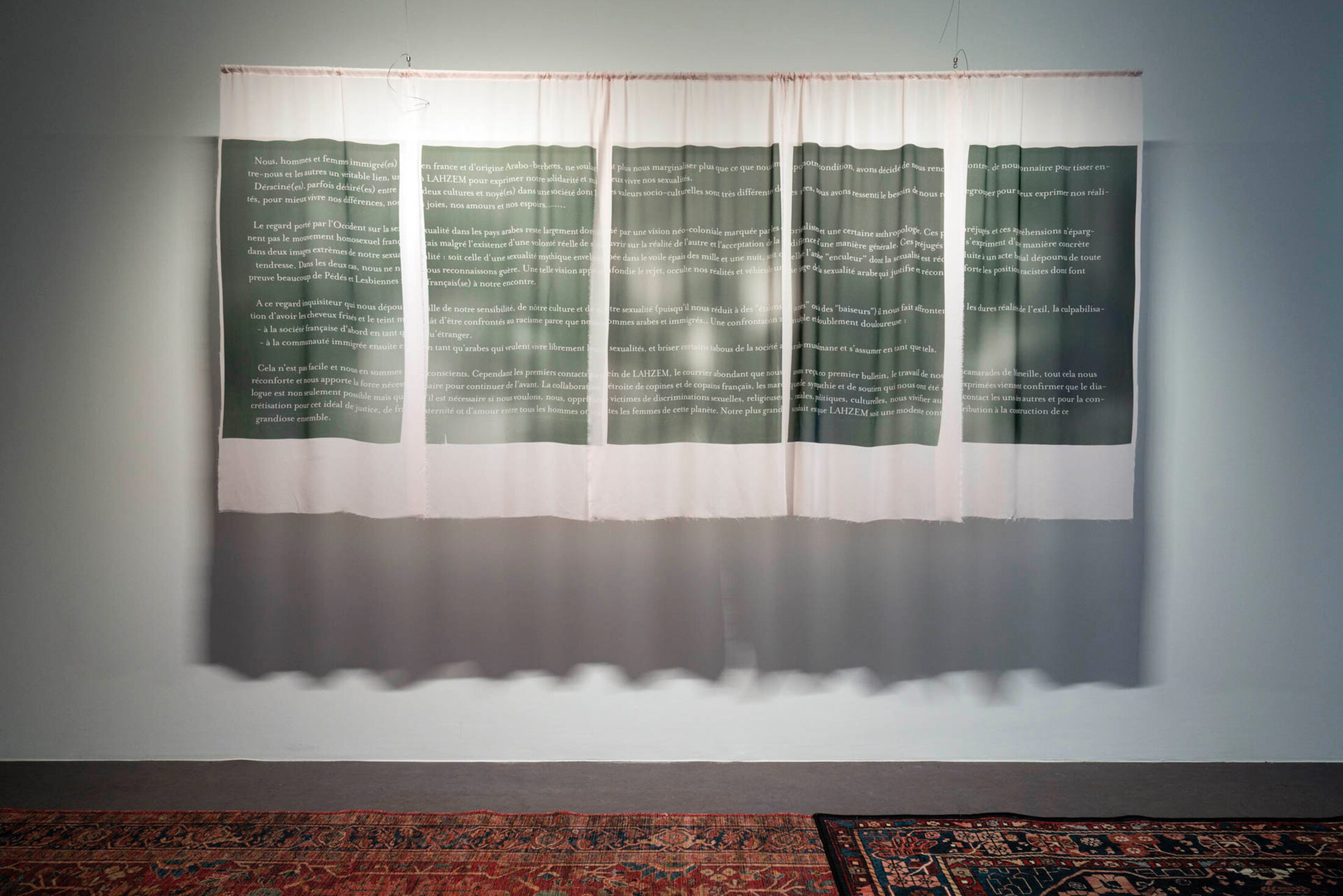 « La rhétorique du rideau » a pour point de départ une journée d’exposition sauvage dans le cadre du programme Thundercage[2], sur les bords du canal d’Aubervilliers en octobre 2024. Inès Geoffroy, invitée à concevoir la 41ème édition, sollicite plusieurs artistes parmi lesquels ceux présents ici. « Ensemble, nous avons cherché à faire émerger ce qui nous unit : le fait d’évoluer entre des cultures musulmanes et des identités en marge des normes dominantes[3] » explique-t-elle. « Pendant quelques heures, artistes et public ont fait communauté, entouré.es d’œuvres, de livres, de lectures et de performances. Cette journée pluvieuse, vécue comme un moment de cohésion et de joie militante, a réchauffé les cœurs et créé le désir de porter ses voix plus loin dans le monde de l’art ». À la manière d’un prélude, la première salle de l’exposition revient sur cet acte fondateur. Des archives photographiques, littéraires et sonores, soigneusement sélectionnées, dialoguent avec l’œuvre « Got To Be Real » de Sido Lansari, présentée pour la première fois lors du Thundercage d’octobre 2024. Quatre tissus mousselines reproduisent des extraits du premier et unique numéro du bulletin du « Groupe homosexuel arabo-berbère » publié en février 1983. Ignoré jusque-là des historiens et militants queer, il est retrouvé par Lansari dans un fonds d’archives LGBTQI+ en France. Le document précise la démarche, les motivations et les revendications de ces personnes d’origine arabe et nord-africaine au sein des communautés homosexuelles en France. « C’est cette parole prise il y a quarante ans que l’œuvre vient montrer, donnant accès à différentes lectures, tant ces voix s’adressent à la fois à des intellectuel·le·s et à des personnes issues des classes populaires, tout en s’enracinant dans une tradition rurale maghrébine[4] » précise Sido Lansari. Ce prélude compose une puissante entrée en matière qui pose les jalons d’une réflexion sur la mémoire comme acte de résistance.
