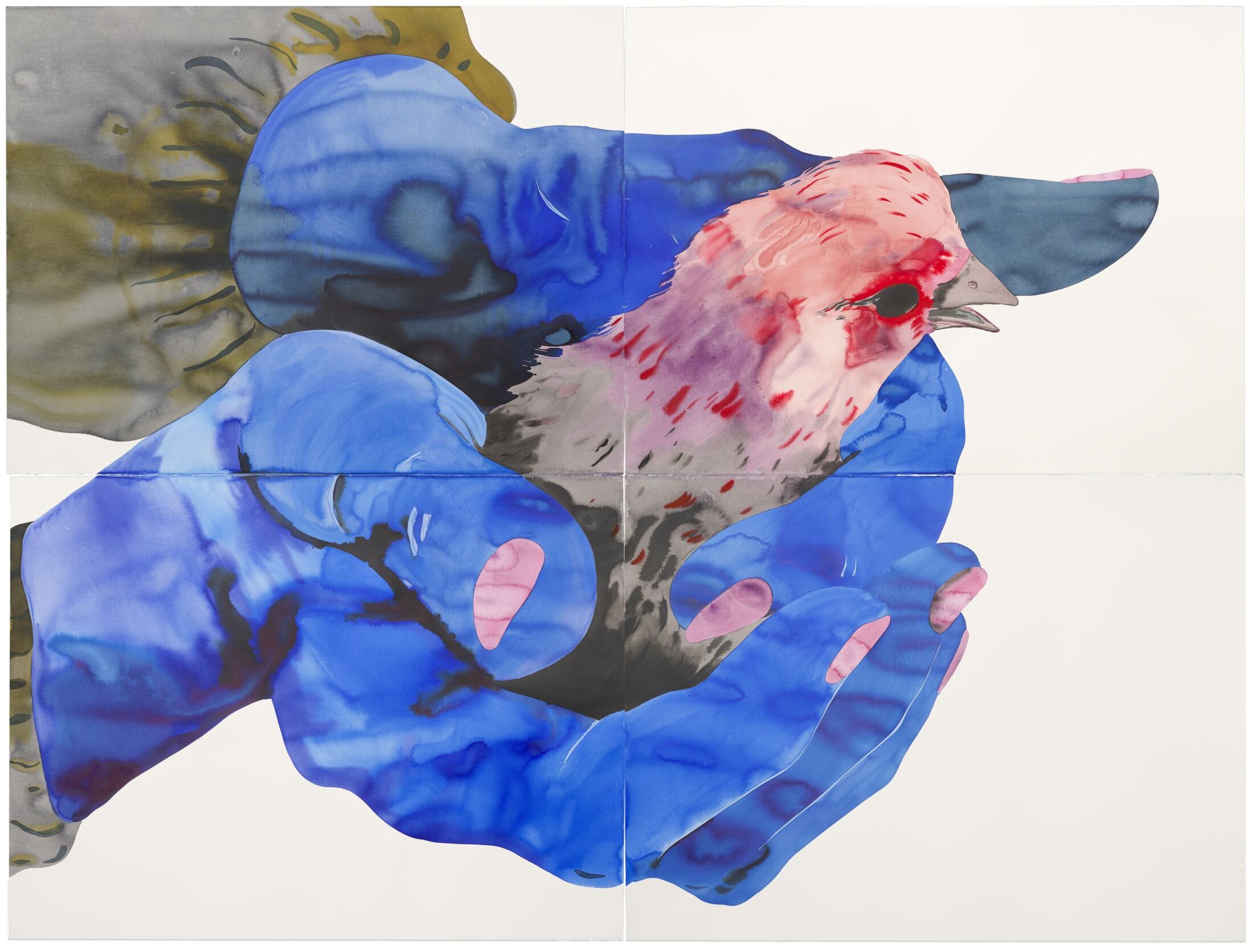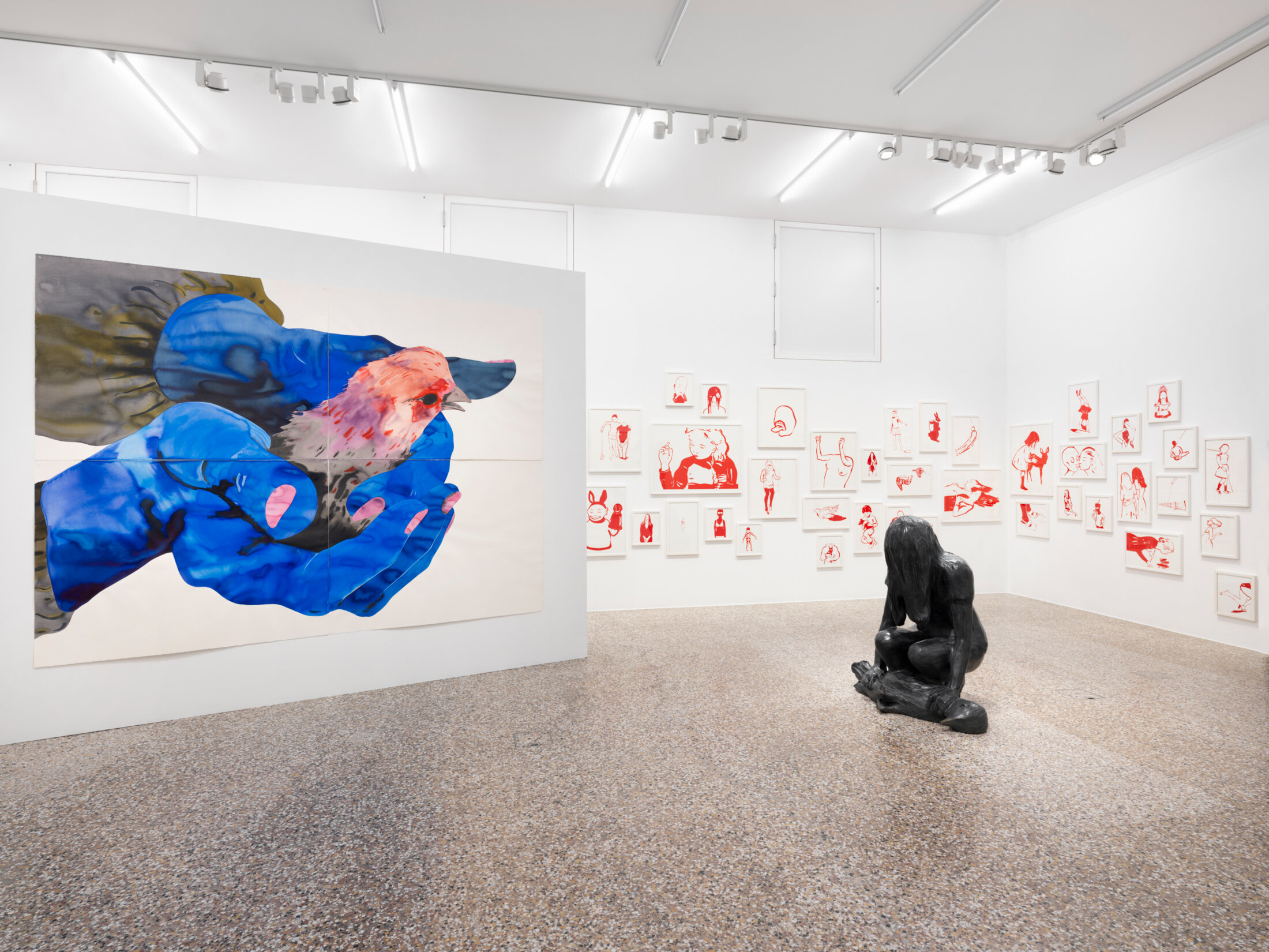 L’unique sculpture exposée, « Dans mes mains » (2023), apporte une matérialité contrastante. Une jeune femme, accroupie, tient un oiseau démesurément grand, presque aussi imposant qu’un enfant. La posture, à la fois protectrice et vulnérable, évoque une intimité bouleversante, comme si la figure cherchait à retenir quelque chose qui lui échappe. L’oiseau, symbole récurrent chez l’artiste, incarne ici la fugacité de la vie, une présence prête à s’envoler ou déjà perdue. L’œuvre, à la fois belle et déchirante, incarne l’absence absolue, celle de la mort, du lien rompu. Elle fait écho aux Pietà classiques, revisitées avec une sobriété contemporaine qui refuse le pathos. Le choix du bronze, matériau noble et pérenne, contraste avec l’éphémère suggéré par le sujet, créant une dialectique entre permanence et disparition. Faisant face la sculpture, un immense lavis, exécuté sur quatre feuilles, montre un oiseau tenu par deux mains en gros plan. Portant un titre éponyme, « Dans mes mains » (2023) surprend par son format monumental. Figure récurrente dans l’œuvre de l’artiste, l’oiseau est représenté entre la vie et la mort. Il incarne ici une forme de fragilité.