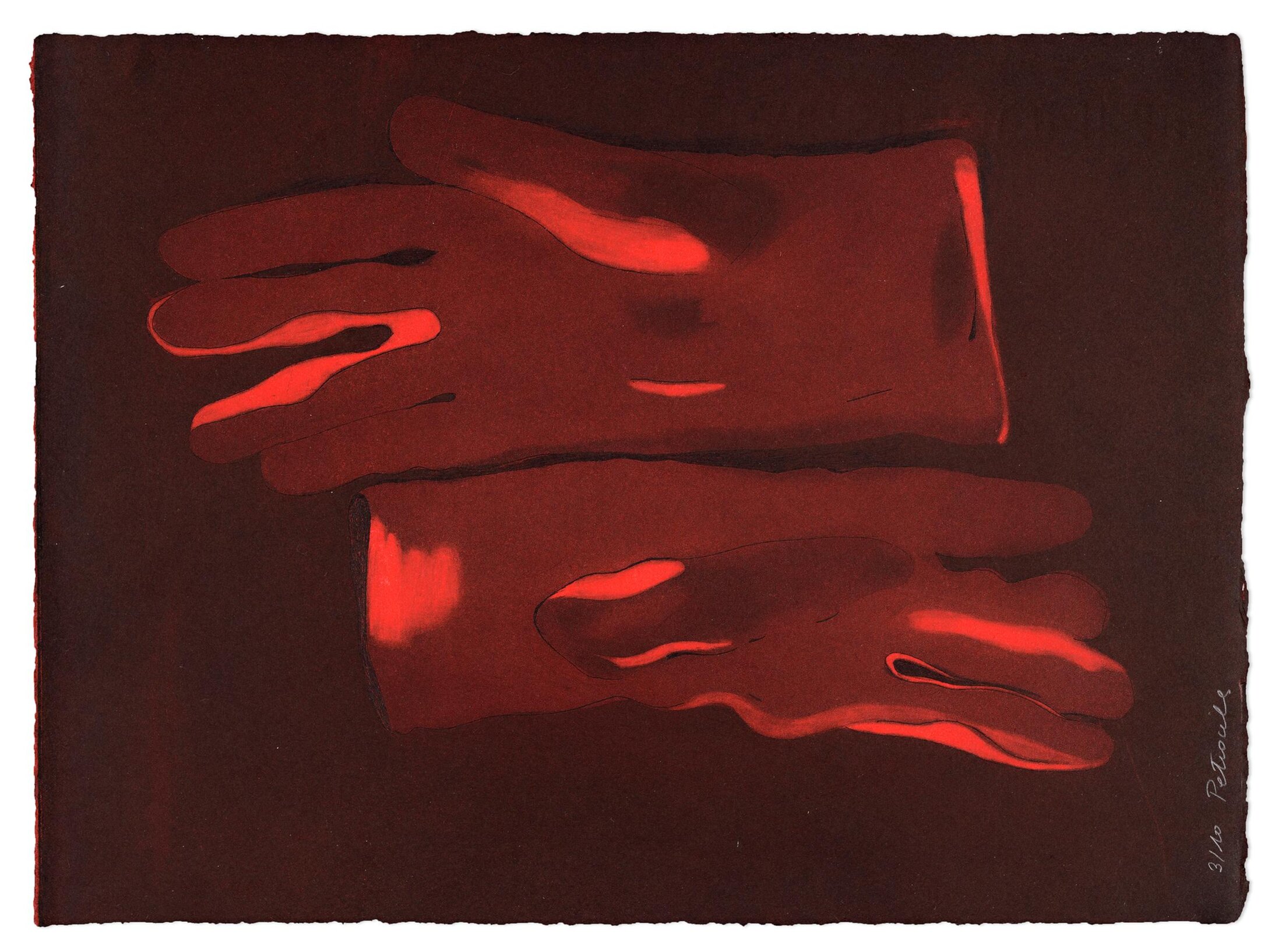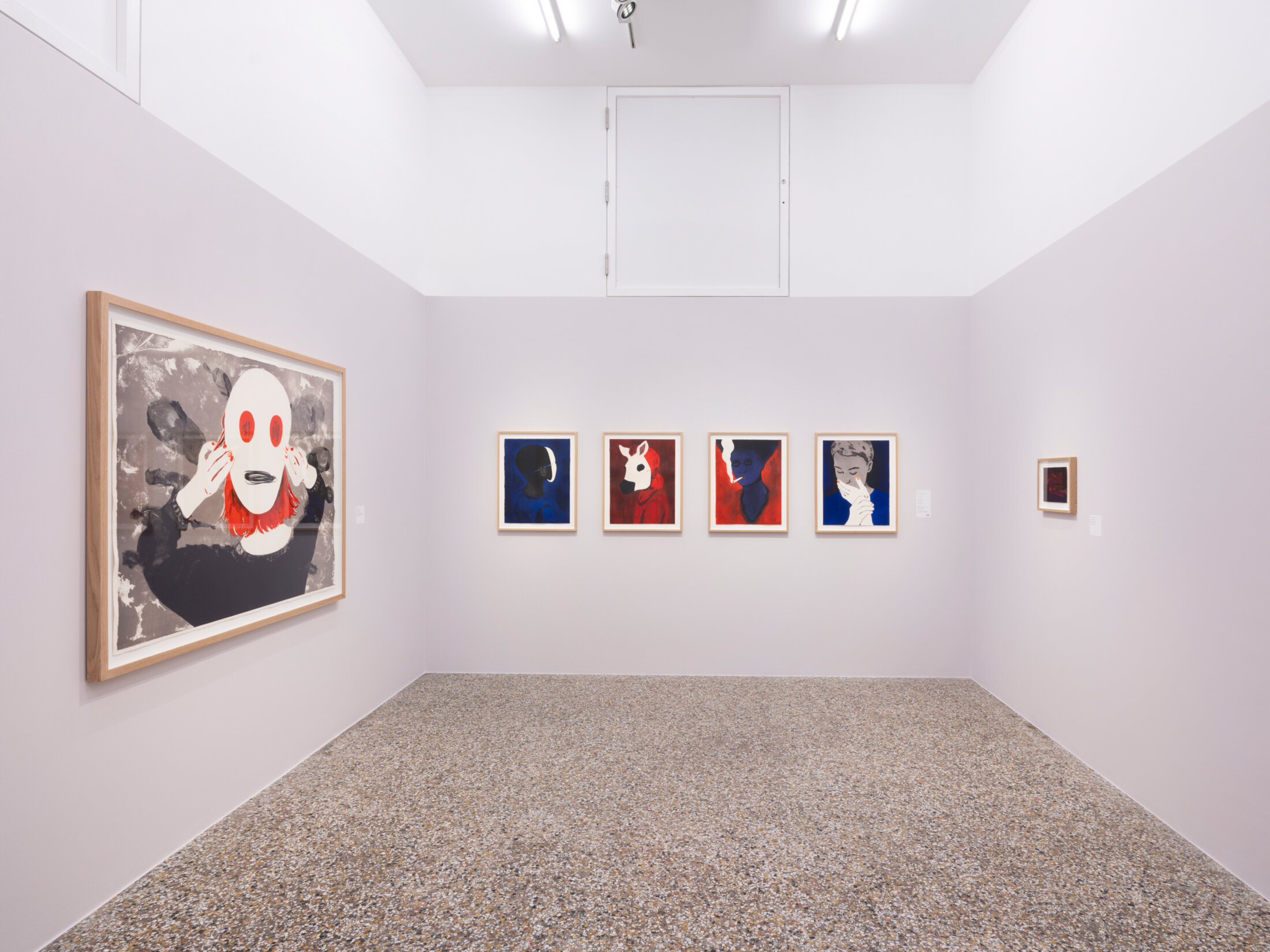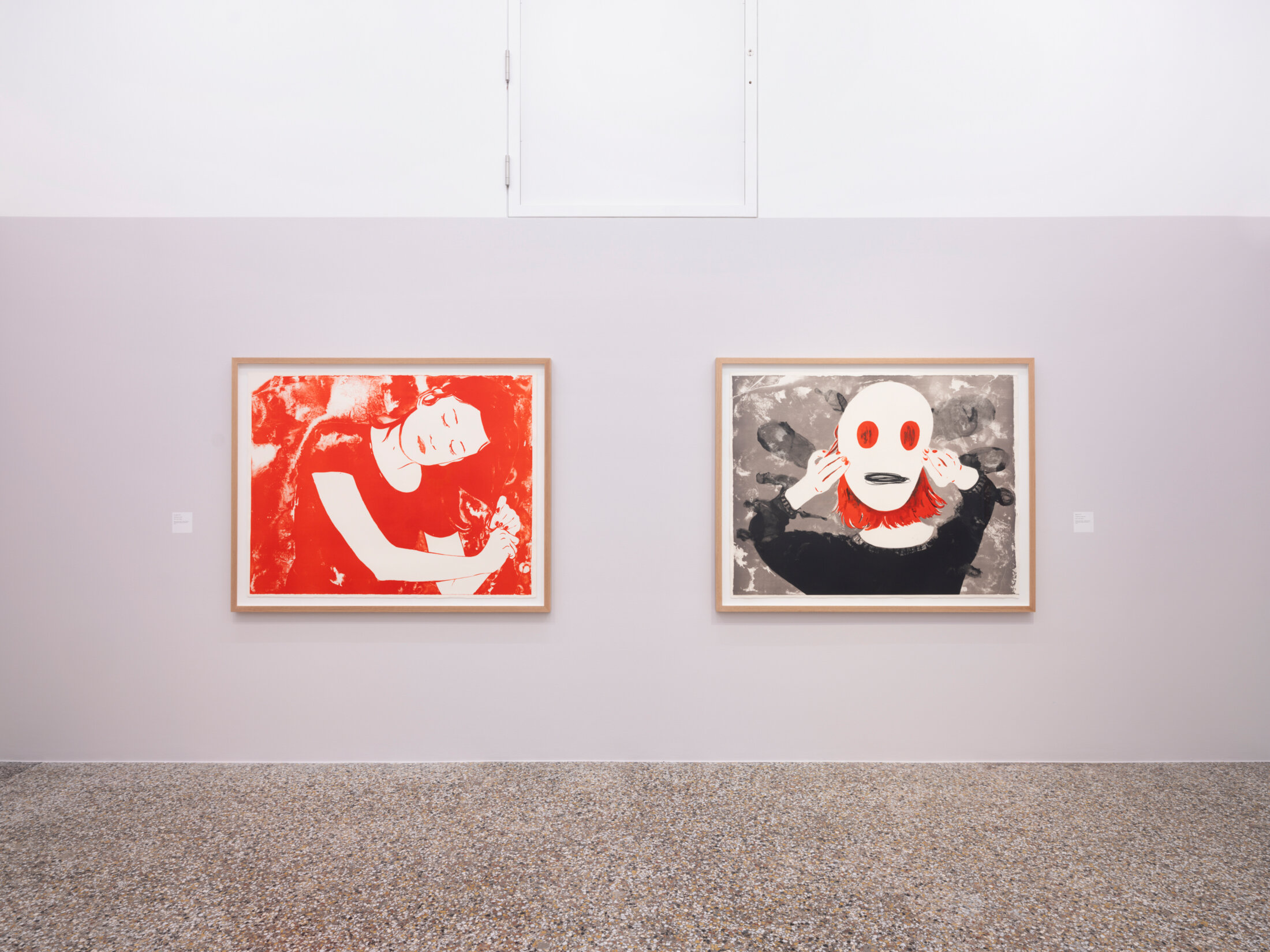 Les estampes, notamment la série « Rougir » (2005-2015), exposée ici dans son intégralité et qui illustre la dimension ludique[3] dans son travail, témoignent d’une maîtrise graphique qui transcende la simple virtuosité. Le pourpre, vibrant sur fond blanc, crée une tension dramatique, comme si chaque figure, qu’elle soit adolescente, animale, ou hybride, était sur le point de s’effacer. On y décèle une narration fragmentée, où l’absence n’est pas seulement thématique mais constitutive de l’œuvre. Ainsi, le blanc du papier, laissé en réserve, devient un acteur à part entière, un silence qui hurle. Cette dialectique entre présence et effacement rappelle les réflexions de l’artiste sur le gant, qu’elle décrit comme une « dépouille » une fois retiré, une métaphore saisissante de la trace laissée par ce qui n’est plus. L’absence est envisagée comme un état auréolé de désir, de projection et de silence, dans des estampes aux couleurs vives nécessitant l’emploi de plusieurs matrices, à l’image de « Masque » (2017). Une très grande lithographie en rouge de la série « Se coiffer » (2018), montrant une jeune fille qui étire ses cheveux, les yeux fermés, dans un cadrage serré à mi-corps, illustre l’impression d’absence à travers le songe.
