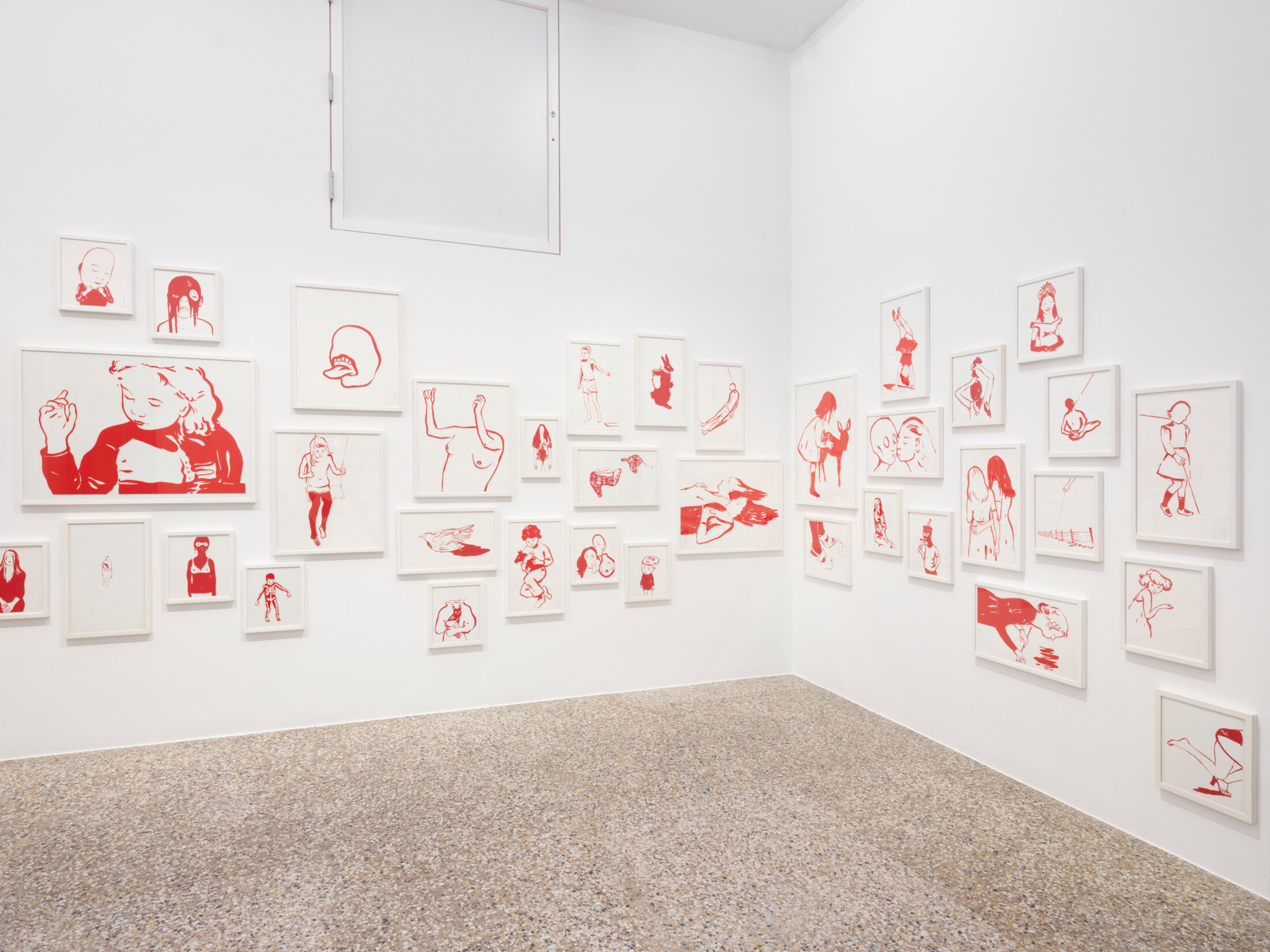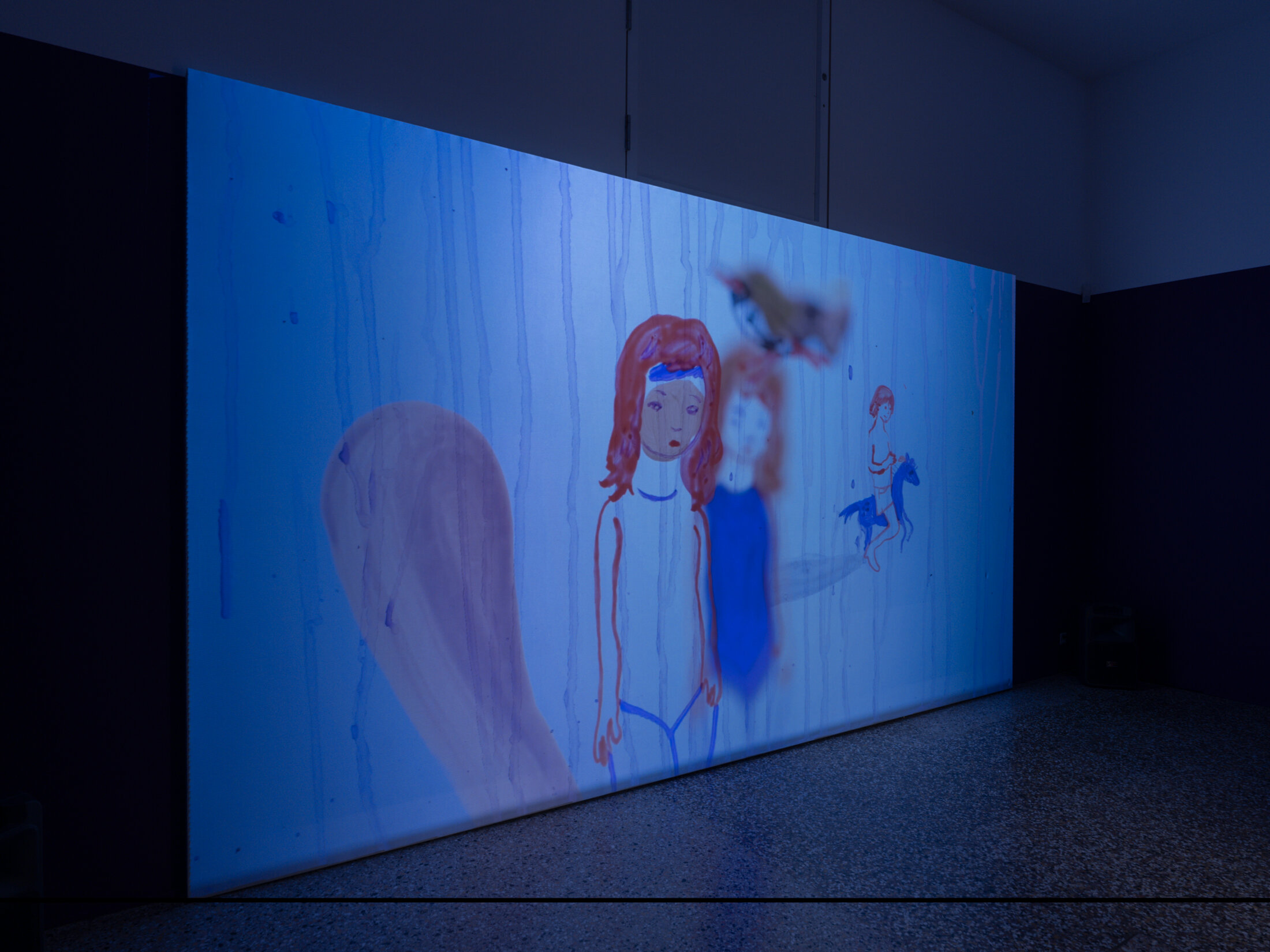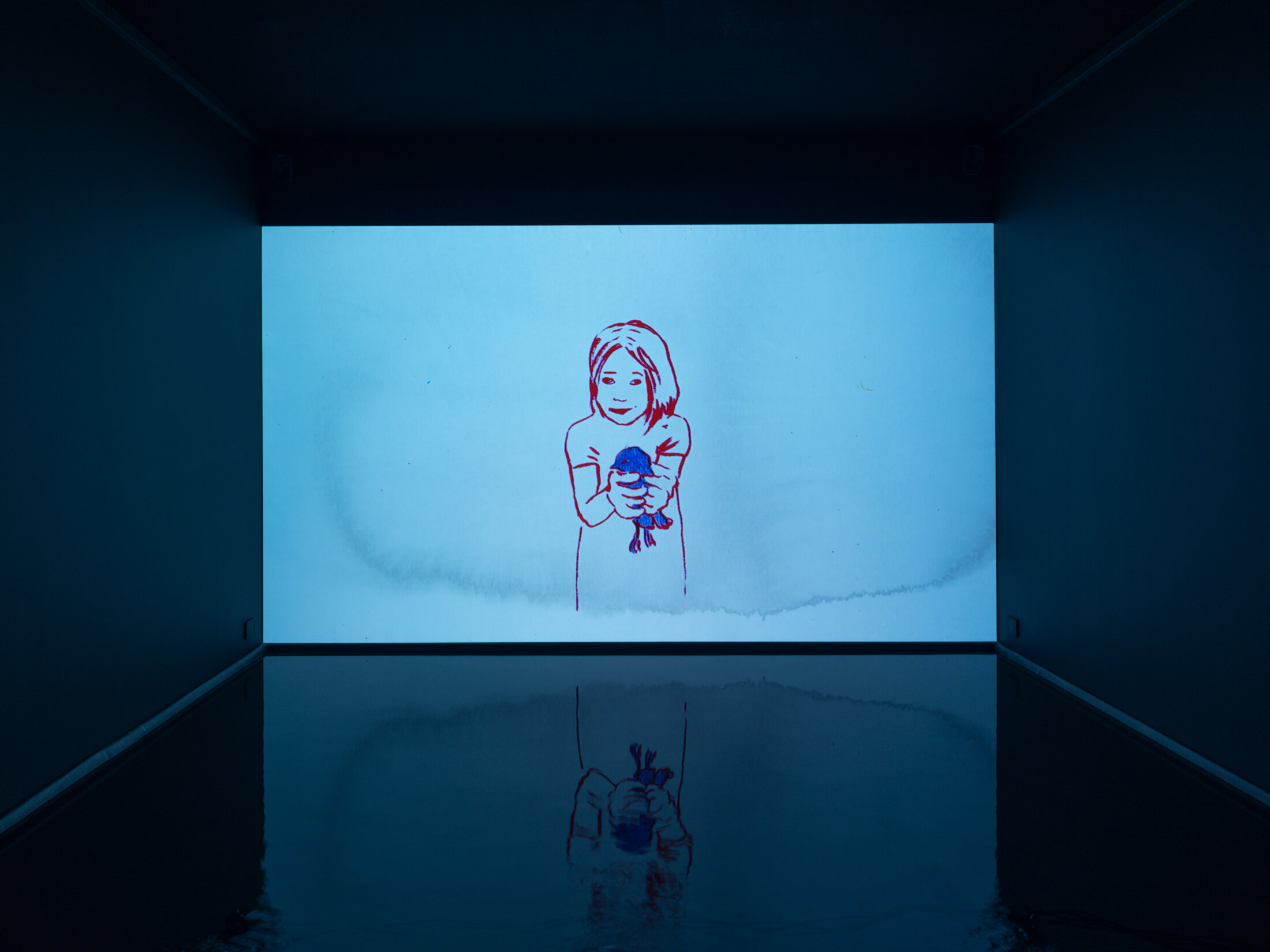 S’inscrivant dans la pluridisciplinarité de l’artiste, deux installations vidéo prolongent cette exploration de l’évanescence. Présentées dans des espaces dédiés au sein du parcours, elles se distinguent des œuvres graphiques par leur temporalité et leur caractère immersif. Toutes deux reprennent les motifs chers à l’artiste – on y retrouve ainsi des figures adolescentes, des animaux hybrides, des gestes suspendus –, tout en explorant l’absence à travers le mouvement et la dissolution de l’image. Dans « Échos », réalisée en collaboration avec son mari, le photographe et réalisateur Hervé Plumet, des dizaines de dessins mis bout à bout se reflètent dans un bassin d’eau, évoquant un dessin animé en apesanteur, où les figures semblent flotter dans un temps suspendu. L’œuvre matérialise l’absence comme processus. Les figures, jamais pleinement stables, incarnent un état de transition : elles apparaissent pour mieux s’effacer, comme des souvenirs ou des apparitions spectrales. L’eau, en tant que surface réfléchissante, amplifie cette sensation en fragmentant l’image et en impliquant le spectateur, dont le reflet peut se mêler à la projection. Dans cette mise en abime, il devient partie prenante de l’absence, confronté à sa propre image fugitive dans le flux visuel. La seconde vidéo, « Papillon » (réalisée avec Hervé Plumet, 2022), s’intègre dans une salle où elle cohabite avec des œuvres sur papier, donnant à voir une succession d’images animées, dans un style proche des esquisses de l’artiste – des figures adolescentes, des gestes isolés (une main tenant un objet, un visage en profil). Contrairement à la première installation, celle-ci privilégie une narration fragmentée, dans laquelle les séquences s’enchaînent sans logique apparente, comme des bribes de mémoire ou des instantanés d’un monde onirique. Cette approche subtile fait de l’absence une question de discontinuité. Les figures, souvent isolées dans le cadre, semblent flotter dans un vide narratif, refusant toute résolution ou complétude. Cette fragmentation rappelle les estampes de la série « Rougir », où le blanc du papier structure l’œuvre autant que les traits encrés.