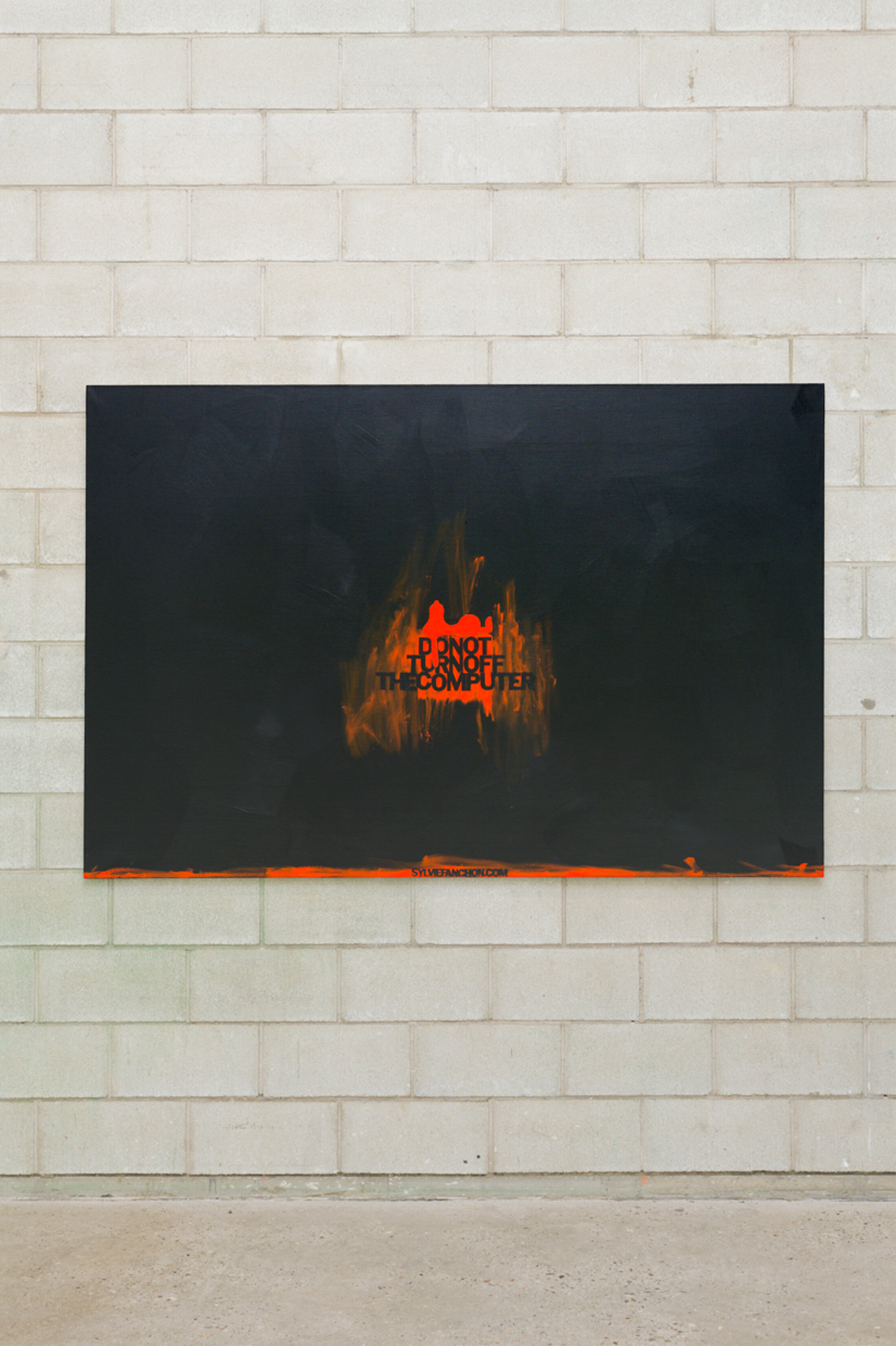 C’est aussi pour elle un hommage ironique à l’art conceptuel qu’elle envisage comme une utopie, précisant que « dans l’abstraction il faut ramener du réel et le réel c'est la forme[5] ». Elle citait volontiers la phrase attribuée à Victor Hugo : « La forme c'est le fond qui remonte ». Le contenu reproduit sur les vitres de Bétonsalon est celui des phrases prononcées par Cortana, interface numérique générée par l’intelligence artificielle de nos smartphones, « assistante de productivité personnelle » censée nous faire gagner du temps en s’occupant de tout de « manière proactive » mais qui s’avère vite envahissante. Sylvie Fanchon entretenait une relation compliquée avec la voix de son téléphone portable au point d’en faire un sujet récurrent de ses peintures récentes – l’artiste avait l’habitude de puiser ses sujets dans son environnement immédiat. L’intelligence est encore trop artificielle, et les propos tenus se confondent avec un flot de paroles dont Cortana ne comprend pas le sens. Il ne peut donc y avoir ni dialogue, ni échange. En inscrivant la phrase sur la façade vitrée du centre d’art, celui-ci se transforme en porte-parole des services énoncés à la première personne.