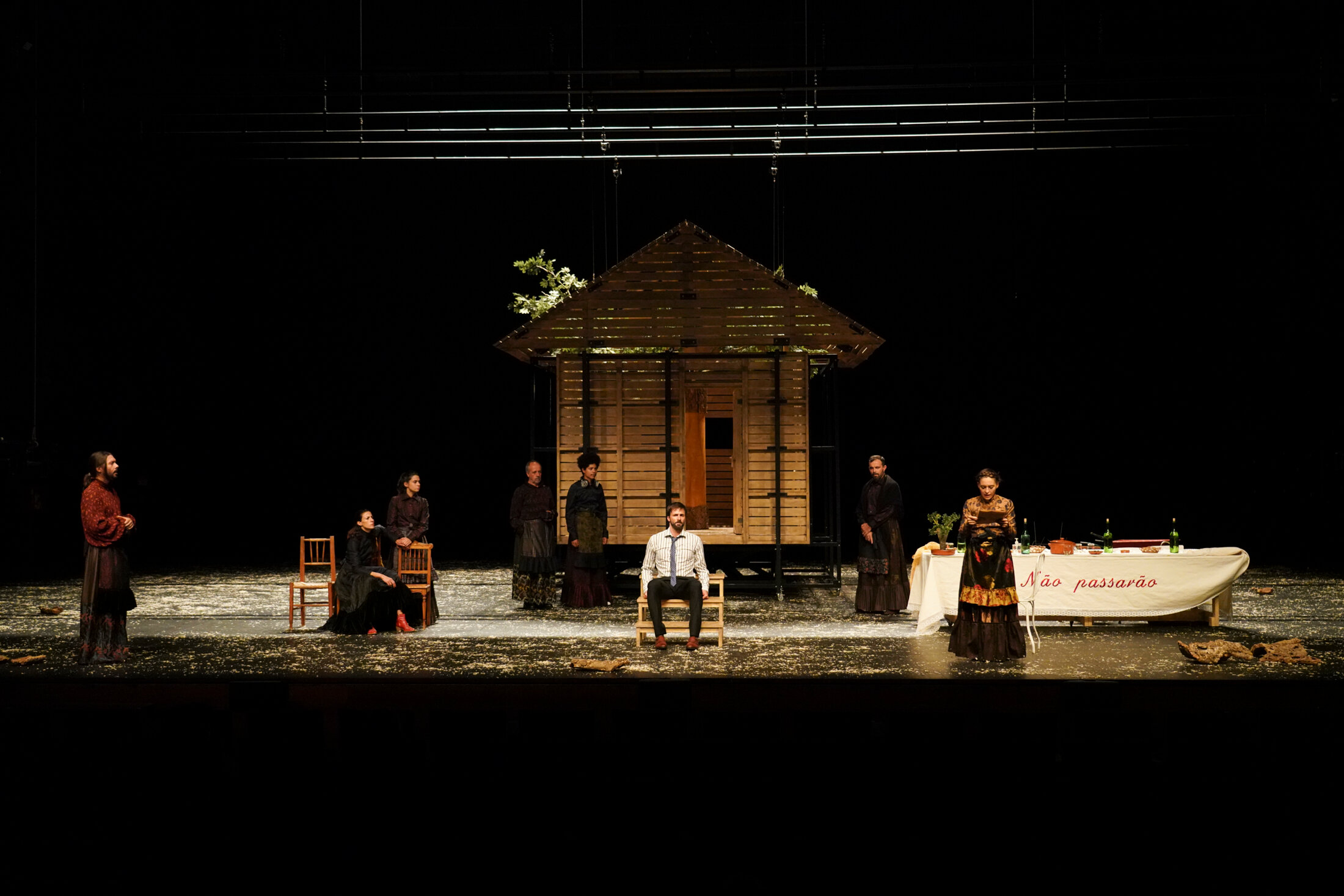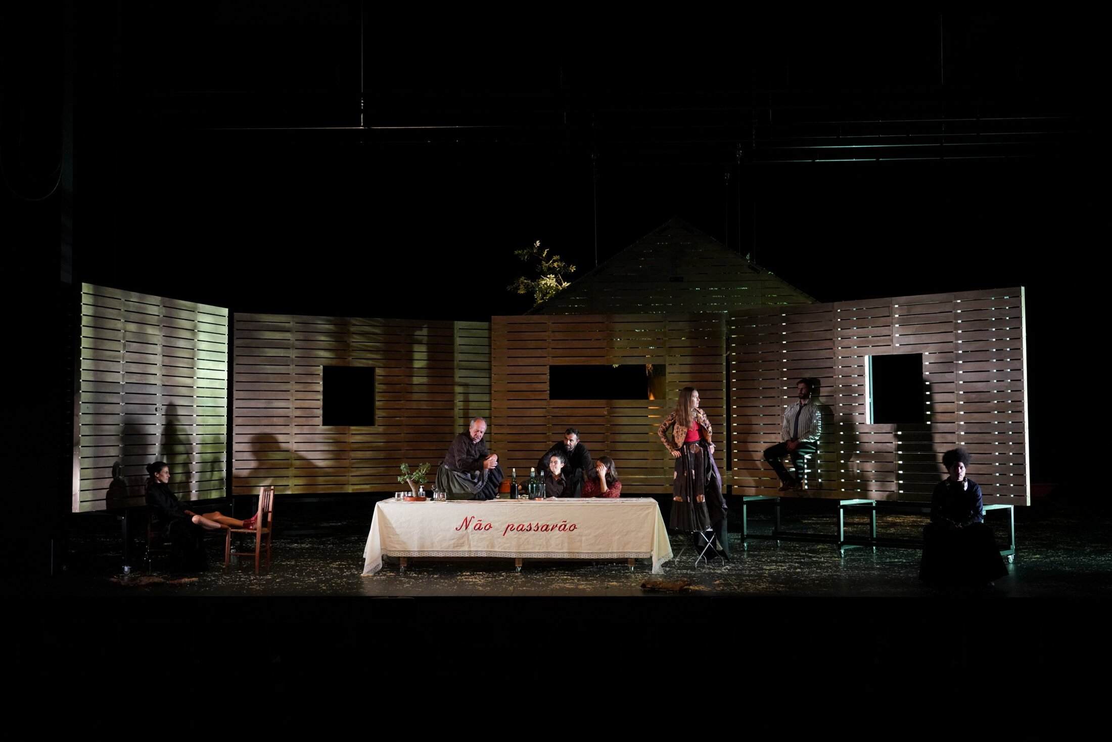 Devant une maison rurale entourée de chênes-lièges près du village de Baleizão dans le sud du Portugal, une grande table est déjà dressée. Brodés sur la nappe blanche qui la recouvre, deux mots de très grande taille : « não passarão[1] » (« ils ne passeront pas ») s’affichent face aux spectateurs et annoncent d’emblée la position de résistants antifascistes des hôtes. Au menu de cette réunion de famille pas comme les autres, de traditionnels pieds de porc marinés. « Tous les ans nous nous retrouvions ici[2]» explique Marco[3] à l’adresse du public. Il parle d’incendies, de « toute la beauté des flammes », soupire que « les gens passent leur vie à éteindre des feux » mais, une fois par an, ce sont eux les pyromanes. La maison a été celle de la matriarche qui a instauré ce rendez-vous familial annuel, désormais traditionnel, en tuant il y a soixante-dix ans son premier fasciste, qui n’était autre que son mari. Le 19 mai 1954, alors que le pays est dirigé d’une main de fer par Salazar – l’un des plus longs régimes autoritaires dans l’Europe du XXème siècle (1933-1974) –, Catarina Eufémia[4], jeune journalière, est abattue de trois balles dans le dos par un membre de la garde républicaine au cours d’une grève d’ouvrières agricoles. C’est parce qu’il n’a rien fait pour empêcher ce crime féminicidaire perpétré par l’un de ses collègues que l’arrière-grand-père a été exécuté par sa femme. Celle-ci a laissé une lettre à l´intention de sa descendance : « Je ne vous connaîtrai pas toutes, mais je vous confie mon secret, mon sang et cette maison. Que cet héritage puisse servir à ne jamais vous taire devant l’injustice[5] ». Depuis lors, chaque enfant de la famille, garçon ou fille, se prénomme Catarina en l’honneur de la disparue. Les danses et musiques traditionnelles portugaises se mélangent aux danses urbaines plus contemporaines telle le Krump, née dans le ghetto de Los Angeles au début des années deux mille.