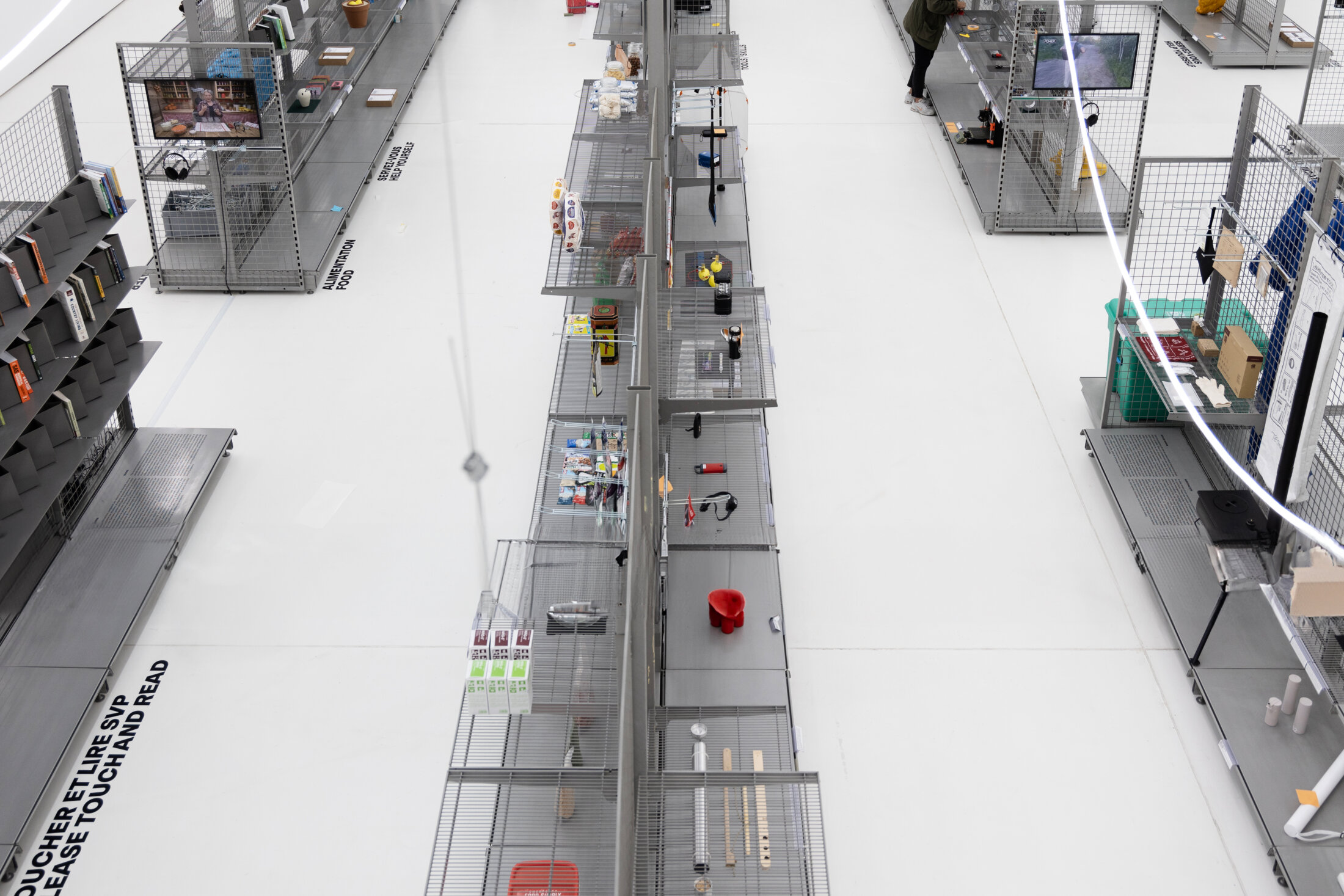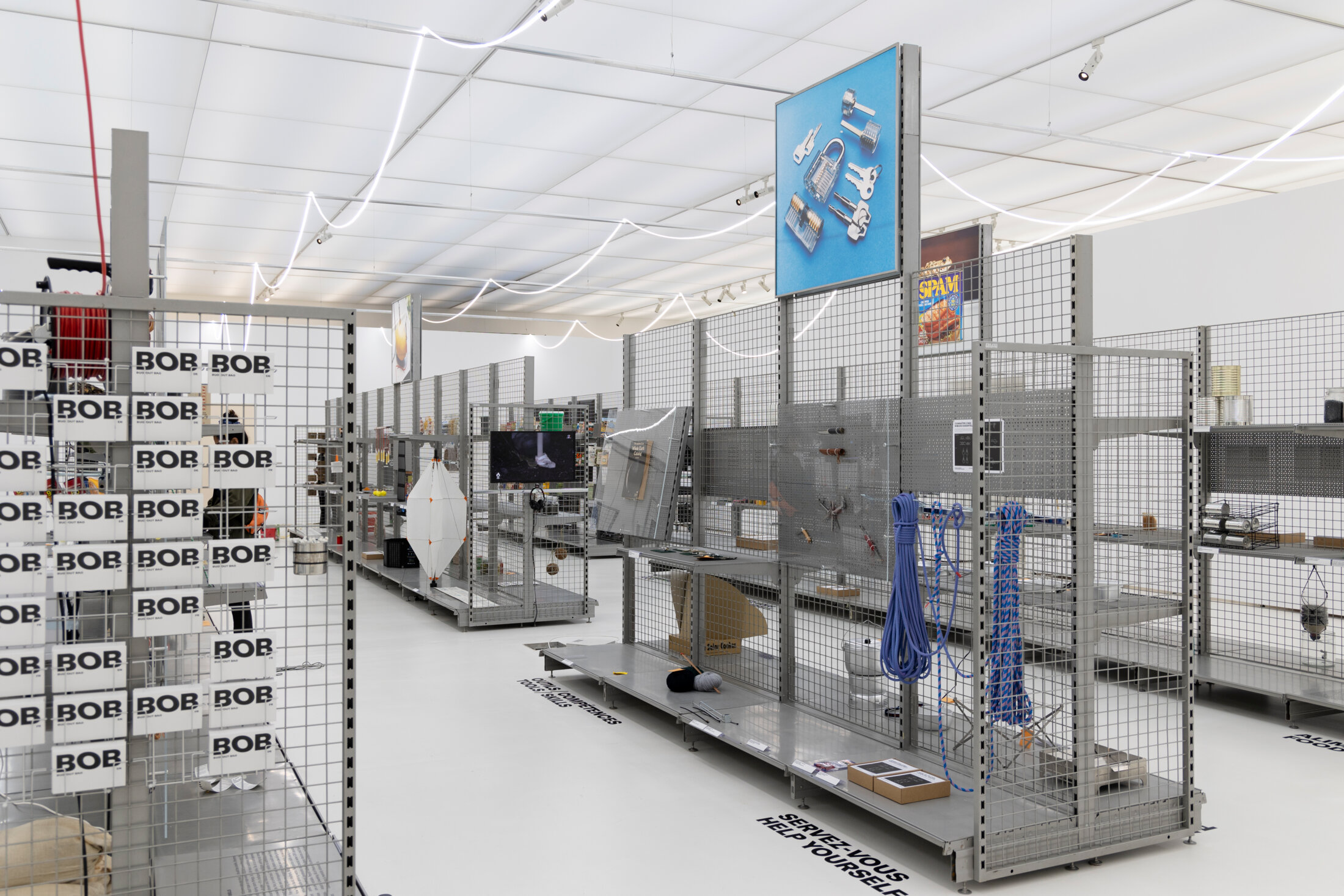 Le mouvement prepper est plein de contradictions. Si ceux qui le composent tiennent la société de consommation pour responsable de l’état du monde, ils vont néanmoins acheter de nouvelles choses pour survivre. Le marché survivaliste est devenu un business gigantesque qui joue avec la peur et la fascination des choses utiles et des choses totalement inutiles. Le « Prepper supermarket » est un grand supermarché à l’échelle 1 présentant tous les produits nécessaires à la survie en cas de catastrophe, ne manquent que les prix. Sur des écrans, des tutos expliquent comment faire du feu et font écho au « Re-fire kit » (2014) de Francesco Faccin, conçu pour l’allumage manuel du feu, produit à l’aide d’outils et de processus de production sophistiquée contemporains et largement disponibles.