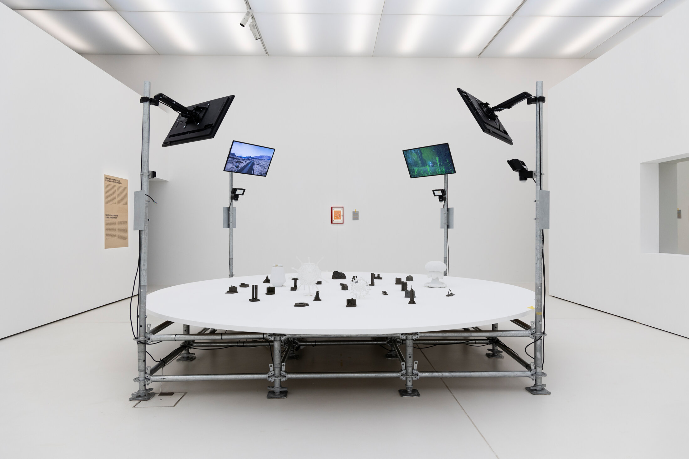 Au milieu de ces souvenirs sont installés d’autres éléments comme « Huggable Atomic Mushroom : Priscilla, 37 Kilotons, Nevada, 1957 » (2004- 05), figurant un champignon nucléaire mou, sorte de doudou à la hauteur de son angoisse, réalisé par Anthony Dunne et Fiona Raby, qui fait partie du projet « Design for Fragile Personalities in Anxious Times », comprenant une collection de produits spéculatifs qui s’intéresse aux relations psychologiques entre l’objet et son utilisateur. Tout visiteur ayant une peur phobique de l’anéantissement nucléaire est invité à étreindre le champignon atomique pour mieux embrasser ses peurs. La sculpture en verre « COVID-19 » (2020) créée par Luke Jerram dans un hommage à l’effort scientifique et médical mondial pour combattre la pandémie, fait partie de la série « Glass Microbiology » dans laquelle il explore les représentations artistiques des virus les plus dangereux. De part et d’autre de la table sont disposés quatre écrans proposant des images postapocalyptiques. Derrière une vitre sans tain, une caméra filme vingt-quatre heure sur vingt-quatre en attendant que quelque chose se produise. Dans une petite salle adjacente est projeté le film « Iroojrilik » (2016) de l’artiste franco-suisse Julian Charrière, qui explore les conséquences des essais nucléaires menés sur l’atoll de Bikini, montrant les dégradations des structures atomiques industrielles de l’atoll et la régénération de son environnement. Le film évoque une cité engloutie proche de l’Atlantide.