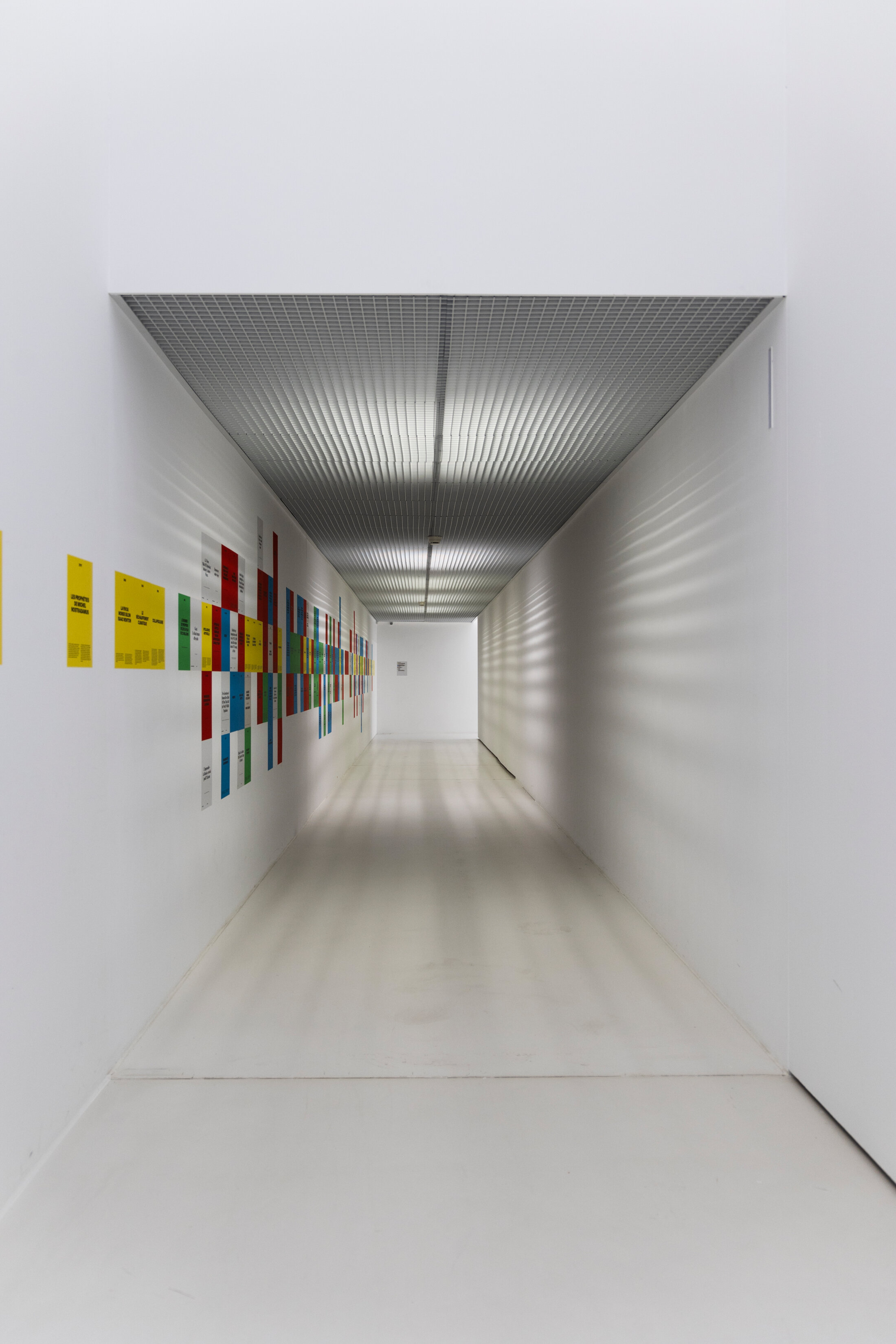Les prédictions de fin du monde sont nombreuses et existent depuis la nuit des temps. Le mur du long couloir qui mène à l’exposition, transformé en frise chronologique, permet de matérialiser, au milieu des grandes étapes de l’histoire de l’humanité, les pronostics d’anéantissement de l’humanité. Ça commence avec le Déluge, récit mythologique d’une inondation catastrophique causée par une divinité ayant décidé de détruire l’humanité et dont le récit le plus connu est « l’arche de Noé » dans La Bible. Ça se poursuit avec les propos étonnement contemporains des tablettes assyriennes en pierre datées autour de 2 800 avant notre ère sur lesquelles on peut lire : « Notre terre a dégénéré ces derniers temps, des signes annoncent la fin du monde, la corruption est omniprésente, les enfants n'obéissent plus à leurs parents, tout le monde veut écrire un livre, la fin du monde est manifestement proche ». Puis, à la fin du Ier siècle, le récit mythique des « Quatre cavaliers de l’Apocalypse » du livre de l’Apocalypse dans le Nouveau Testament, symbolisant la conquête, la guerre, la famine et la mort, précèdent la fin du monde. Le récit est contemporain de l’éruption du Vésuve et de la destruction de Pompéi et d’Herculanum en 79. Le second avènement du Christ est annoncé pour autour de l’an 1000. Il doit se traduire par trois évènements simultanés : les vivants mourront, l’univers sera transfiguré et les morts seront ressuscités, jugés et récompensés. Au XIIIème siècle, dans la mythologie nordique, une série d’évènements désignés sous le nom de « Ragnarök » entraine la mort de nombreux dieux ainsi que la destruction du monde et sa renaissance. Le 19 mai 1780 en Nouvelle-Angleterre, dans la toute jeune nation des États-Unis, le ciel s’obscurcit tôt dans la matinée. Les gens de l’époque sont terrifiés à l’idée de vivre le jour du Jugement Dernier. Les scientifiques ont déterminé[1] en 2023 qu’il s’agissait sans doute de la fumée des incendies de forêt combinée à un épais brouillard.