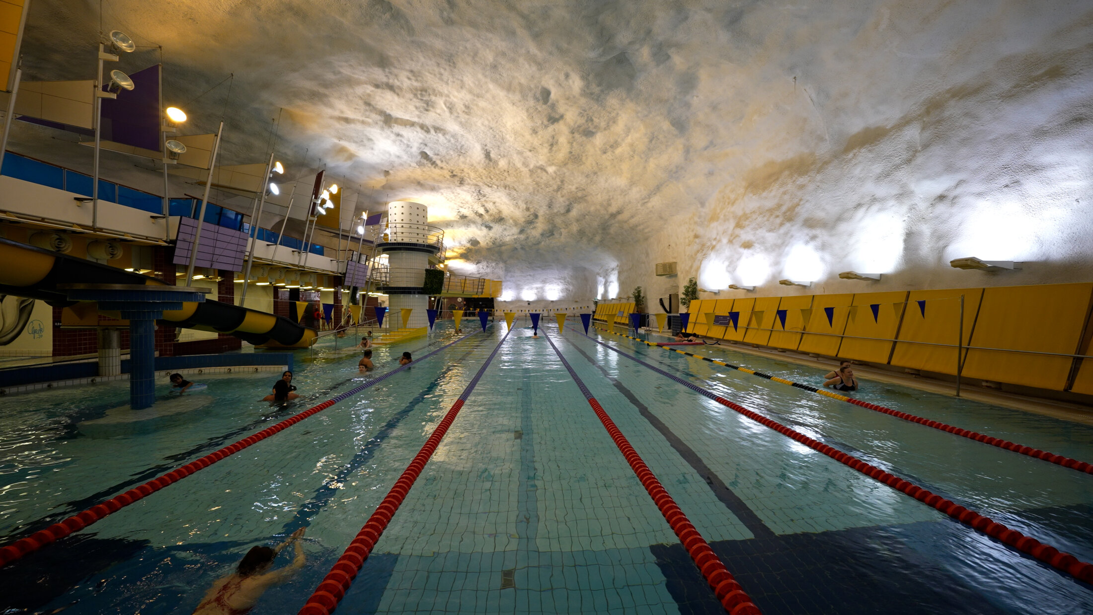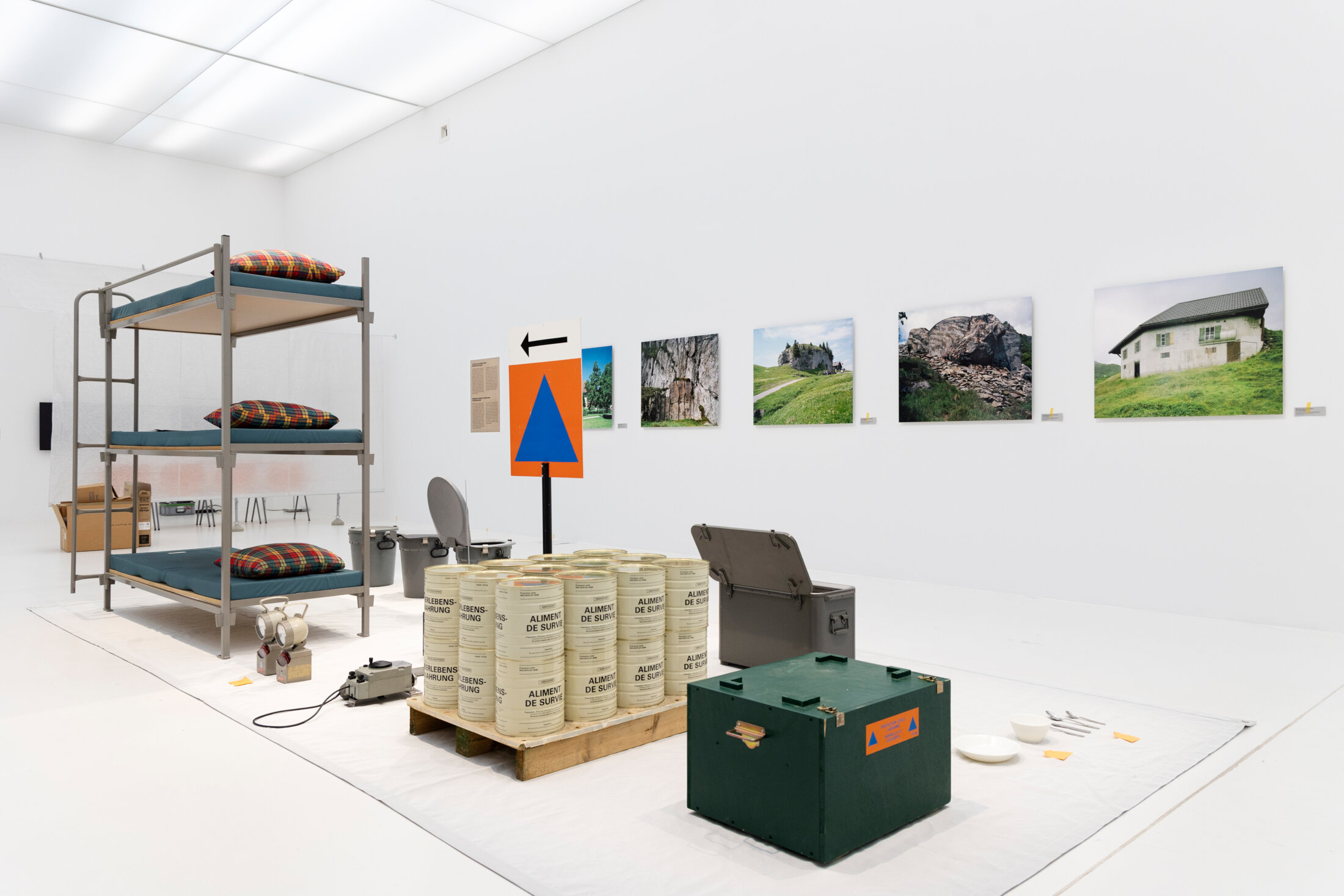 Produit spécifiquement pour l’exposition, le film « Helsinki Underground » (2024) de Tapio Snellman, offre une plongée cinématographique dans la seconde capitale finlandaise, celle qui se trouve sous terre. Elle abrite, entre autres, une église, une piscine, une patinoire, un musée, des centres sportifs. Planifiée pendant la Guerre froide, elle poursuit encore aujourd’hui sont agrandissement. L’exposition interroge aussi l’avenir des nombreux abris et bunkers suisses. Le pays bénéficie d’une double protection. La ligne de défense des militaires se double d’une protection civile très forte encore actuellement. En 1969, le Conseil fédéral distribue à tous les ménages suisses un petit livre rouge : le Manuel de défense civile. Dans la lettre qui accompagne l’ouvrage est écrit : « Ce livre entend nous offrir des repères : face aux événements futurs et aux épreuves qui pourraient frapper notre population, aux catastrophes naturelles et autres, en guise de préparation aux périodes de danger potentiel que pourrait connaître notre patrie... Conservez-le précieusement, lisez-le attentivement, vérifiez de temps à autre que tout le nécessaire est prêt afin de permettre à tous d’envisager l’avenir avec confiance ». L’abondance répond à la famine : les pays riches stockent de la nourriture dans le cas d’une éventuelle catastrophe de grande ampleur qui ne vient pas alors que, dans les pays pauvres, les populations meurent de faim.