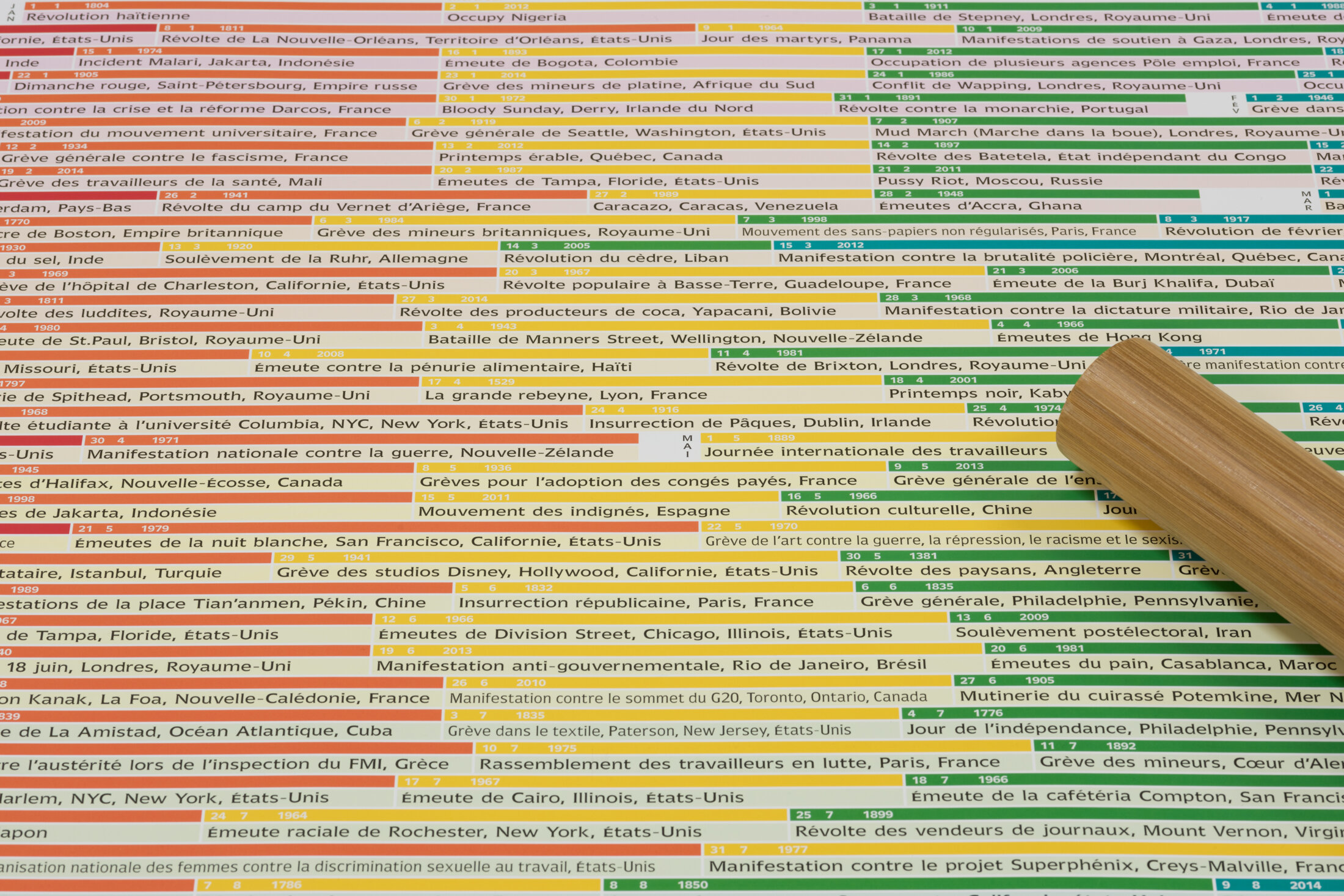 Formant un écho à l'intérieur de l'exposition, le "Calendrier des révoltes" remplace chaque saint patron du jour calendaire par une révolte qui a eu lieu à la même date. Activé par l'année en cours, le calendrier est en activation permanente depuis 2015. Le protocole répond à deux parties distinctes : d'une part, une carte blanche aux graphistes Huz & Bosshard et d'autre part, le choix par l'équipe du lieu d'une révolte en cours, venant se substituer à une plus ancienne. Ici, c'est la date du 20 septembre qui a été retenue comme celle marquant la grève des employé-e-s du Théâtre de la Commune CDN d'Aubervilliers. Pour que les visiteurs puissent emporter un exemplaire, un protocole rend nécessaire l'usage d’un bâton en bois afin de pouvoir plier l’objet.