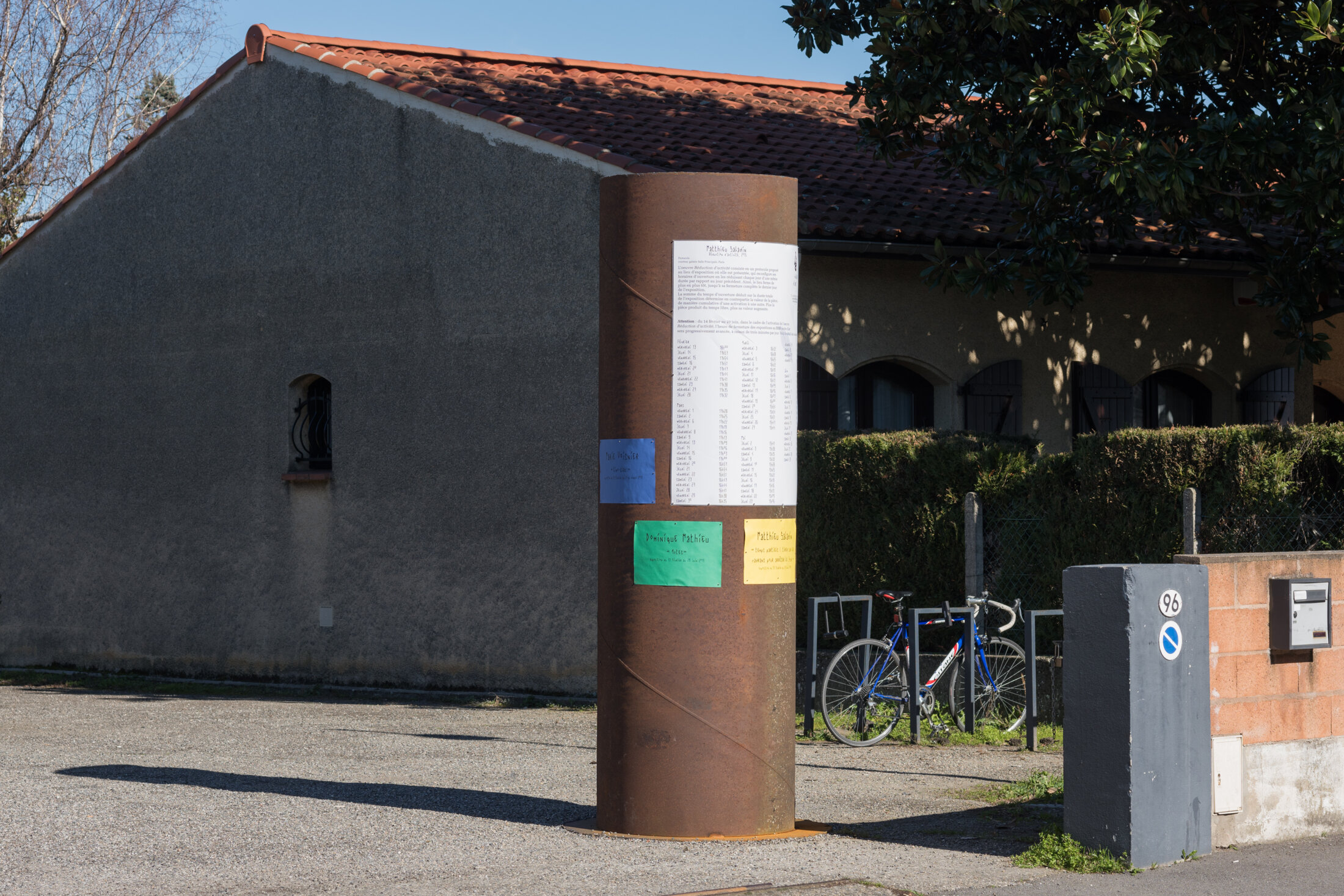 Le projet global de "Temps partiels", l'exposition consacrée à l'œuvre conceptuelle de l'artiste, musicien et chercheur Matthieu Saladin, investit de manière critique notre rapport au passé et au présent des idées politiques. Sous-titré "Tirer sur les cadrans pour arrêter le jour", le premier volet, rétrospectif, réactive des pièces existantes. L'œuvre de Matthieu Saladin invite à réfléchir sur les rapports entre art et société du point de vue politique et économique. L'artiste donne le ton de la saison en rédigeant en quelque sorte sa déclaration dans une pièce qui n'existe pas encore. Cette œuvre en devenir ne sera en effet achevée que pour le second volet de son exposition. Saladin adopte une position critique en soustrayant le temps à celui, aliéné, du néolibéralisme. Prônant la réduction d'activité, on lui doit l'application chaque jour d'une diminution toujours plus grande des heures d'ouvertures du centre d'art qui offre, dans un idéal émancipateur, autant de temps libre supplémentaire à ses employés. Selon le principe des vases communicants, le prix de l'œuvre future, pièce immatérielle répondant à un protocole spécifique, augmente en fonction du temps libre activé, constituant une proposition concrète pour un financement du droit au temps libre. Avant même d'entrer dans le centre d'art, la subtile poésie politique de Matthieu Saladin est visible dans un recoin vitré de sa façade. Très discrètement, une bouilloire se met en marche chaque jour ouvré à 17h35. Son déclenchement est indexé sur l’heure de fermeture de la bourse de Paris. Durant quelques secondes à peine, la buée formée par la vapeur d'eau bouillie se dépose sur la vitre, laissant apparaitre ces quelques mots tracés au doigt et donc invisibles d'ordinaire "Voir le lointain comme s'il était présent". Cette phrase servant de titre à l'œuvre est extraite de la "Généalogie de la morale" de Friedrich Nietzsche. Dans cet essai de la maturité, rédigé juste après "Ainsi parlait Zarathustra", l'auteur cherche à y retracer l’origine des conceptions morales qui prévalent à son époque. Il situe leur source dans la conscience chrétienne, qu’il tient pour une éthologie du ressentiment dont il faut se libérer. Parfait exemple d'une œuvre de collaboration, le « Fût » est un élément de scénographie extérieur, sorte de panneau totem réceptacle d'un "affichage à but idéal", créé par Dominique Mathieu pour répondre aux besoins de l’exposition de Matthieu Saladin et ceux du centre d’art. Ce cylindre d'acier rouillé qui, à l'origine, devait être une colonne en béton, agrémentée de regards d'égouts, recevra dans le premier volet, une affiche indiquant les horaires d’ouverture dans le cadre de "Réduction d'activité" et dans le second, "Le nombre du besoin": un ensemble d’affiches dont le nombre correspond au nombre de jours d’ouverture de l’exposition. Chaque jour, sera montrée une nouvelle affiche qui présente une grève ayant duré un nombre de jours équivalent à la durée restante de l’exposition. Ainsi, deux semaines avant la fin du projet, sera exposée une affiche sur une grève qui aura duré quatorze jours.