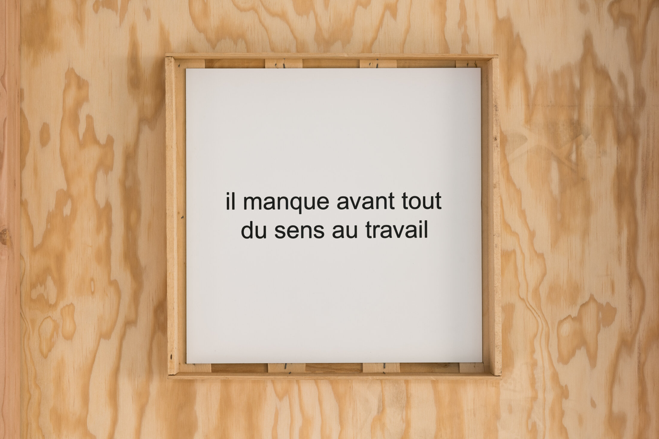 "Mon travail est dicté par l'ambiance générale. Aujourd'hui le contexte est tel que j'ai envie de faire autrement et ailleurs, être beaucoup plus dans le concret, s'échapper du contexte de l'art" Ces propos recueillis à l'occasion de l'ouverture du premier volet rétrospectif de l'exposition consacrée au travail de Dominique Mathieu, sont ceux d'un homme libre. Marqué par les prises de position d'Enzo Mari, il se définit comme un "designer utile" dont la fonction est de modifier radicalement les objets. La déclaration annonce ainsi l'arrêt de son activité artistique à la fin de l'année en cours. L'ambiance générale de l'exposition se rapproche du cadre domestique. "La grande table" accueille durant l'exposition les sessions de formations dispensées par le centre d'art. L'artiste accorde une place centrale à cette activité d'ordinaire non publique, pour souligner les limites et l'absurdité de la professionnalisation des artistes pourtant indispensable pour faire face, entre autres, à l'administration. Un sorte de provocation dans le déplacement a pour but de redonner du sens au travail. Les pièces présentées parlent du travail et questionnent le sens qu'on lui donne face au capitalisme. Un papier peint figurant les barricades réalisées à l'aide de mobilier de récupération pour le Centre d'art contemporain de Brétigny permet de cerner un peu plus la vision singulière qu'il a de son métier de designer. Dominique Mathieu, originaire du quartier de la Croix-Rousse à Lyon, y fait référence à la révolte des Canuts. Pour lui, l'acte de professionnalisation de l'art correspond plus à un enfermement qu'à autre chose. C'est précisément le sens du slogan "les vrais sujets sont ailleurs". Sur le mur qui lui fait face, l'artiste a tenu à présenter sa documentation personnelle d'où se détachent quelques phrases manifestes telles "Il n'y a qu'un seul Monsieur Hulot" ou encore "Agir sans nuire", comme une vision possible de notre monde. L'exposition intitulée "Actes" répond au classement des œuvres, établi depuis 2009 par Dominique Mathieu et divisé en Acte I, Acte II, Acte III. Dix ans de création artistique qui, dès le départ, avaient acté qu'il n'y aurait pas d'Acte IV. Le passage d'un acte à un autre est toujours déterminé par un évènement. En 2007, l'exposition "Fracture sociale" qui se tient à la galerie Mica à Rennes marque la fin de l'Acte I en donnant à voir la première installation des barricades. Depuis cette date, Dominique Mathieu prône la décroissance, travaillant uniquement avec des matériaux de récupération. A l'Université de Paris 8 où il enseigne, il choisit de dispenser un cours intitulé "Agir sans nuire". Une pensée qui interroge la place occupée par les arts plastiques à l'ère de l'Anthropocène, invite à l'échange, privilégie le troc de produits. Sur le grand mur du fond, un plateau, réalisé pour le CFA de Brétigny, est l'un des deux seuls objets utilitaires. Tout près, une brique support de texte reste néanmoins une brique puisque l'entreprise qui les fabrique s'est engagée à disséminer çà et là parmi les briques vierges celles portant inscription. Le procédé semble faire écho aux billets de banque gaufrés que Matthieu Saladin réinjecte dans l'économie locale.