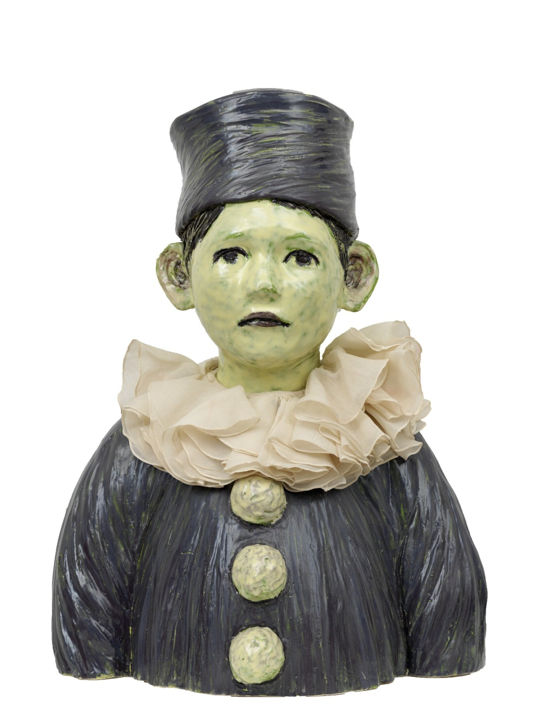 A la collection Lambert, l’exposition « Les veilleurs » rassemble de grandes toiles mettant en scène des groupes imaginaires que Claire Tabouret invente en atelier en s’appuyant sur des photographies. Ils paraissent attendre le visiteur. Qui sont-ils ? Que veulent-ils ? Représentant majoritairement des enfants ou adolescents, ces images rappellent, par l’utilisation de plans successifs, les photos de classe ou celles documentant un événement particulier comme par exemple une fête de fin d’année. Cependant, il y a quelque chose d’inquiétant dans ces regards qui fixent le visiteur. Pour Claire Tabouret, l’enfance est le moment des grandes émotions, des grandes décisions, c’est pourquoi ils apparaissent sérieux, déterminés. Cet air grave désarçonne le public, peu habitué à voir des enfants montrés de la sorte. L’absence de sourire soulève particulièrement l’inquiétude des adultes pour qui le monde de l’enfance est celui de l’insouciance. Pourtant, des peintures de Françoise Pétrovitch aux dessins quasi analytiques de Florence Reymond, les représentations du monde de l’enfance dans l’art contemporain sont marquées par une étrangeté qui confine parfois au cauchemar. C’est que le temps de l’enfance est celui des découvertes et des apprentissages, le moment où l’on prend conscience de son corps. Dans les tableaux à plusieurs personnages de Claire Tabouret, les individus apparaissent esseulés parmi la masse. Plus que des portraits de groupe, ils évoquent des assemblées de solitaires. La fête est grave comme semblent l’attester les visages des quatre-vingt-cinq enfants de la fresque qui recouvre les murs de la chapelle du château de Fabrègues, exécutée in situ par la peintre en 2017. A la Collection Lambert, les portraits d’enfants costumés en tenue de carnaval ont le visage sombre et lucide d’adultes que l’on aurait déguisé en enfants. Face à ceux de « La grande camisole » le visiteur éprouve un malaise. Les visages austères, les camisoles qui enferment les corps autant qu’elles les lient, les couleurs passées donnent à la scène une atmosphère spectrale. Ici comme dans les autres représentations de masse, l’artiste interroge la constance de l’identité individuelle à l’intérieur du groupe. « Il y a quelque chose de paradoxal dans cette récurrence du groupe. Sûrement une fascination personnelle pour l’appartenance à une communauté, le désir que cela crée, la terreur que cela engendre, comme l’impossibilité – chez moi, depuis toujours – d’en faire partie. » confie-t-elle (La Croix, 16.07.18). A côté de ces grandes toiles, les bustes en terre cuite d’adolescents témoignent du travail de sculpteuse de Claire Tabouret. Si celui-ci est moins connu, il donne à voir dans les visages représentés, les mêmes regards insistants et paraissent vouloir prendre la parole pour nous interpeller sur notre identité.