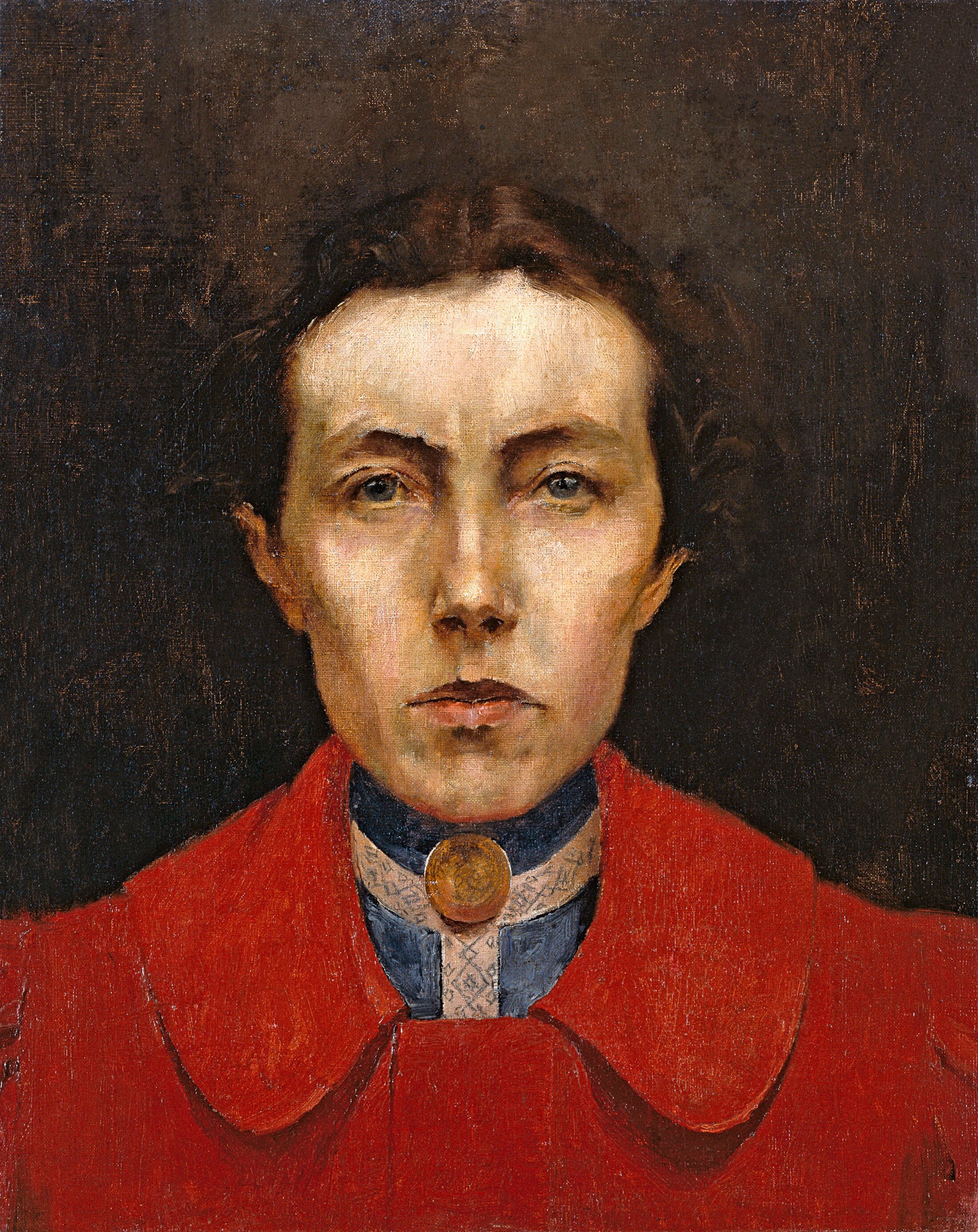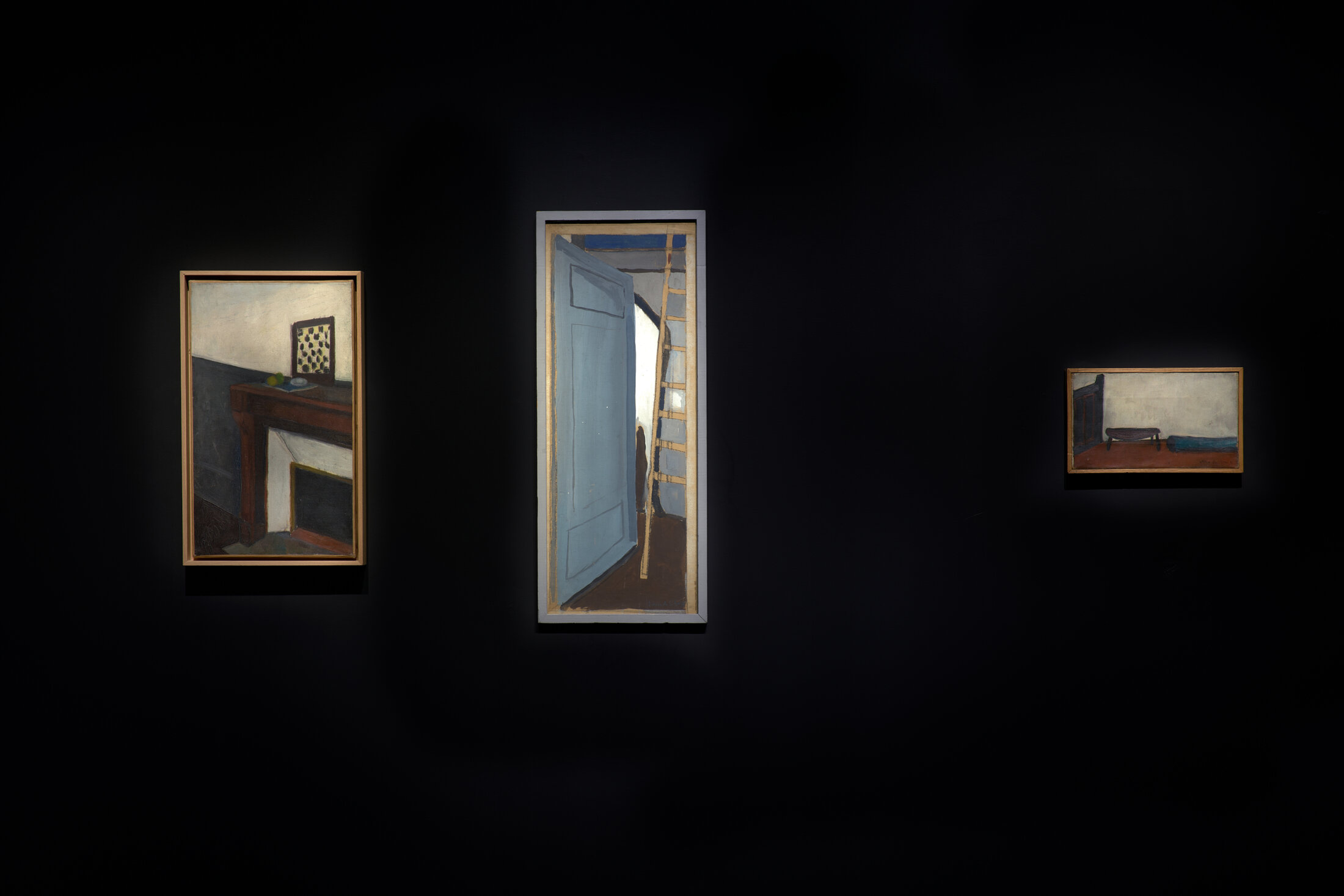 Dans les autoportraits de Sarah Affonso (1899-1983) et Maria Helena Vieira da Silva, le thème du regard est exploré à partir du miroir et de l’image qu’il renvoie à l’artiste. Celle-ci se mire, se reconnait, s’invente dans l’acte d’observation. Mais le miroir ne reflète pas seulement l’artiste. Il inclut son environnement direct, l’espace de la maison, de l’intimité. Affonso intègre ses compagnons, collègues et amis artistes dans une série de portraits masculins qui inverse le couple traditionnel de la muse et du peintre, les positions du dominé et du dominant. Le corps comme centre de narrations fortes joue sur les identités de genre, provocateur chez Paula Rego (1935-2022) lorsqu’elle affuble un prêtre d’une jupe dans le tableau « Mãe (Mère) » qu’elle exécute en 1997, subversif dans l’étude photographique (vers 1902) pour « Saint-Antoine (Autoportrait) » dans laquelle Aurélia de Souza apparait travestie en homme et en saint, les deux œuvres instaurant un dialogue inédit à presque cent ans d’écart. Menez (1926-1995), dont Paula Rego disait avoir tout « volé » d’elle[7], explore, dans ses environnements imaginaires et mélancoliques, l’espace de l’intimité et de la solitude. L’espace de travail, qu’elle matérialise par sa présence, y figure comme un lieu vital.