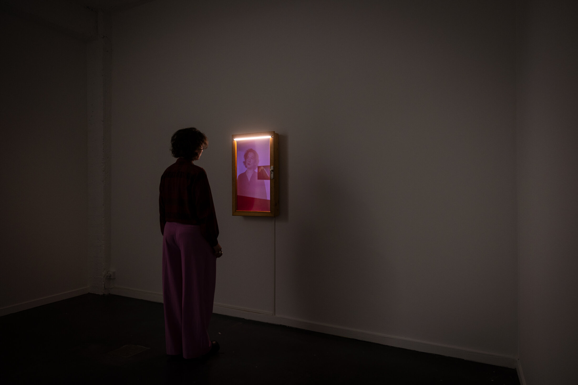 L’invitation faite à quatre artistes contemporains à engager un dialogue créatif avec l’héritage de Zulueta, élève la rétrospective au-delà de la simple commémoration. Marta Azparren, dont l’essai « Cine ciego. Detener el flujo de las imágenes[6] » explore les liens entre créateur et spectateur, élabore des œuvres qui interrogent l’invisible dans l’image. Ses installations, à la croisée du film expérimental et des arts vivants, stoppent le flux visuel pour révéler les strates cachées, écho à l’obsession zuluetienne pour l’étrange. « Arrebatador » est une installation qui reprend et transforme l’image‑miroir centrale du film culte d’Iván Zulueta, « Arrebato ». Azparren utilise un écran LED qui joue le rôle du « miroir ». Le visiteur qui se place devant l’écran est transformé visuellement en un monogramme rouge, identique à celui du film. Cette opération le fait basculer entre image et objet, surface et profondeur. « Arrebatador » opère un renversement simple et brutal. Il reprend le motif iconique, le rouge d’« Arrebato », et le transforme en efficacité interactive. Le spectateur n’est plus seulement regardeur. Il devient image‑signe. Cette inversion fait sens par rapport au thème original de Zulueta, l’addiction à l’objet filmique. Ici, la « prise » s’opère par la technologie, qui fige, marque et monogramme le corps face à l’écran. En rendant visible la « conversion » du regard en icône rouge, l’installation propose une lecture contemporaine, celle de la surexploitation des images, de la réduction des sujets en vignettes et identifiants visuels sur les écrans.
