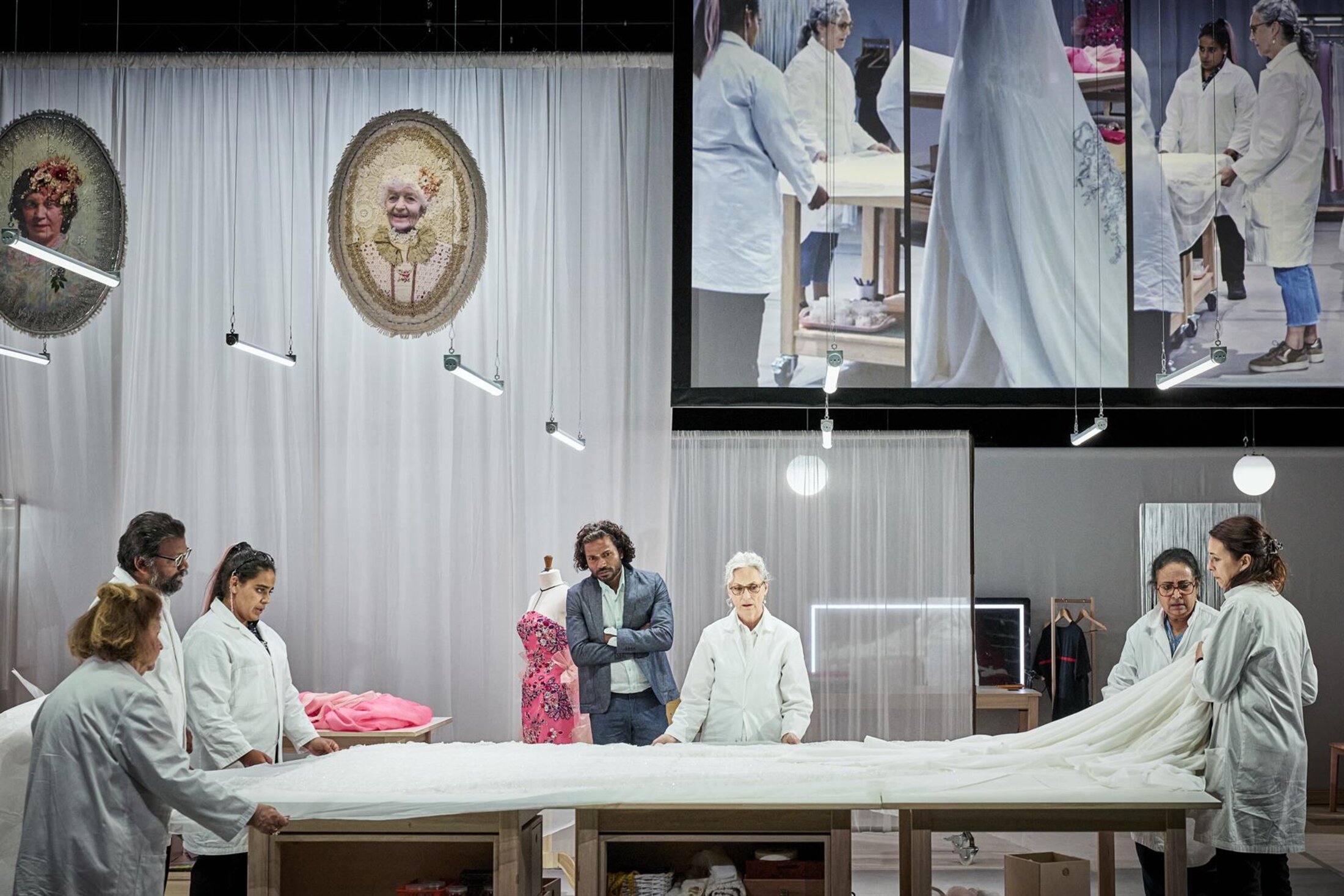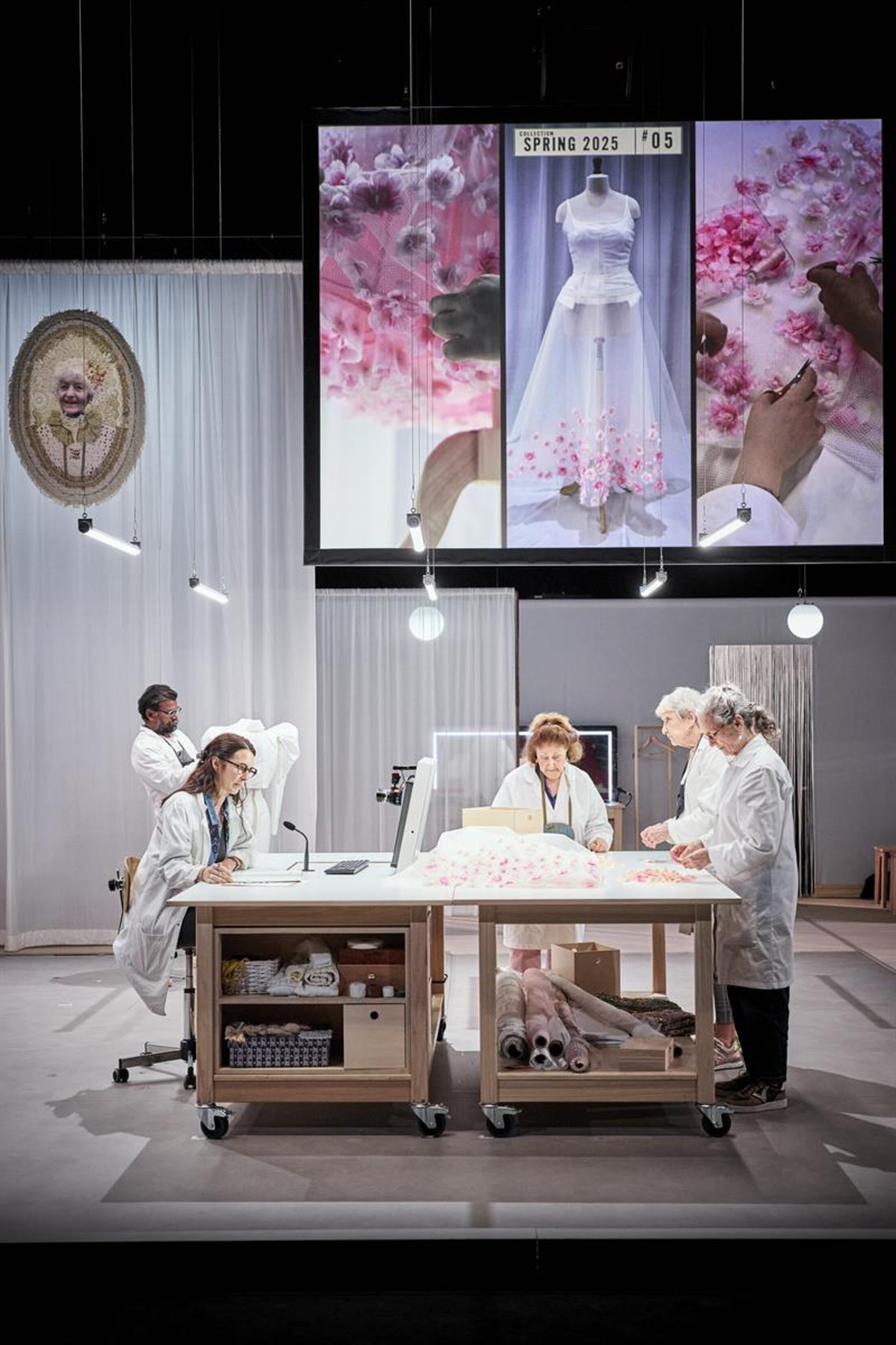 Un décor d’atelier de confection. Nous sommes entre les murs de la prestigieuse maison de haute-couture Beliana, située rue du faubourg Saint-Honoré à Paris. Le lieu est désert. Sur un ordinateur encore allumé, une femme s’inquiète en ligne, appelle Marion depuis l’autre côté de l’écran. Dans quelques instants, Marion s’effondrera inerte après avoir expliqué qu’elle a fait ce qu’il fallait faire. Bientôt, les pompiers, prévenus par celle qui virtuellement lui parle, tenteront l’impossible avant que la voix de sa fille ne sorte in extremis Marion de la tombe dans laquelle elle s’est elle-même allongée. Les voix les plus intimes sont parfois celles qui, lorsque toute forme rationnelle de secours a échoué, empêchent de disparaitre tout à fait, ramènent à la vie. Pour son dernier spectacle, Caroline Guiela Nguyen place le spectateur face à une évidence en révélant d’emblée la fin de l’histoire. Le dénouement est sombre à l’image de cette quête absolue d’excellence inhérente aux petites mains, à celles est ceux qui travaillent dans l’ombre, que l’on ne voit pas, et sans qui pourtant une maison de haute-couture ne pourrait tout simplement pas exister. Ils ne portent pas en eux un sentiment de réussite professionnelle, non, plutôt la satisfaction du travail bien fait. Pour ces gardiens de savoir-faire uniques, transmis de génération en génération, et dont certains sont en voie de disparition, il ne s’agit pas d’un simple métier mais bien d’une quête de soi dans une société contemporaine où s’effilochent de plus en plus les liens qui unissent les humains. Après ce préambule prémonitoire, maintenant que l’on n’a plus à s’inquiéter de la fin de l’histoire, le spectacle peut commencer. Il nous ramène huit mois et des milliers d’heures de travail avant le drame qui vient de se jouer.