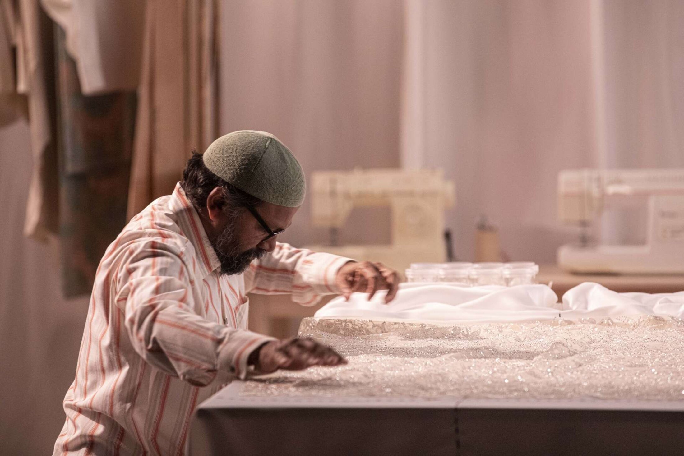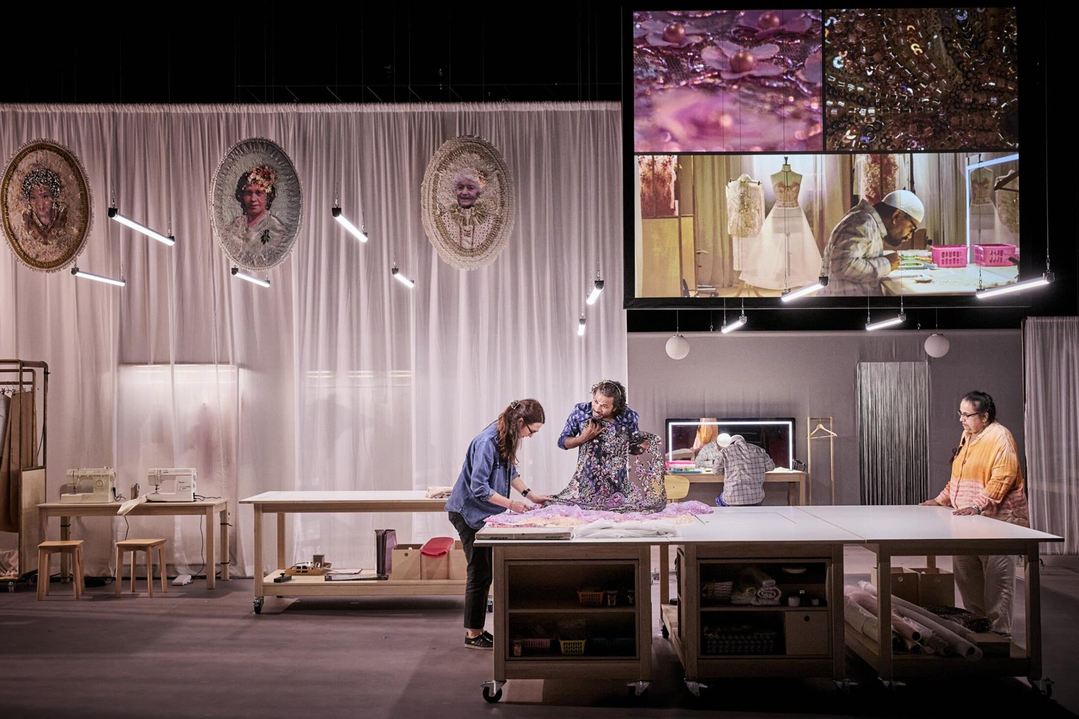 « Lacrima » trouve son point de départ dans un article sur la robe de mariée de Lady Di, confectionnée sous le sceau du secret, qui ancre la pièce dans le monde très genré de la haute-couture. Et si Caroline Guiela Nguyen n’était pas tombée sur un article du New York Times qui expliquait que les broderies de luxe étaient la plupart du temps faites par des brodeurs indiens musulmans, selon une tradition qui vient de Perse, le casting aurait été sans doute presque exclusivement féminin. La haute-couture reproduit cependant les schémas de domination que l’on retrouve dans bien d’autres métiers et qui voient les hommes occuper les postes de direction et de création, tandis que les femmes sont très souvent des exécutantes. En Inde, les ateliers renfermant du sequin, de la perle, des plumes, des paillettes aux couleurs vives, soit autant de éléments typiquement féminins dans l’imaginaire genré, sont entièrement occupés par des hommes. Si la question du secret traverse presque toutes les pièces de Caroline Guiela Nguyen de façon plus ou moins affirmée, elle en compose ici le point de départ, et concerne aussi bien la sphère professionnelle que la sphère personnelle. C’est la mémoire de Thérèse – magnifique Michèle Goddet – qui flanche lorsque sa fille lui demande la nature de la mort de sa sœur survenue il y a bien longtemps, la violence conjugale qui fait irruption dans l’atelier parisien. Autour du récit principal se dévoilent des histoires intimes. « J’ai eu envie de l’aborder plus frontalement après avoir assisté à un groupe de parole de victimes de violences intra-familiales[1] » précise l’autrice-metteuse-en-scène. « Dans beaucoup de cas, le secret était la condition même de l’exercice de la violence ». Dans ses spectacles, il y a toujours un élément commun qui relie entre elles les différentes histoires qui les composent, à l’image du restaurant vietnamien dans « Saigon » qui permettait de passer d’une géographie à l’autre, d’une temporalité, d’une époque à l’autre. Dans « Lacrima », c’est l’atelier qui joue ce rôle, espace suffisamment conjoint aux trois lieux qui sont autant d’étapes pour la réalisation de la robe : une maison de haute-couture parisienne, un atelier de dentelles à Alençon et un atelier de broderie à la main à Mumbai. Accueillant des couturières, des modélistes et des brodeurs, ils sont tous les trois liés par un socle commun : le travail, le savoir-faire et le secret.