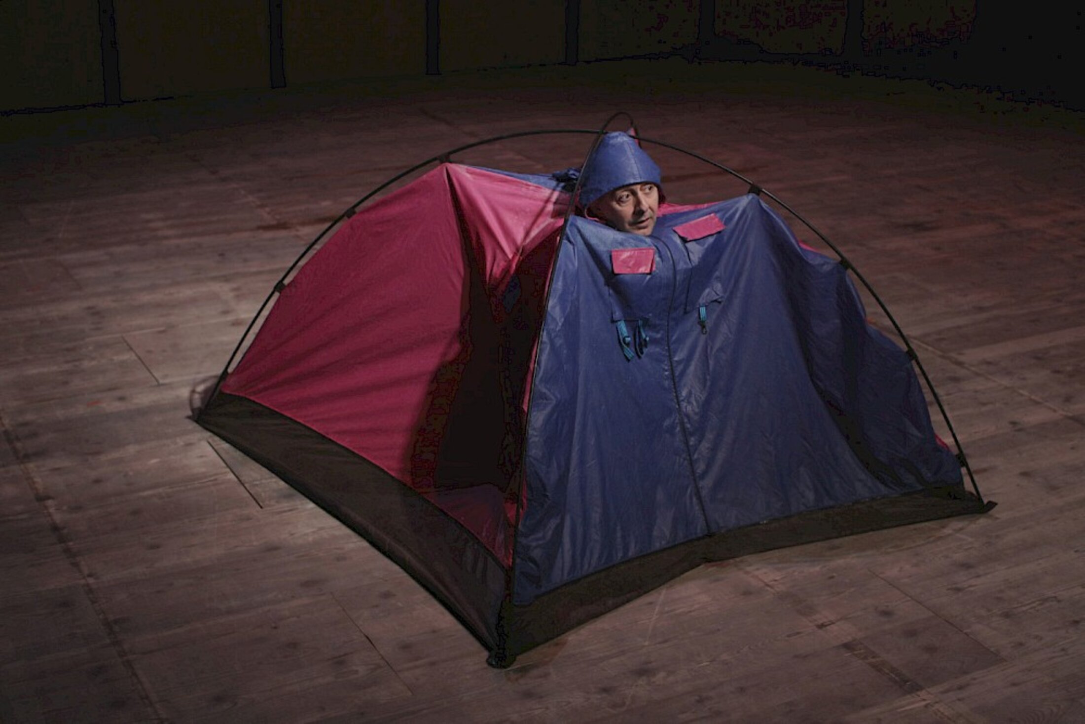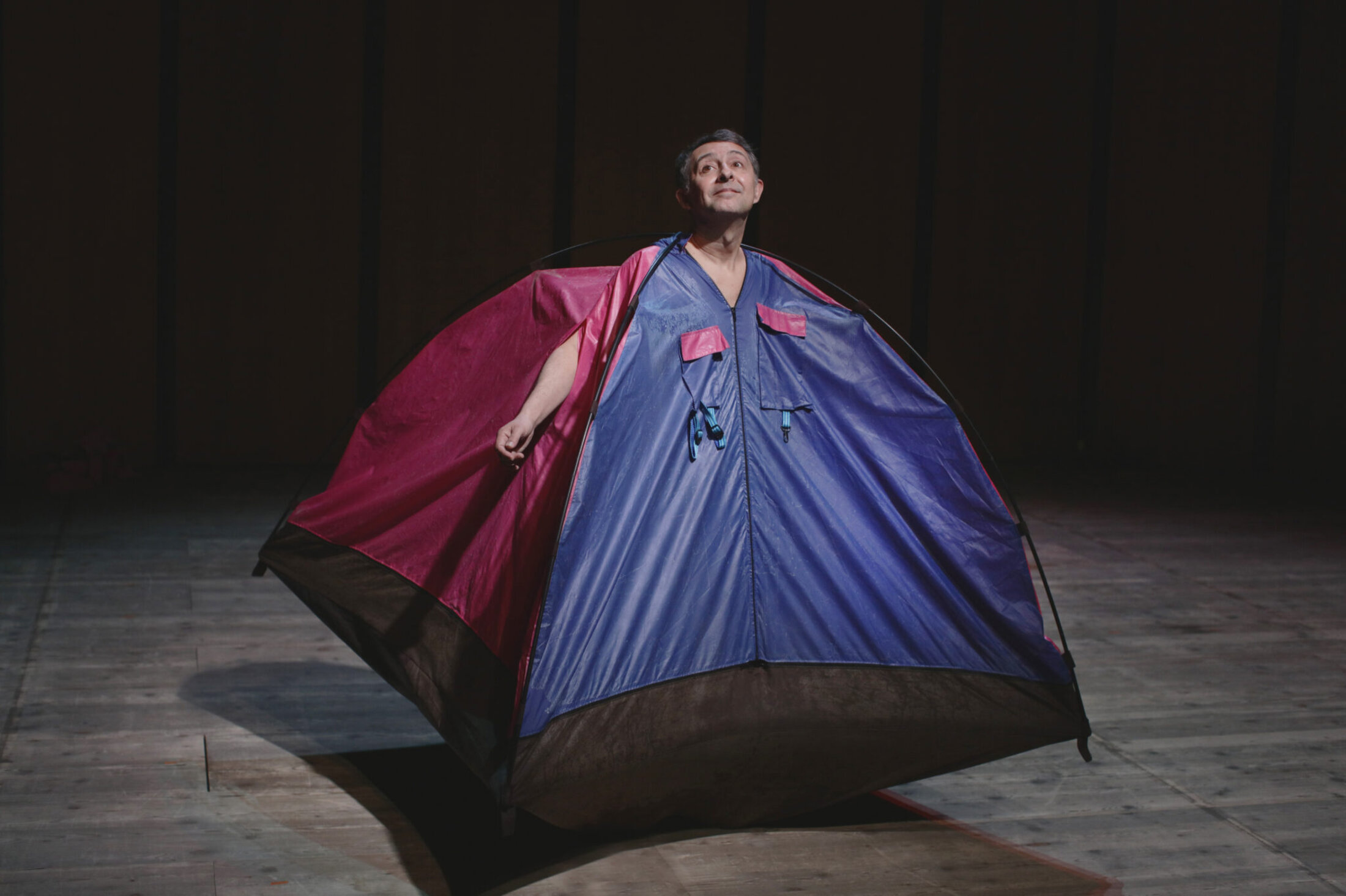 Au cœur de la pièce, il y a une interrogation sur ce que signifie « habiter » : habiter un corps, un genre, un espace, une société. Patricia Allio, fidèle à une pensée queer, explore ces questions avec une radicalité qui n’exclut jamais la légèreté et l’humour. Le spectacle s’ouvre sur une méditation autour de la tente « Refuge Wear », objet à la fois concret et symbolique, conçu par l’artiste Lucy Orta pour répondre aux besoins des populations nomades ou sans-abri. Cette tente, manipulée avec inventivité par Pierre Maillet, devient tour à tour refuge, costume, métaphore d’un habitat fluide, en opposition aux structures rigides de la société patriarcale. Dans un moment de pure jubilation, elle se transforme même en une jupe à crinoline, clin d’œil malicieux à la performativité du genre et à la théâtralité des identités.