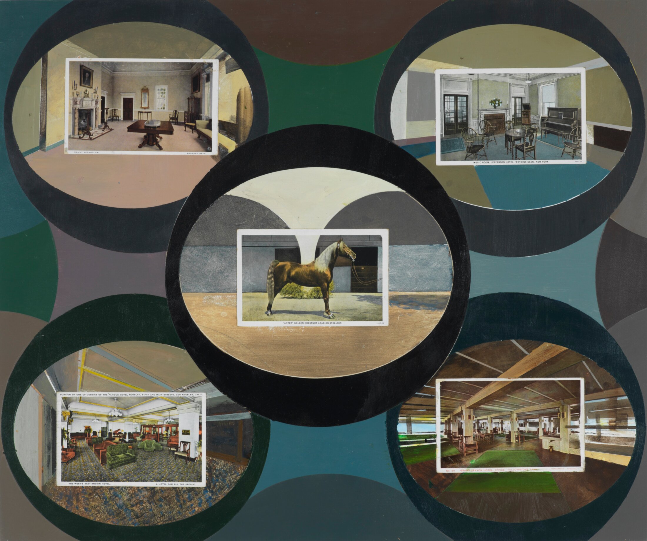 Occupant les deux espaces de la galerie rue de Seine, l’exposition prend soin de répartir également photographies, films, peintures, dessins et textes, et met en dialogue les pièces iconiques de la dynastie des braques de Weimar, indissociables de l’œuvre comme de la vie de Wegman. Une première partie intitulée « Espace d’espèces » propose d’abolir les frontières entre différents types d’espaces : pictural, architectural, bi ou tridimensionnel ; tout comme entre les espèces : hommes, chiens, animaux divers. Tandis que la seconde partie, « Espèce d’espaces » est dédié au jeu dont la notion occupe une place prépondérante dans l’art conceptuel de William Wegman. Jeux de balles, d’agilité mais aussi de langage, duo ou dédoublements, autant de formes relationnelles privilégiées qui réunissent l’artiste et sa muse canine. Si elles amusent souvent, les photographies de William Wegman sont aussi d’une immense beauté, d’une grande énigme. Elles attestent de la maitrise technique de l’artiste. Photographe remarquable, William Wegman est aussi un écrivain prolifique, un peintre aventureux. « Depuis le début des années 90, les cartes postales ont trouvé leur place dans mes peintures[6] » explique-t-il. « Les cartes que j'utilise déterminent la direction de la peinture, suggérant le style et l'échelle et le problème de savoir comment, par exemple, une carte postale de Madonna Inn des années 70 pourrait éventuellement se connecter à une carte postale de la chambre du général Grant devient un problème qui m’intéresse. Les cartes postales m’emmènent dans des directions que je n’aurais pas pu imaginer ». Ses propos sont illustrés par plusieurs tableaux récents alliant cartes postales et peinture acrylique à l’image de « Gallery openings » (2015) ou « Stallion hotel » (2020).
