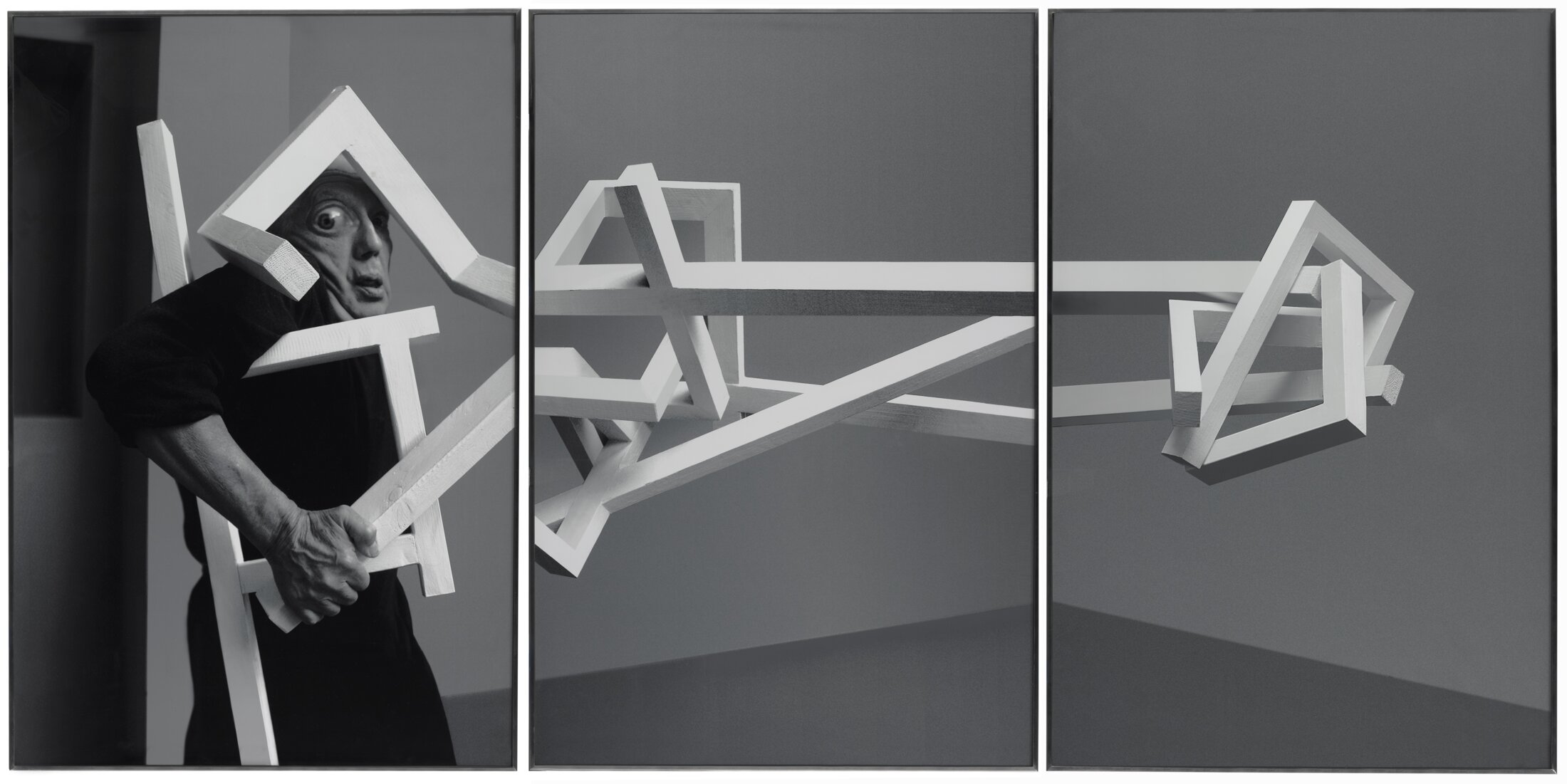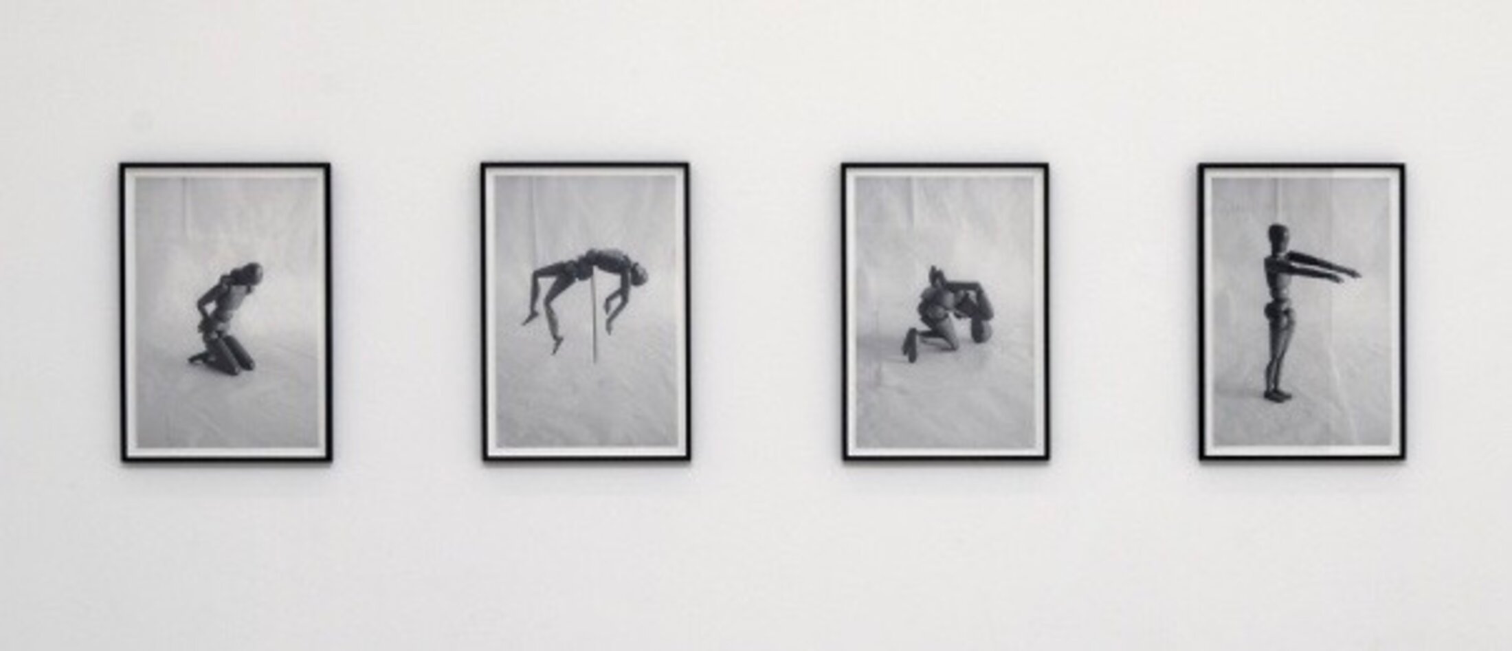 A la fin des années 1920 au Bauhaus, Oskar Schlemmer (1888 – 1943), parallèlement à ses recherches sur le dessin, la peinture et la sculpture, investit la scène, plaçant au cœur de son projet les relations du corps et du geste dans leurs rapports à l’espace et au temps de l’histoire. Sa « Stäbetanz » (Danse des bâtons, 1927) – ici performée par Gerhard Bohner dans une vidéo enregistrée en 1977 –, activation temporelle d’une sculpture constructiviste, marque l’invention de l’abstraction chorégraphique. Les longs bâtons tenus par les danseurs accentuent les diagonales du ballet. Schlemmer révèle la charpente osseuse du corps en en prolongeant ses membres, comme le fait Agnès Geoffray dans « Sans titre (après Claude Cahun) » dans lequel l’artiste s’inspire de trois photographies de l’écrivaine et plasticienne Claude Cahun (1894 – 1954) mettant en scène un pantin sous une cloche de verre, placés ici dans les postures de soumission, d’affliction et d’abandon. Le corps est géométrisé mais non déterminé. Par la suite, il faudra dépasser l’espace du corps, s’extraire de la kinésphère, tendre vers des mouvements en déséquilibre en désaxant le centre de gravité. C’est précisément ce que s’emploie à faire le danseur et chorégraphe américain William Forsythe (né en 1949 à Manhasset, New York) qui introduit l’idée de centres infinis dans le corps, ouvrant à la possibilité d’initier le mouvement. Laurent Goldring (né en 1957 à Paris où il vit et travaille) envisage, quant à lui, la kinésphère comme une simple proposition théorique de l’étude de mouvement. Des kilomètres de cordes blanches tissées à partir de gestes réels du danseur, maintenues dans une structure cubique en métal noir, composent la sculpture inédite appartenant à la série intitulée « Cesser d’être un ». Pouvant être habitée par un corps, elle sert alors d’ossature à une performance, un spectacle. En enchâssant le corps dans une étrange et astreignante sculpture géométrique composée de tiges verticales, « Orthopädie » (2003-04) des photographes allemands Anna et Bernhard Blume présente d’évidentes analogies avec « la danse des bâtons » de Schlemmer. « Le motif devient, littéralement, une croix bien lourde à porter, envahit ou paralyse jusqu’au corps même de l’artiste, sidère son œil exorbité [...]. Là encore, l’objet est incontrôlable, animé d’une volonté en propre, la créature se rebelle contre son créateur jusqu’à fusionner avec lui[2] ». Les sculptures en collants déformés – par l’intervention de danseurs –, de l’artiste américaine Senga Nengudi (née en 1943 à Chicago, vit et travaille dans le Colorado) sondent les limites de la capacité d’extension du corps et de son déploiement spatial, par une approche sociétale, féministe et raciale [3].