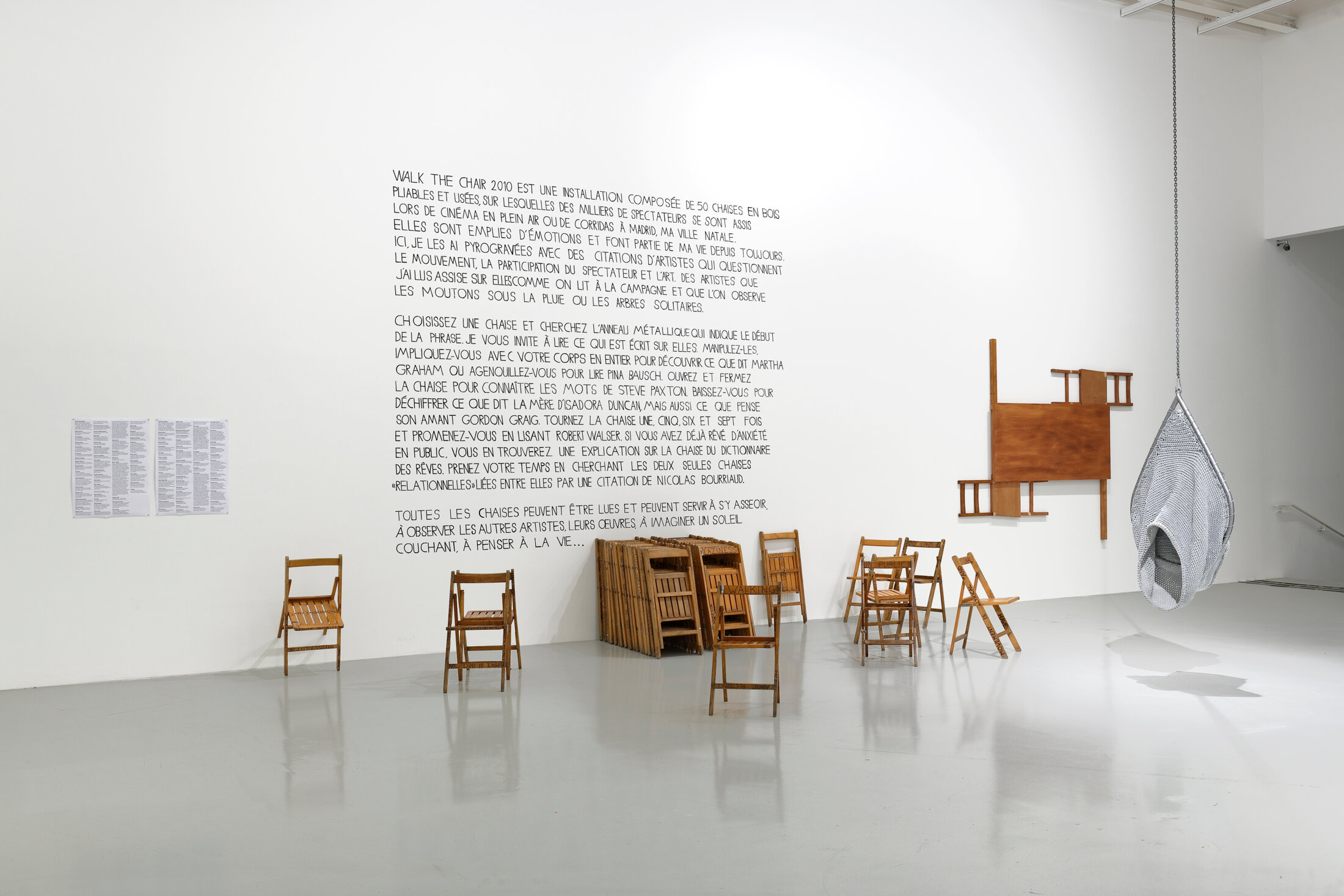 Chez l’artiste espagnole Esther Ferrer (née à Saint-Sébastien en 1937), l’objet se substitue au corps. « Permutations » (2020) rassemble des poignées de portes qui établissent une nomenclature des gestes possibles du corps humain. L’installation « Walk the chair » de La Ribot (née en 1962 à Madrid, vit et travaille à Genève) opère la même substitution. Elle présente cinquante chaises pliantes en bois pyrogravées dont quarante-neuf arborent des citations d’écrivains, de philosophes, chorégraphes et artistes. Pour appréhender la pièce, le visiteur doit manipuler, déplacer les éléments qui la composent, presque la chorégraphier. Pour La Ribot, la chaise est « à la fois un support matériel, un moyen métaphorique d’évoquer une absence, une présence, un autre corps même, mais c’est aussi un instrument potentiellement destructeur. La chaise représente en effet la machine sociale qui conduit à toutes formes d’exploitation des corps, qu’il s’agisse de l’esclavage ou de la prostitution[1] ». Le corps fragmenté s’opère chez Micha Laury (né en 1946 à Negba, Israël, vit et travaille à Paris) et Paul Mpagi Sepuya (né en 1982 à San Bernardino, Californie, vit et travaille à Los Angeles) de manière très différente. Bras en plâtre suspendus par des cordes à la manière d’un étale de boucher dans « Window display insulting hands » du premier, images kaléidoscopiques de portraits photographiques réalisées à l’aide de miroirs et de fragments d’autres clichés, chez le second. Dans l’espace muséal, explorer le corps en volume paraît une évidence pour le public. En trois dimensions, la circularité se fait sphérique. En mouvement, elle est nommée « kinésphère » par le danseur et théoricien hongrois Rudolf Laban (1879 – 1956).