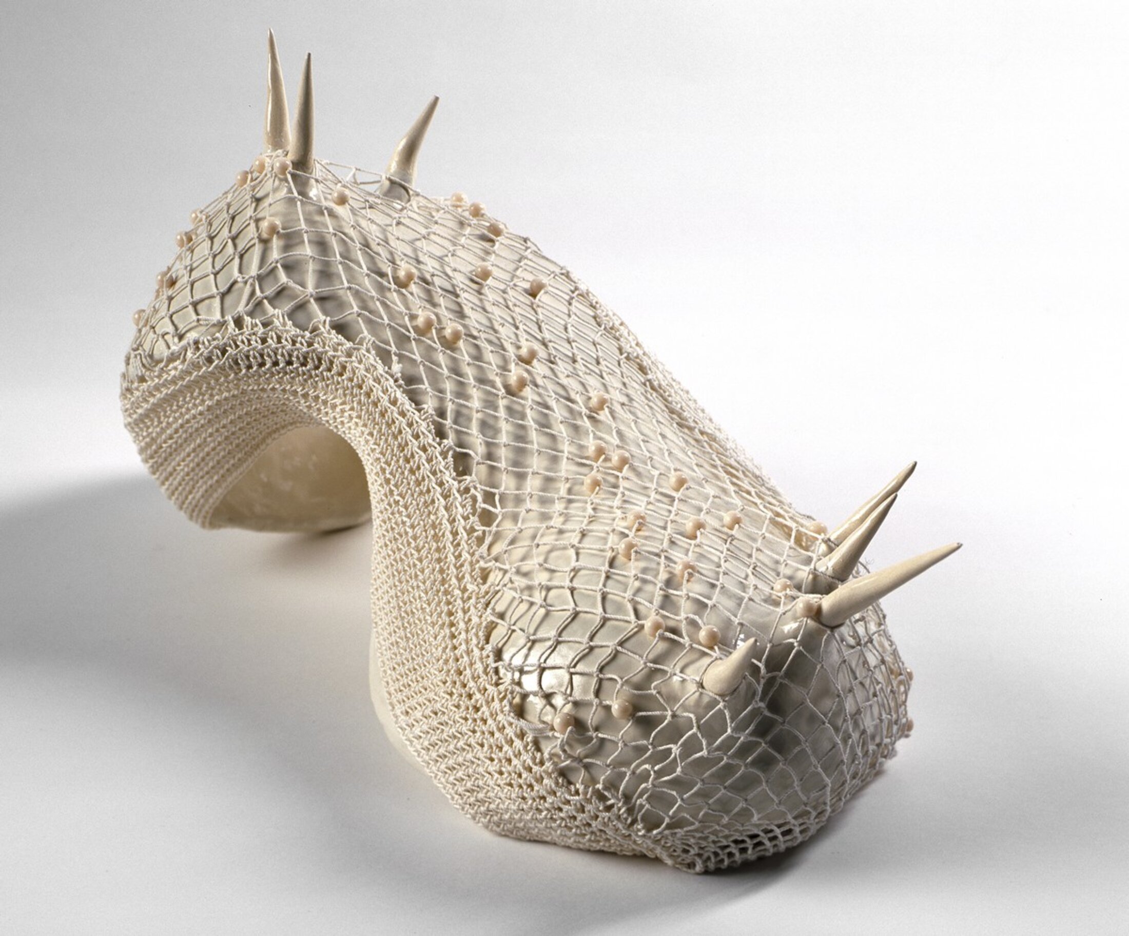 L’image du corps prend de nouvelles formes à la faveur de l’éclosion des nouvelles technologies. Dans la série de sculptures « Cesser d’être un », Goldring dirige son modèle exclusivement à travers un écran vidéo. Dans un système de renversement total, le corps, qui faisait image, tente ici de ressembler à l’image. Le corps robotisé cherche à redevenir humain chez Justine Emard (née en 1987, vit et travaille à Paris) dans l’installation vidéo « Co(Al)xistence » (2017) où l’artiste explore la relation entre l’homme et la machine, le danseur et le robot. Le chorégraphe américain Merce Cunningham (1919 – 2009) détourne le logiciel « Life Forms » mis au point par Tom Calvert pour servir à la notation chorégraphique, qu’il utilise pour produire de manière aléatoire des séquences combinatoires de mouvements, testées ensuite par les danseurs de sa compagnie. Envisagée comme une cuirasse, une arme ou une prothèse, la « panoplie de défense, épaule droite » (2003) de Christelle Familiari (née à Niort en 1972, vit et travaille à Rennes) s’inscrit singulièrement dans le présent où le triomphe des technologies promet au corps un dépassement de ses propres limites. A partir d’un moulage de son épaule, l’artiste produit un objet ambigu, à la fois délicat, sensuel, précieux et agressif, dû aux matériaux utilisés pour sa réalisation : dentelle et perles de verre, hérissées de pics de céramiques. « Float », la sculpture flottante de Robert Breer qui ouvrait l’exposition, vient aussi la clôturer en ramenant le visiteur dans le hall dans un effet de boucle.
