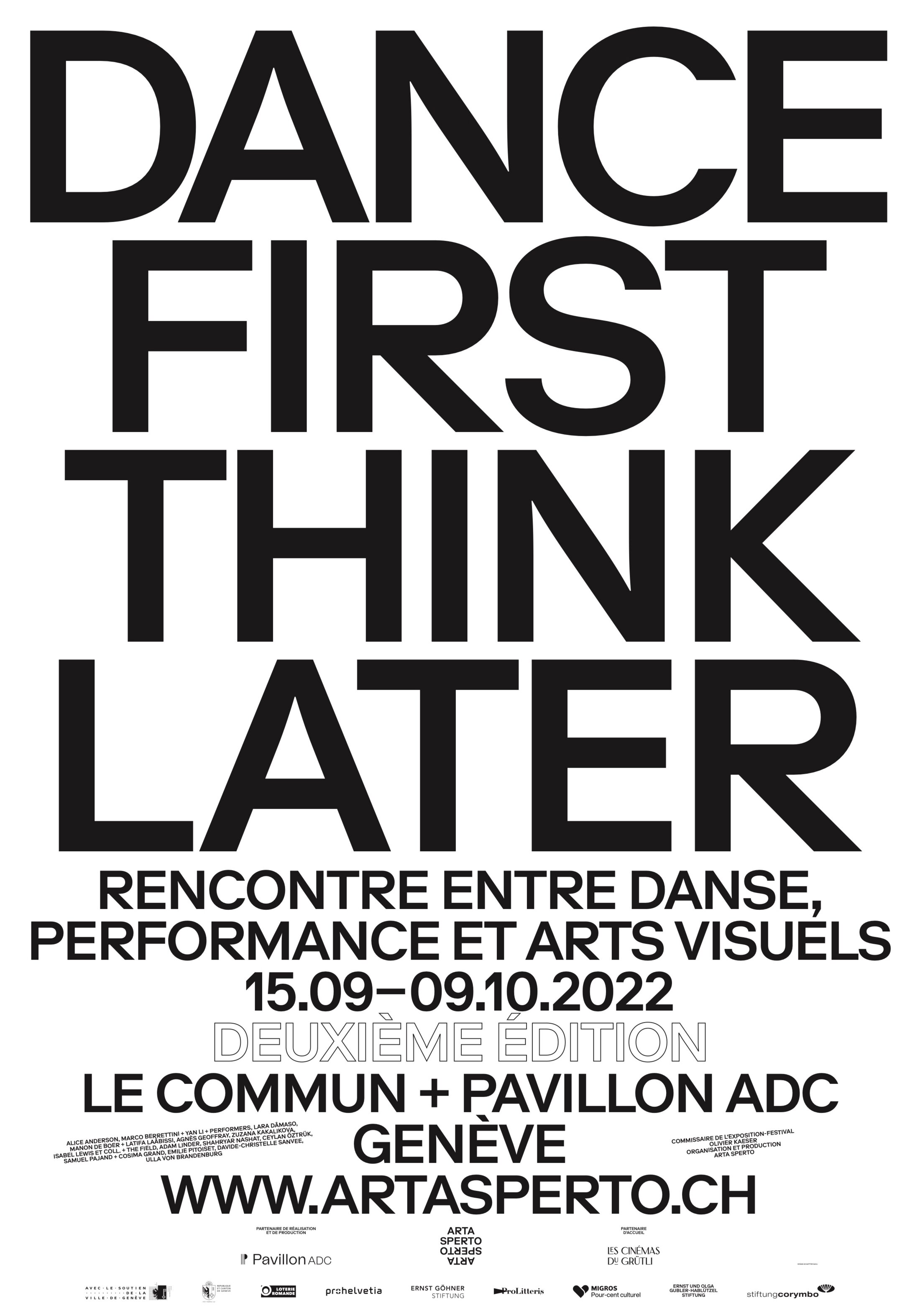 DANCE FIRST THINK AFTER. Rencontre entre danse, performance et arts visuels - Deuxième édition - Commissariat : Olivier Kaeser, historien de l’art, commissaire d’expositions indépendant. Artistes : Alice Anderson, Marco Berrettini + Yan Li + 13 performers, Lara Dâmaso, Manon de Boer + Latifa Laâbissi, Agnès Geoffray, Zuzana Kakalikova, Isabel Lewis et coll. + The Field, Adam Linder, Shahryar Nashat, Ceylan Öztrük, Samuel Pajand + Cosima Grand, Emilie Pitoiset, Davide-Christelle Sanvee, Ulla von Brandenburg.Collaboratrice générale à DFTL, production, administration, communication : Marion Huyghues-Despointes. Partenaire de réalisation et de production : Pavillon ADC. Partenaire d’accueil : Cinémas du Grütli. Dance First Think Later bénéficie du soutien de : Ville de Genève, Loterie romande Genève, Fonds cantonal d’art contemporain DCS Genève, Pro Helvetia, Ernst Göhner Stiftung, Fonds culturel ProLitteris, Service culturel Migros Genève, Fondation Ernst et Olga Gubler-Hablützel, Stiftung Corymbo.
