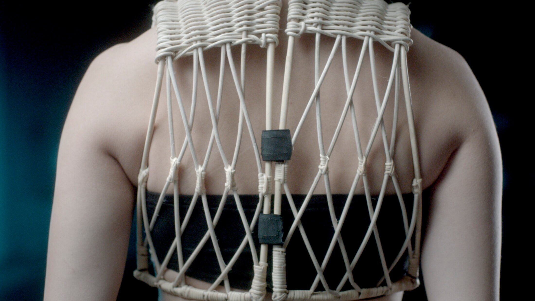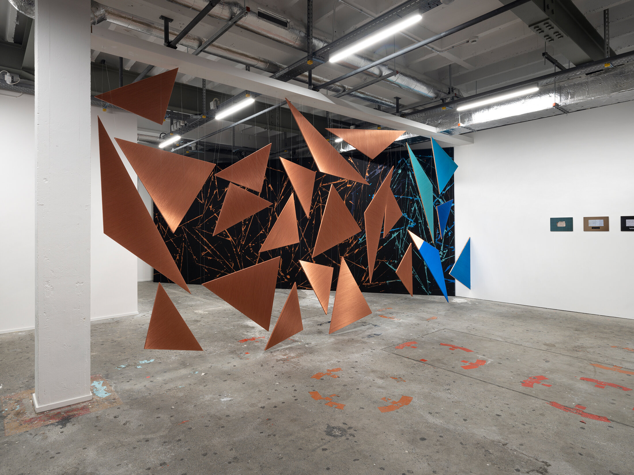 Elle les mémorise par le geste de recouvrement avec du fil métallique cuivré eco-friendly. Le cuivre, son métal de prédilection, l’intéresse pour son archaïsme : c’est le plus ancien utilisé par l’homme. Conducteur, notamment d’internet, il est passeur d’énergie. L’artiste convoque dans son œuvre à la fois les rituels immémoriaux et les nouvelles technologies pour connecter l’organique et la matière, l’humain et le non-humain. « Ecosytem Processes - Data Architecture », l’un des trois éléments qui composent l’installation, déclinant la porte en vingt-quatre objets en bois recouverts de fil de cuivre, sert aussi ici à partitionner l’espace, de la même manière que les rideaux multicolores créés spécifiquement pour l’exposition par Ulla Von Brandenburg, délimitent un environnement pour la projection de son film en Super 16 mm « Feste Erde, Flüssiger Wind » (2021).