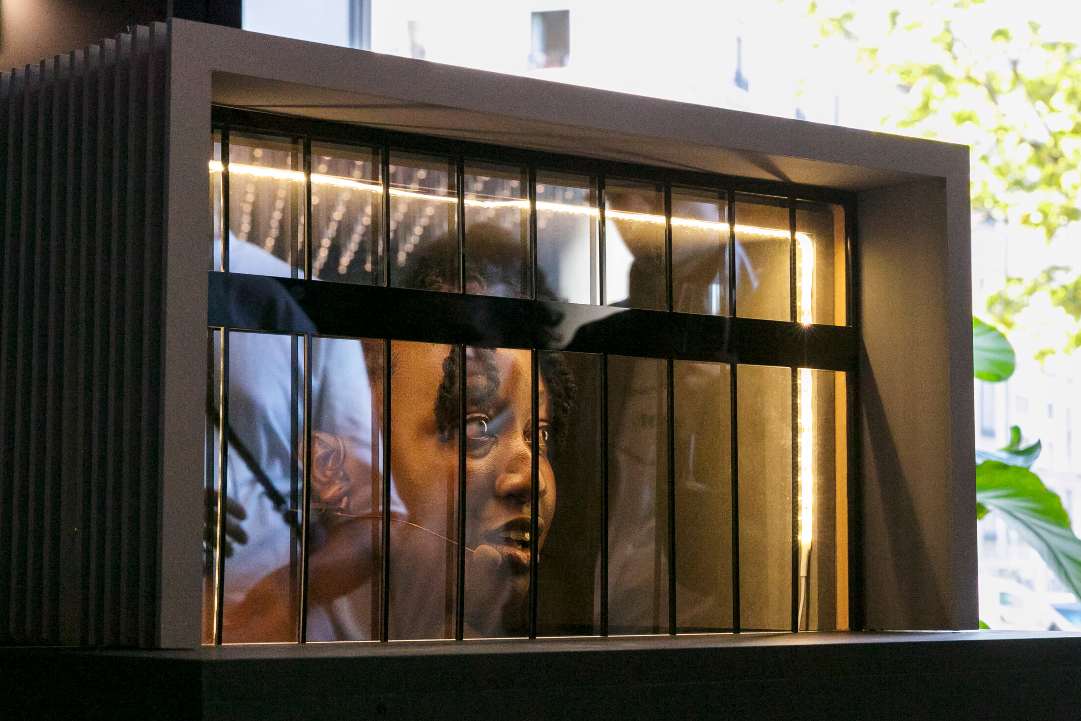 Enfermée à l’intérieur de l’une des maquettes représentant le Pavillon de l’ADC[7] installées dans le hall dudit pavillon, Davide-Christelle Sanvee en conte la genèse à l’aune de son contexte local. Dans ce quartier très, très, très calme de Genève, l’installation de l’institution a été acceptée par les habitants mais pour une durée de sept ans seulement et à condition que le bâtiment soit démontable. Face à cette situation aussi absurde qu’obtuse, le récit devient double. La condition précaire du pavillon est une subtile mise en abime de son histoire personnelle. Les vingt-deux ans d’errance de l’ADC dans sa recherche d’un lieu qui lui est propre, font écho à une autre errance qui réveille les stigmates d’une histoire intime à la recherche d’un chez soi.