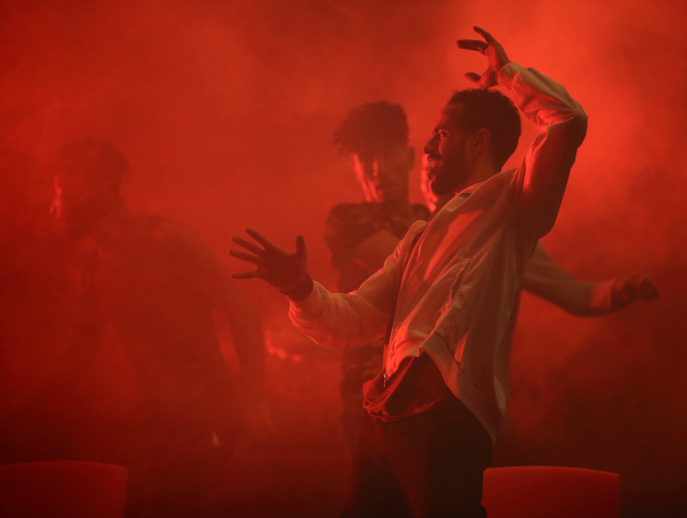Le Mahraganat s’impose aujourd’hui jusque dans les publicités. S’il incarne le corps et la voix de la jeunesse égyptienne, il fait danser tout le Moyen-Orient. « Itmahrag est un néologisme que j’ai inventé[2] » confie Olivier Dubois, « D’un mot Mahraganat, j’en ai conjugué un verbe qui n’existe pas : « Festoyons ». Itmahrag est comme une injonction à danser, à chanter ». Le chorégraphe précise : « J’aime beaucoup l’idée que tout ceci ne soit qu’une invitation à en être, à célébrer. Une célébration comme un enchantement ». Le corps quasi nu de ce jeune homme aux poignards et les quelques images fantasmées d’un regard trop occidental s’effacent alors devant l’exhortation à la fête qui, au rythme des pulsations viscérales d’un désir qui déborde, envahit tout, submerge la salle et les spectateurs. Ce soir, le public n’a qu’une envie, soutenir la fougue d’une jeunesse qui incarne le futur du monde.