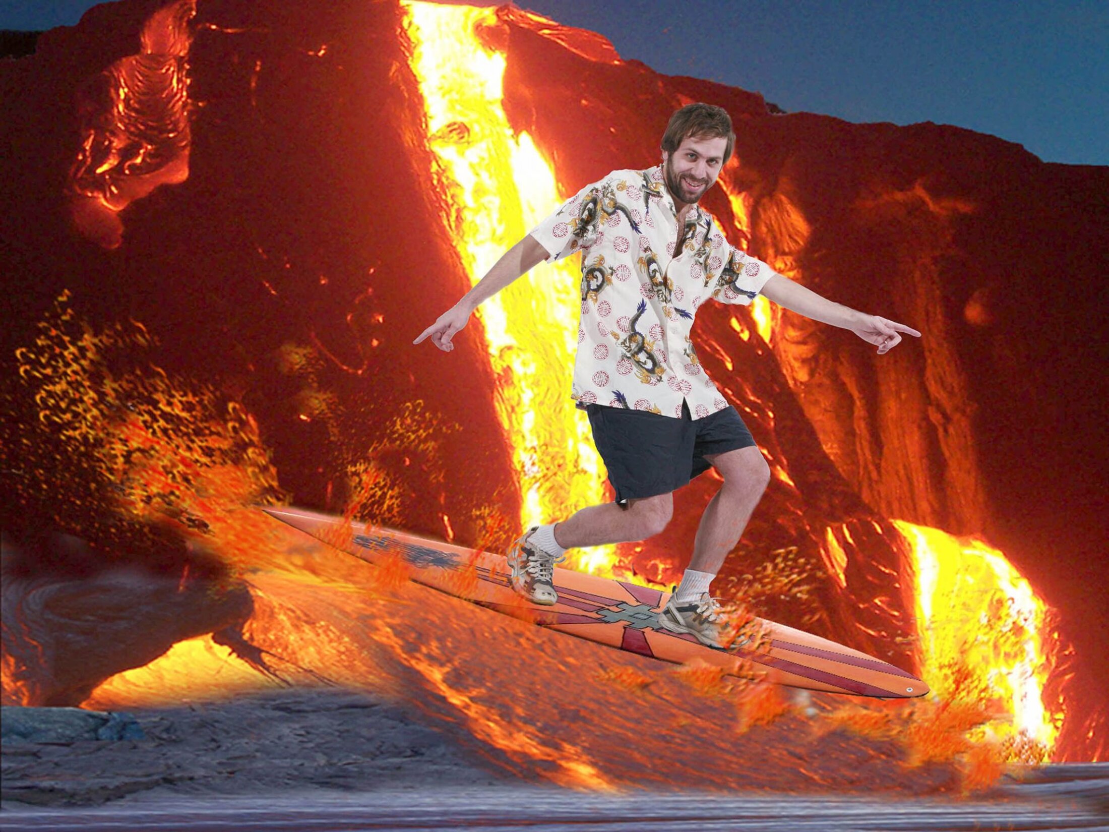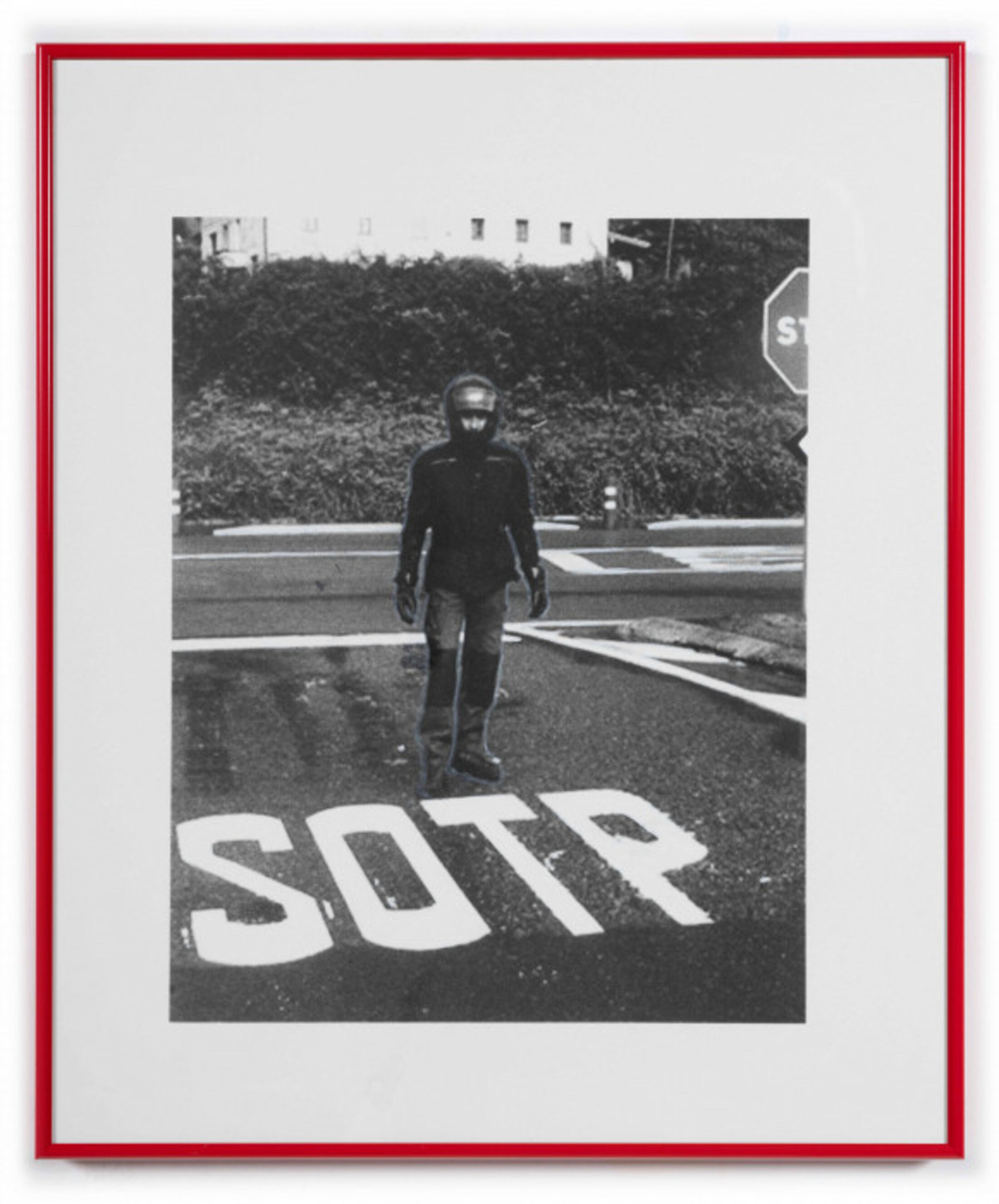 C’est au dernier étage de la MEP que débute l’exposition, avec la série « Sponsoring », née du constat de la récurrence visuelle dans la cérémonie de remise de chèques de banque à l’occasion d’une loterie ou d’un évènement caritatif, un genre que les anglophones pourraient résumer par « bank check ceremony picture ». Les caractéristiques communes de ces photographies les inscrivent dans l’héritage des portraits de groupe dont elles forment une sous-catégorie spécifique à travers la répétition des mêmes codes visuels et erreurs techniques, qu’il s’agisse des sourires forcés et des tenues élégantes, du flash agressif, des yeux rouges ou encore de la faible exposition. Tel un faussaire, l’artiste se livre à un long travail de retouche afin que l’issue narrative soit toujours la même : l’artiste en éternel gagnant. À proximité, Mailaender, chemise hawaiienne et short de plage, s’est photoshoppé en train de faire frire des œufs sur des volcans ou de s’adonner au « volcano bording » dans la série « Extrême tourism » qui invite les visiteurs à faire de même. Le point de départ de cet ensemble est la découverte en 2011 du travail photographique de Steve Young, spécialisé dans la prise de vues d’éruptions volcaniques. À partir de ces clichés, il réalise des photomontages pour ses clients à l’aide de son système « Volcano Fantasy Photo Business ». Ces mises en scène dans des situations extrêmes, offrant l’illusion d’une expérience héroïque sans risque et sans effort, amusent beaucoup l’artiste qui va faire appel à Steve Young pour réaliser une série qu’il a lui-même scénarisée, se moquant d’une société qui valorise l’exploit individuel jusqu’au narcissisme en marchandisant l’extrême.