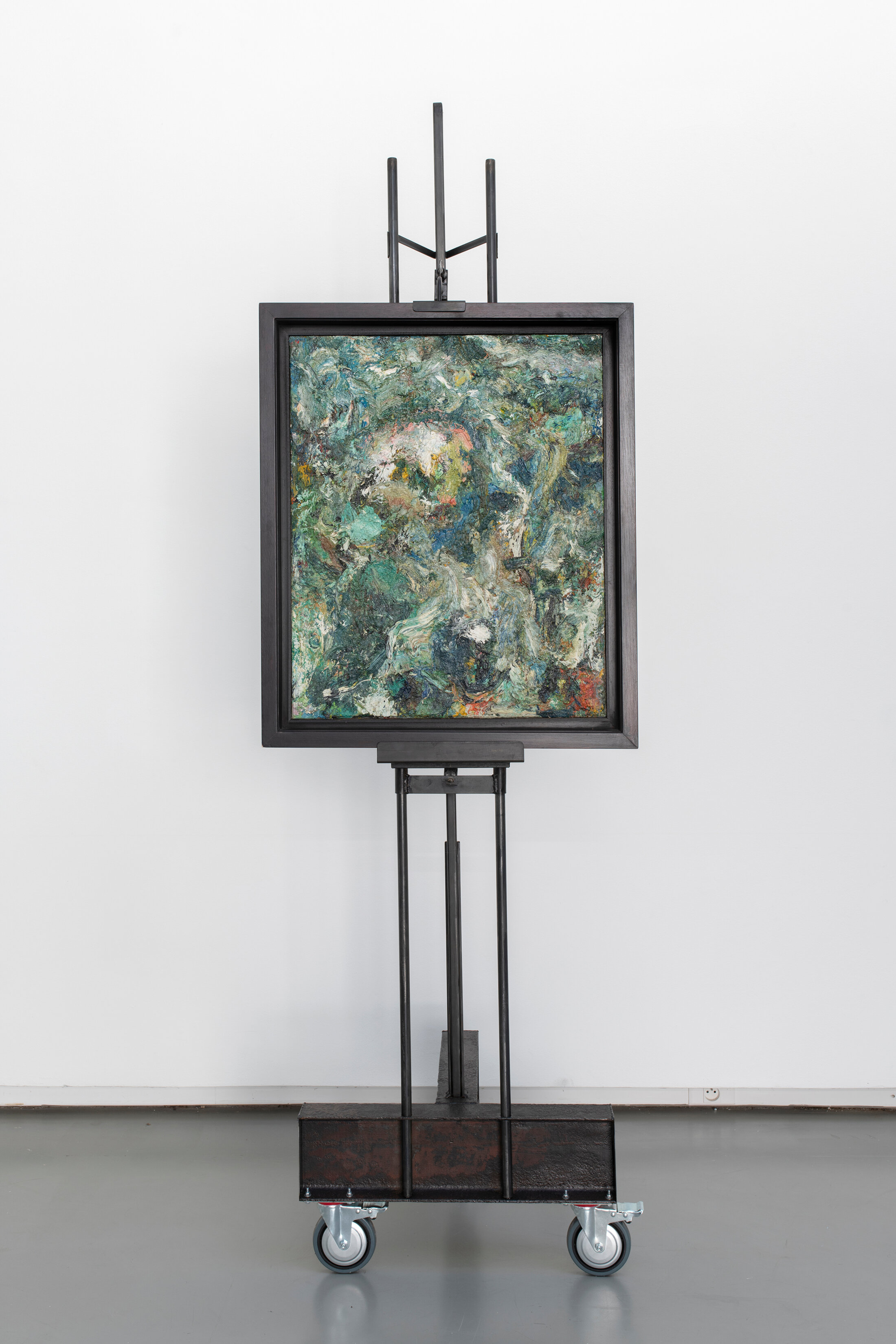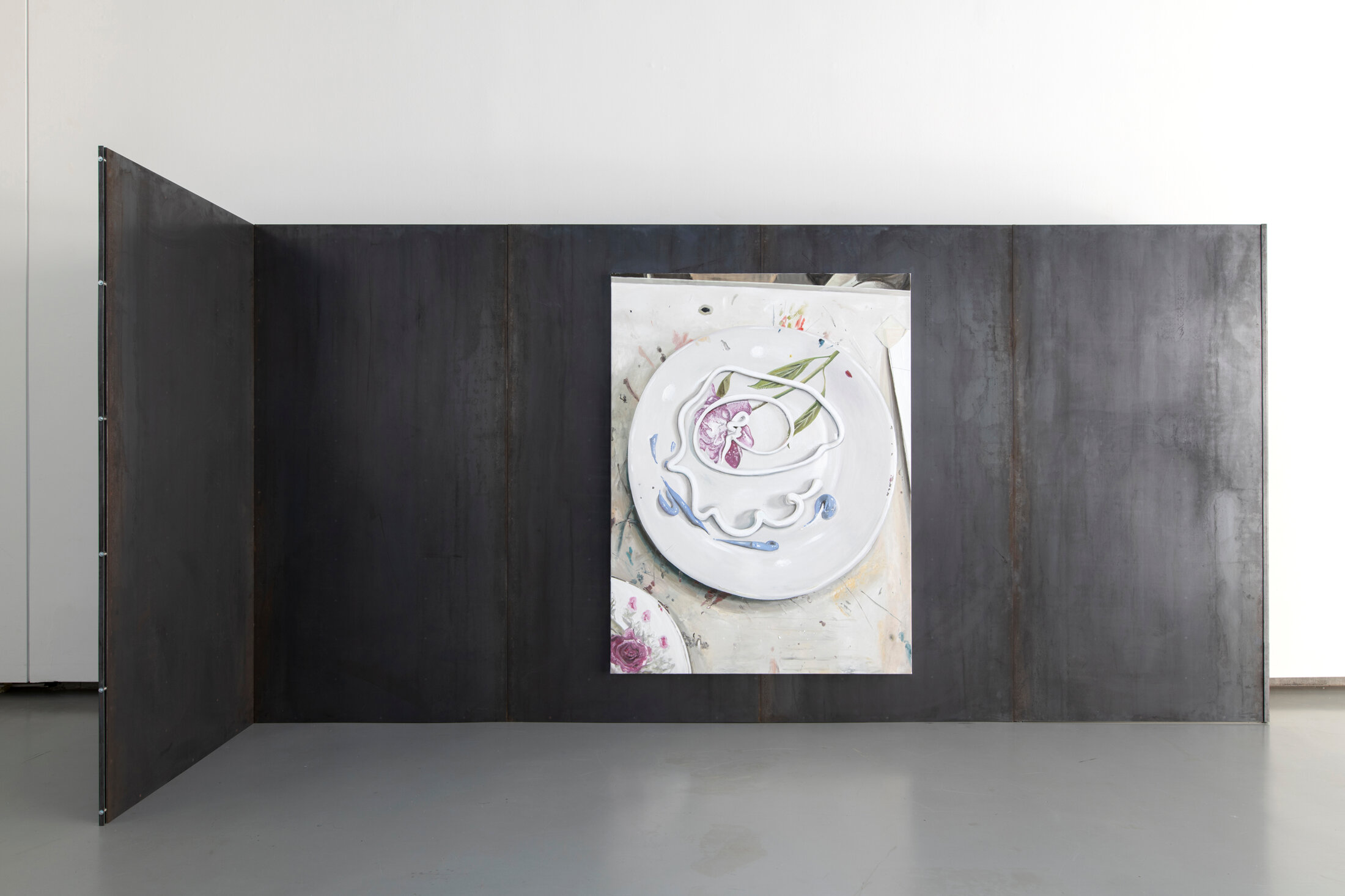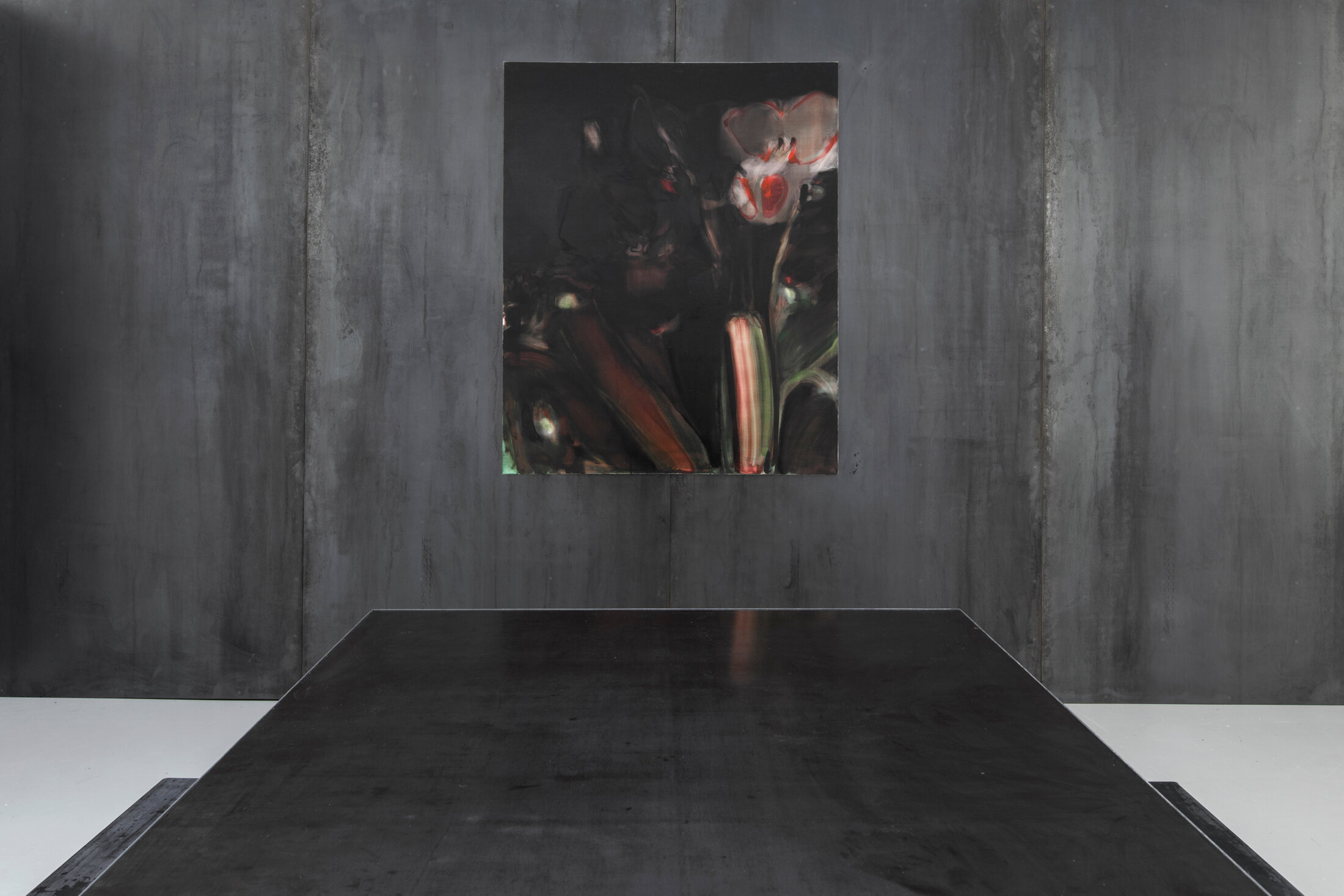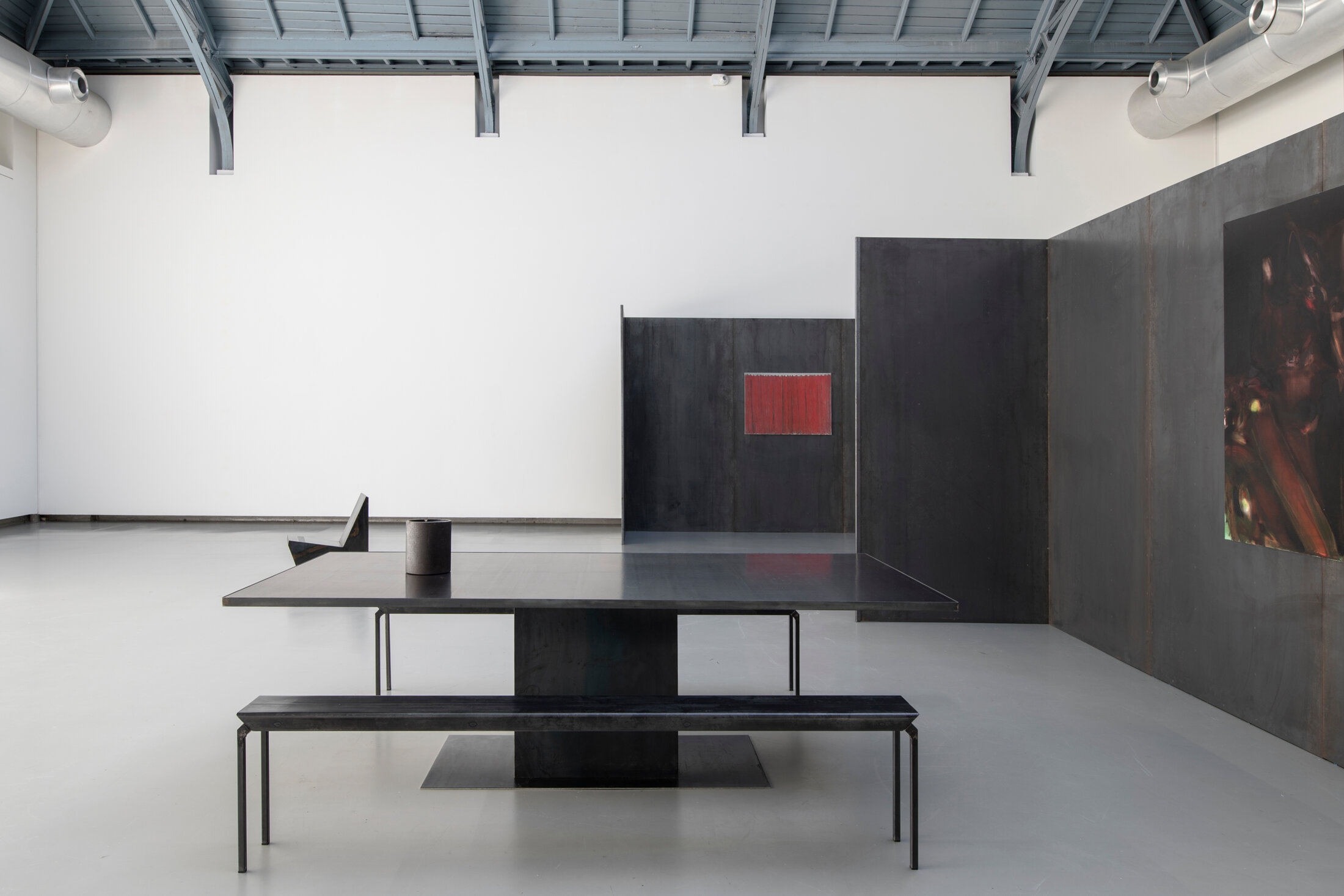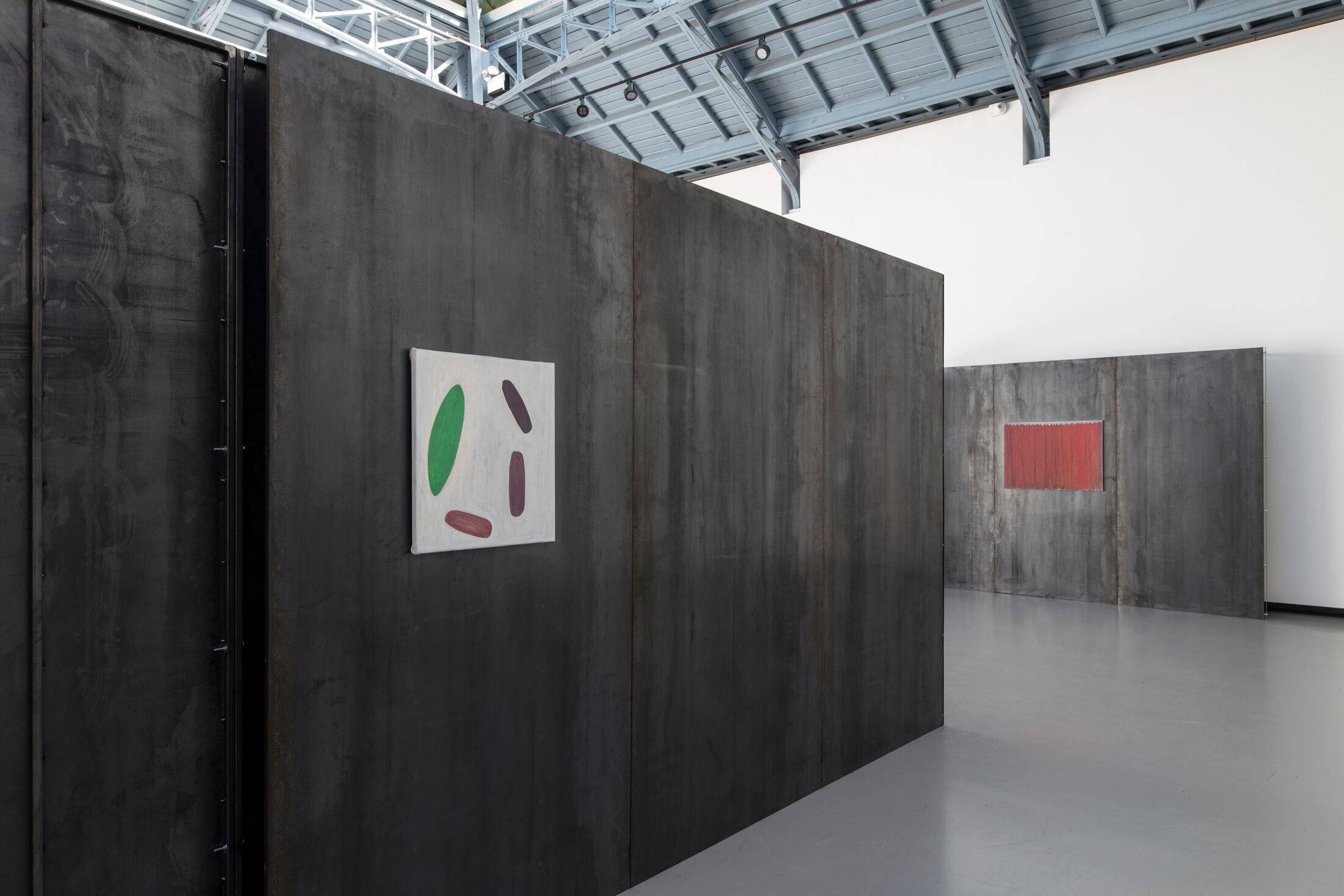 Cristof Yvoré est le seul à occuper le grand mur de la Verrière, tenant la position centrale au sein d’une communauté d’artistes réunie pour l’occasion, en confrontant ses œuvres avec d’autres, chacune réalisée par un peintre différent. Cette mise en regard est rendue possible à la faveur de l’ambitieuse commande, passée spécifiquement pour l’exposition, de meubles métalliques amovibles qui servent ici de cimaises autorisant le vis-à-vis pictural. Imaginés par le duo belge basé à Bruxelles Noir Métal – ce qui permet d’ancrer le projet dans la ville –, ils reconfigurent complètement l’espace de la Verrière. Ainsi, passée l’entrée, le visiteur est stoppé par une cloison métallique suffisamment imposante pour obstruer la vue de la salle que l’on embrasse habituellement d’un seul regard. Il forme une sorte d’antichambre, un sas qui permet la transition avec l’extérieur.