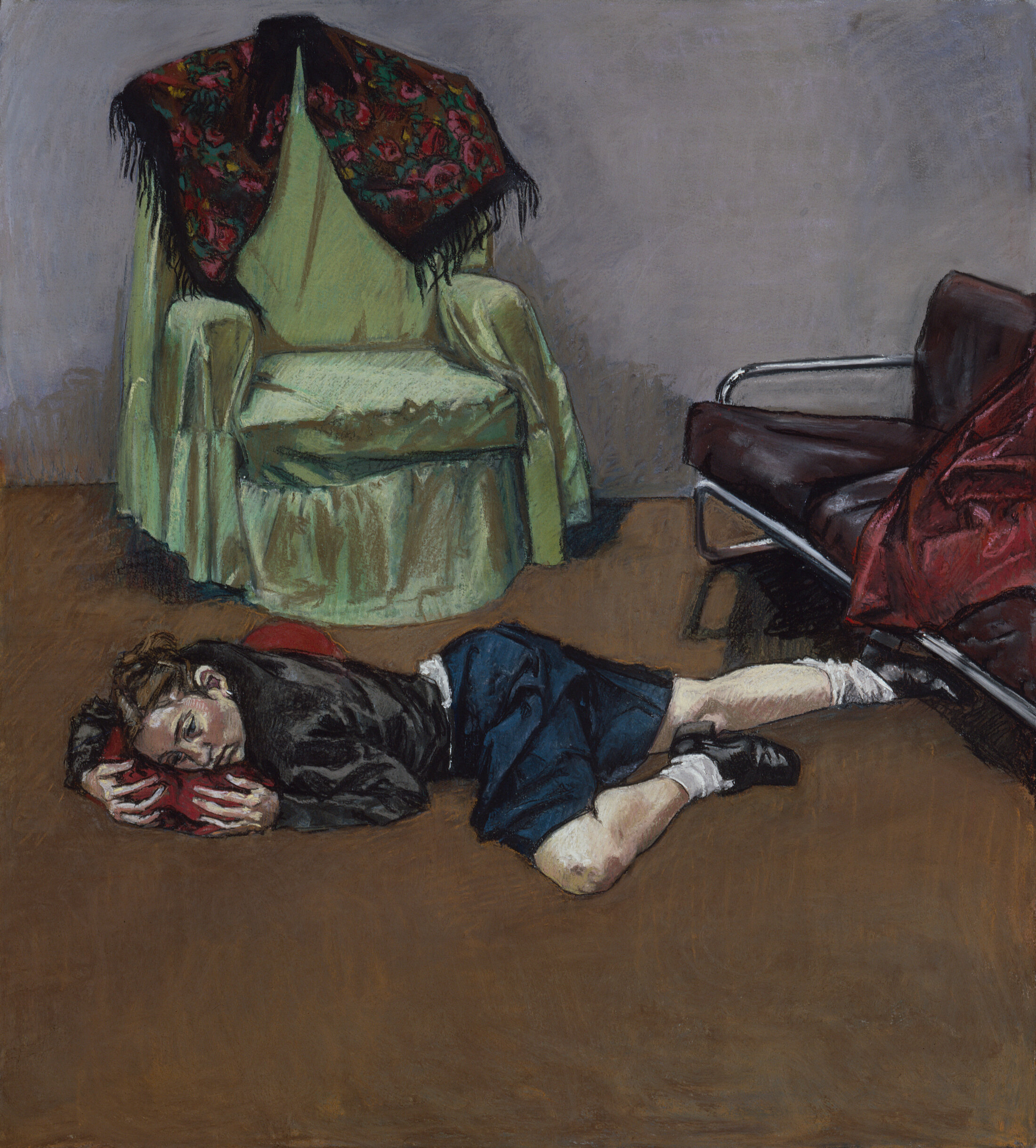 C’est par une série d’autoportraits que débute l’exposition bâloise. La plupart sont ambigus à l’instar de cette image dans un miroir qui ne reflète pas Rigo mais son modèle dans « Bordel patrol : self portrait with Lila, reflection with Ana » (2004). Il est rare que la peintre se montre directement comme dans « The artist in her studio » (1993) où elle occupe l’espace d’une façon généralement associée aux hommes, forte, les jambes écartées et fumant la pipe, affirmant une position d’artiste égale à celle de ses homologues masculins. Sculptures, choux et modèles vivants complètent la scène. L’« Autoportrait » de 1994, réalisé au pastel, marque un changement de technique dans son art puisqu’à partir de cette date, elle ne va quasiment travailler qu’avec du pastel sur papier. Bien que Paula Rego ait toujours séparé sa carrière professionnelle de sa vie de famille, son mari et leurs trois enfants apparaissent régulièrement dans ses œuvres.
