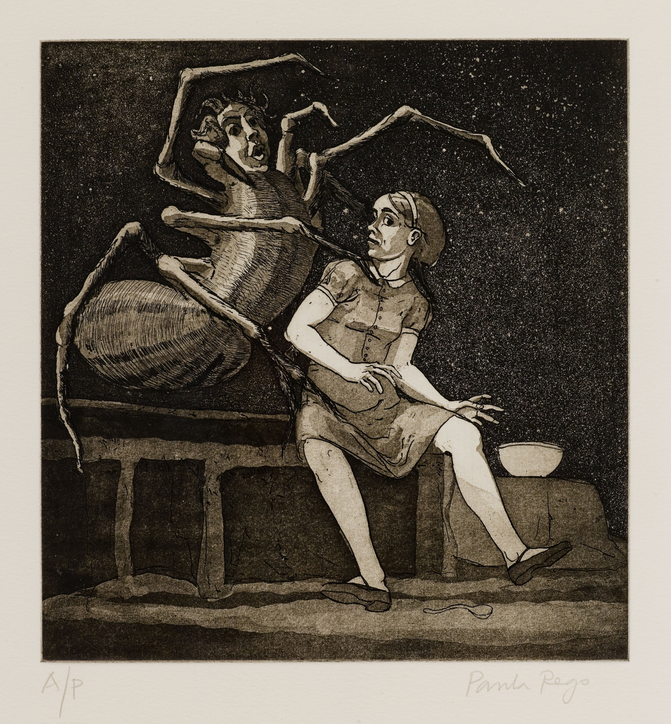 La salle consacrée aux relations entre les femmes et les hommes, intitulée « lutte des sexes », atteste que l’univers de l’artiste n’est pas un monde idéal. La dynamique entre les sexes est marquée par le pouvoir et la violence. Ici, les figures animales représentent des adversaires ou des forces pulsionnelles et des besoins physiques. Paula Rego rejoue ses propres expériences lorsqu’elle aborde le thème de l’infidélité ou des soins apportés à son mari. L’artiste envisage la domination, la vulnérabilité et l’affirmation de soi comme le sort de la condition humaine. Un ensemble de gravures liées à la thématique des « Jeunes filles au chien » donne à voir les motifs de domination et d’infériorité qui déterminent ici l’action.