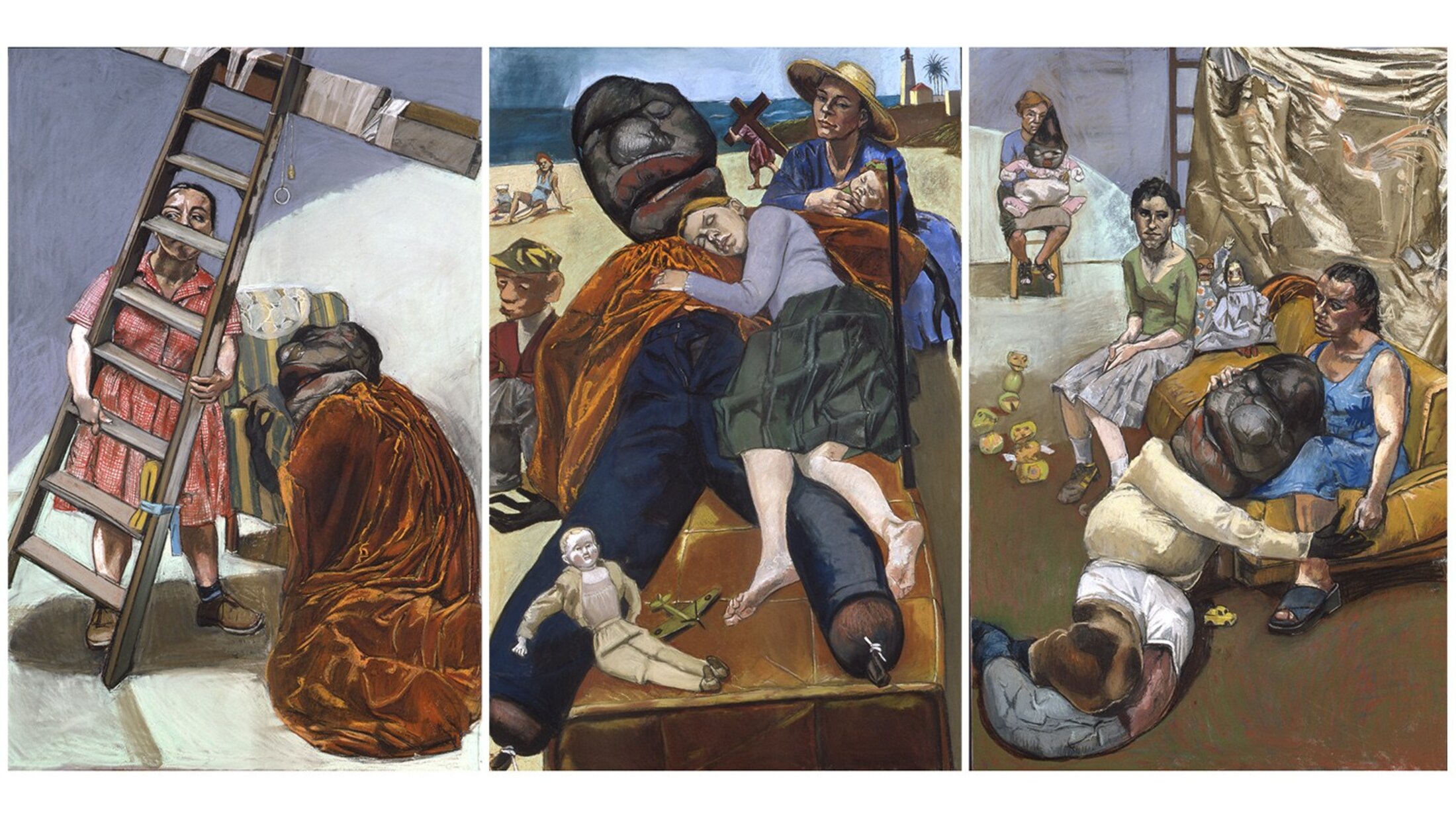 Lorsque Paula Rego entame une psychanalyse, elle s’ouvre aux domaines de l’irrationnel et du refoulé. Adapté de la pièce du dramaturge irlando-britannique Martin McDonagh, « The Pillowman (triptyque) » (2004) apparait ici terrifiant. La scène centrale est dominée par la masse noire et flasque d’une peluche grotesquement énorme dans les bras de laquelle dort une jeune femme. Derrière eux, une mère allaite un enfant sur une plage du littoral. Au loin apparait un phare esseulé. Paula Rego reprend principalement les récits sombres des contes de fées, qu’elle insère dans une scène d’interrogatoire. L’artiste associe L’homme oreiller à la figure de son père souffrant de dépression.