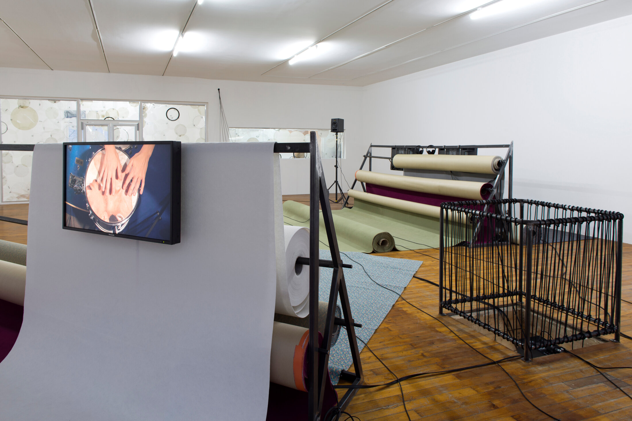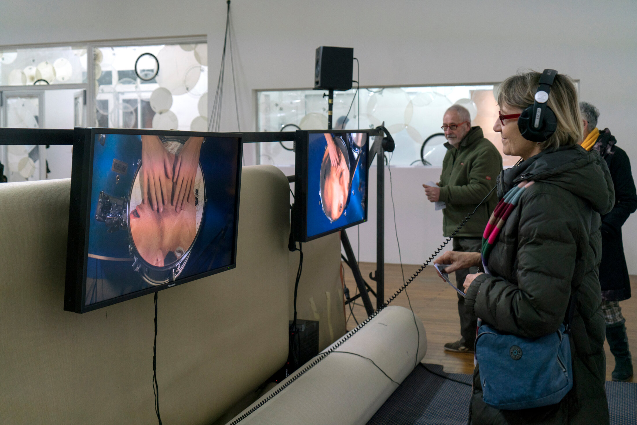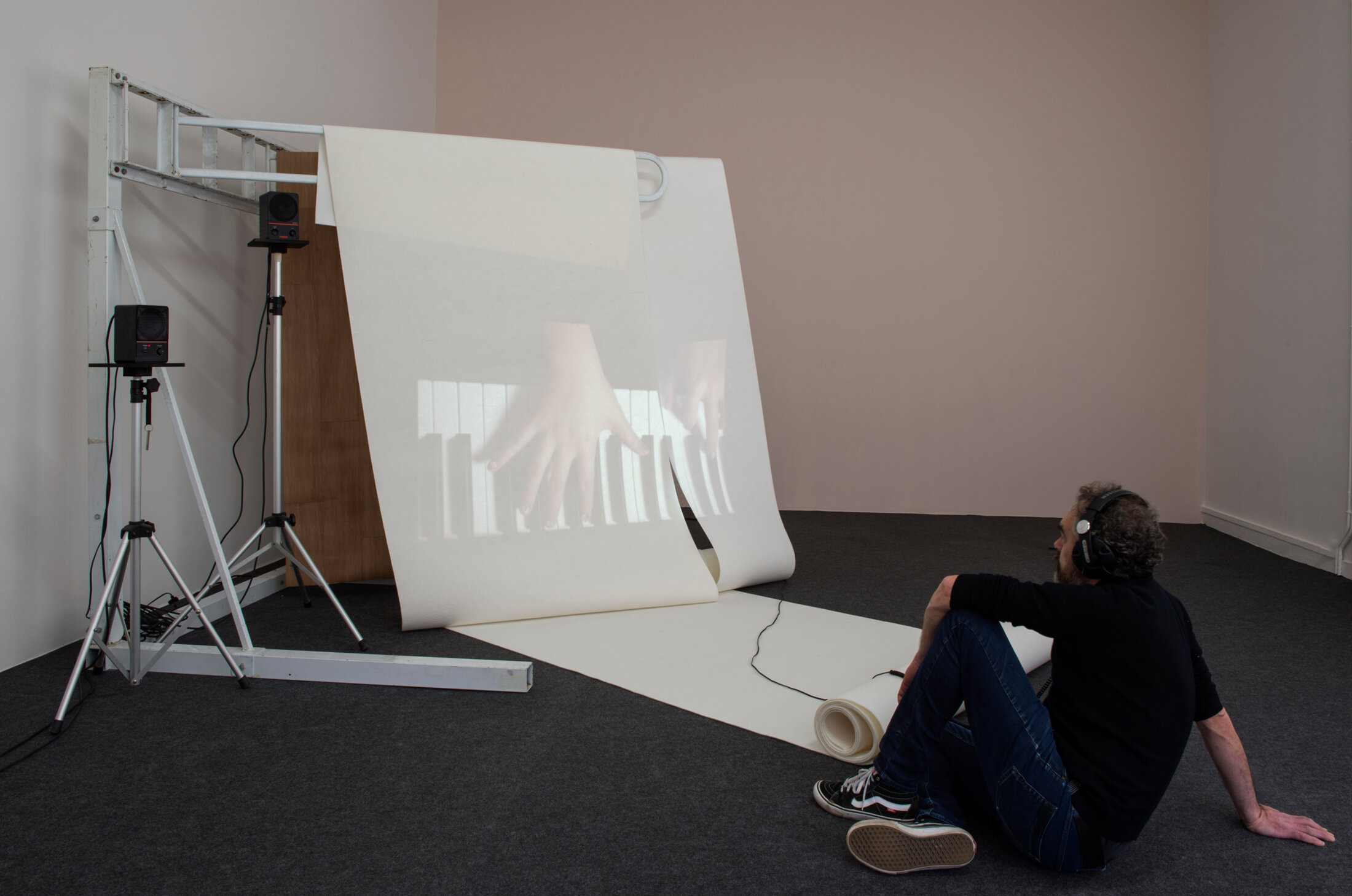 Ce mur de peau de batteries fait écho aux écrans qui projettent sur un lai de moquette trois vidéos extraites de « The Neighbours F’s: Fun and Fame », qui prolongent « Le théâtre chez l’habitant - théâtre d’habitation » (réalisé comme les vidéos en collaboration avec Charlotte Khouri) en faisant parler des portraits. La percussion est envisagée comme langage. Un batteur caresse des images issues de reproductions de tableaux célèbres mis sous verre par Colette, l’une des hôtes du théâtre chez l’habitant, des portraits ou des parties de corps d’hommes et de femmes montés sur peaux de batterie, pour les faire parler. Le langage est proche de la percussion corporelle bien qu’il tente d’imiter le son de la pluie par exemple. C’est cette même caresse que l’on retrouve au rez-de-chaussée dans la petite salle introductive où Yurie Hu interprète trois morceaux extraits des suites pour piano « Le coin des enfants » de Claude Debussy. Le piano électrique est ici éteint, seul le bruit sourd de la mécanique des touches est audible. Sur ses ongles sont peintes les images des donneurs de sperme enfants, en écho à l’installation présentée à la biennale de Rennes dans laquelle étaient visibles quatre-cents portraits des donneurs de sperme. Ce sont ainsi les doigts des donneurs qui jouent les morceaux muets des Suites de Debussy.