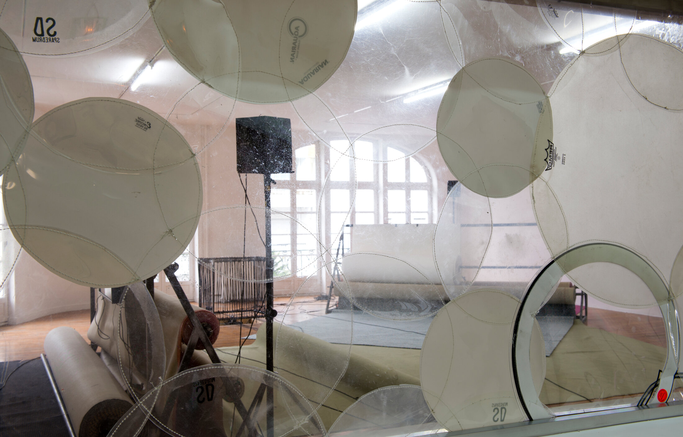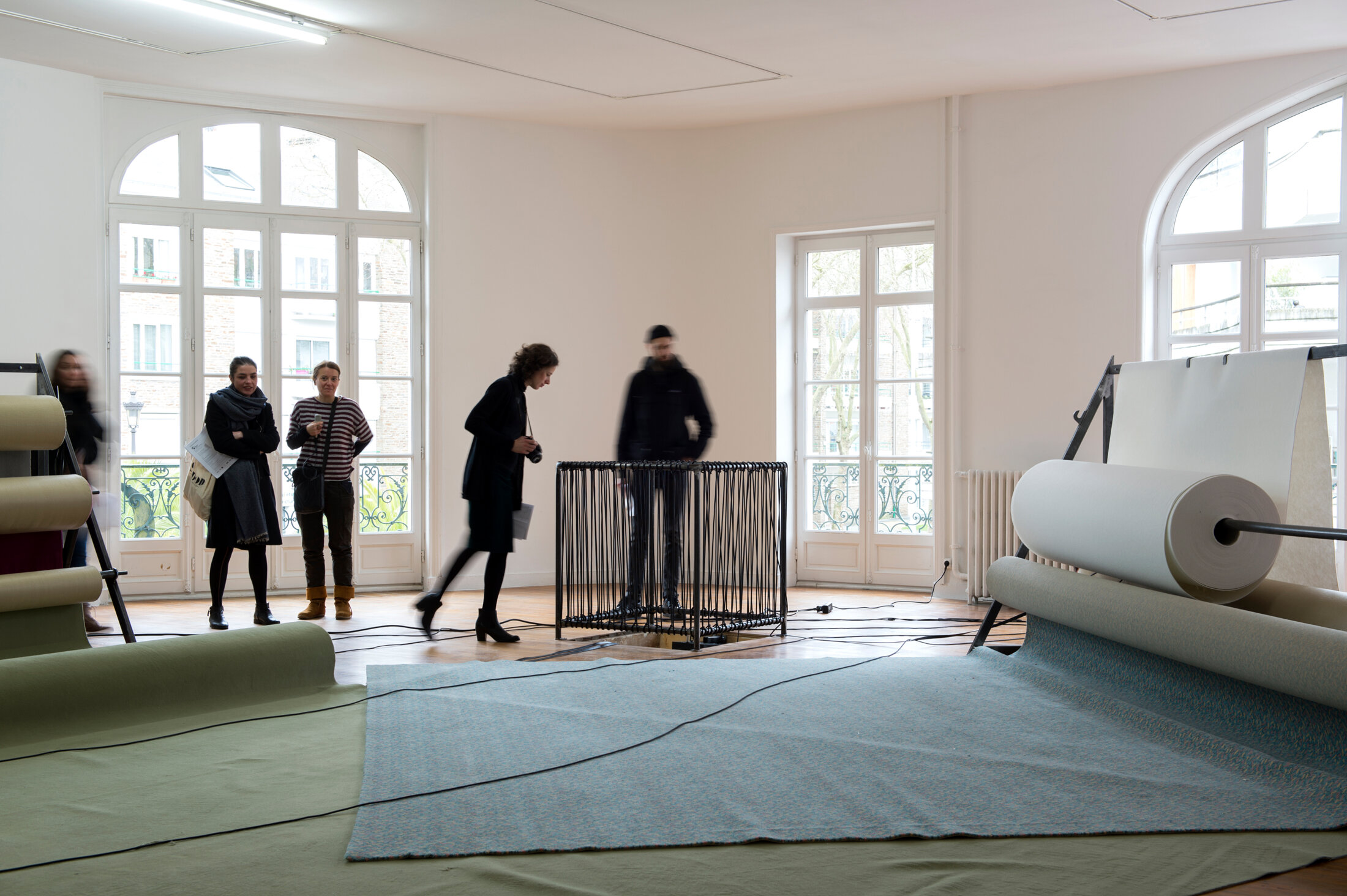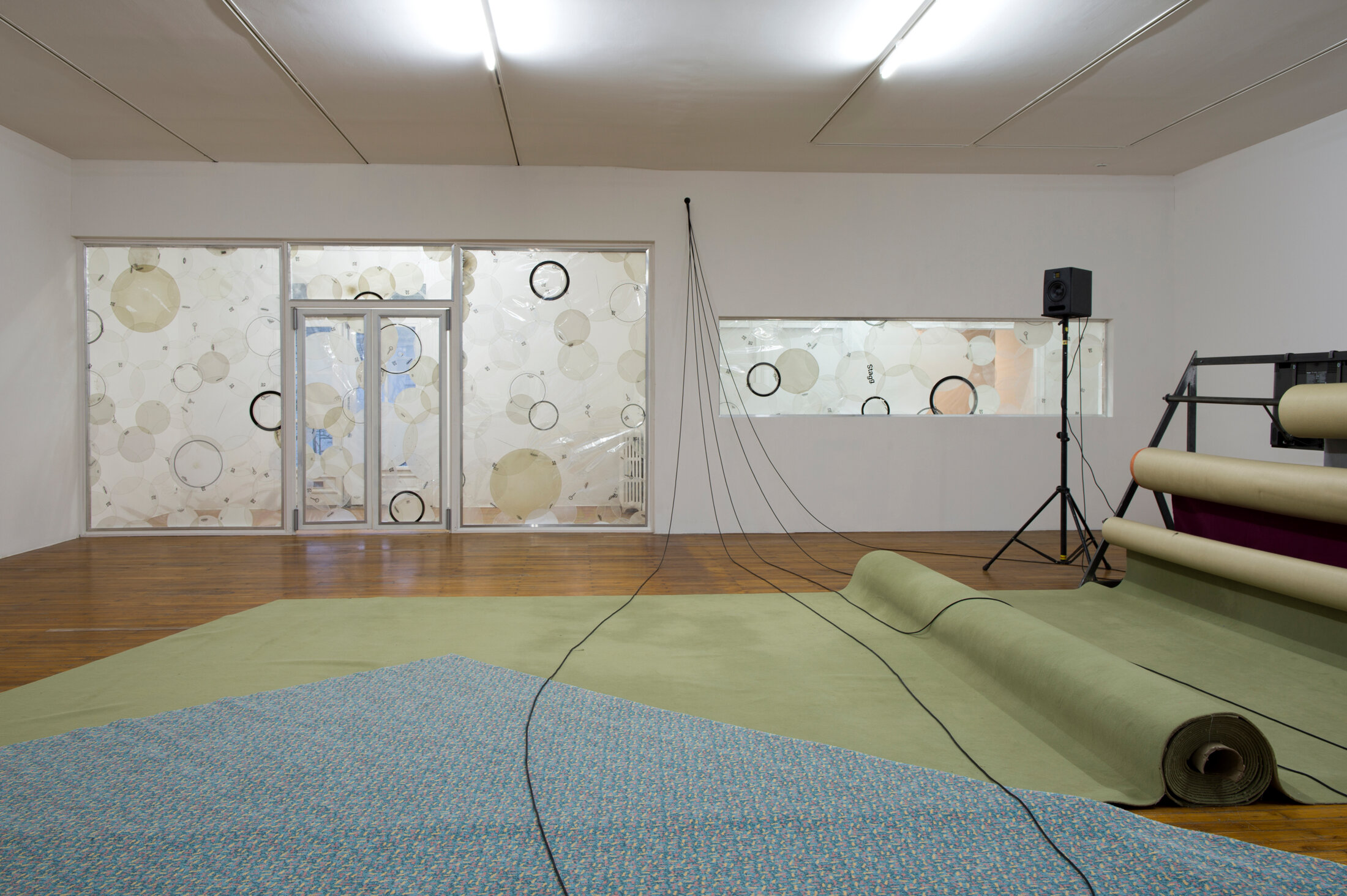 S'appuyant sur les nombreuses portes battantes du Grand Café qui racontent son histoire, Anne Le Troter accorde à la notion de seuil une place prépondérante dans l’exposition. Celui de la petite salle déborde sur le couloir et même sur l’entrée de la grande salle. Celui du mur en peau de batteries de la salle du premier l’étage prend la forme d’une lame tendue, un organe, une peau ornementale. Il y a quelque chose d’artisanal ici, dans ce mur porteur de son qui n’en émet pas vraiment. Les motifs qui le composent répondent à ceux des moquettes dont certaines sont également issues des paquebots produits à Saint-Nazaire. Chaque motif définit un espace utilitaire : la salle à manger, la chambre, le couloir…