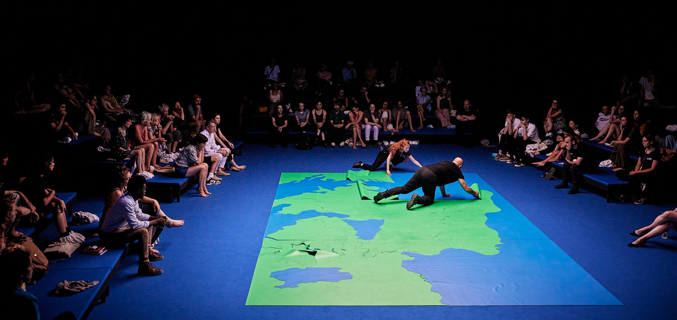 Cette première partie est marquée par les interventions des protagonistes qui, entre chacun des dix points, enlèvent des morceaux du planisphère au sol, laissant découvrir à chaque fois une nouvelle cartographie de l’inhumanité, portant les premiers oripeaux tels des corps morts, des linceuls, plaçant des repères pour retracer et conter ici le naufrage du 26 mars 2011 dans lequel soixante-trois des soixante-dix personnes africaines, âgées de vingt à vingt-cinq ans ainsi que deux bébés, étaient mortes de faim et de soif sur un canot pneumatique à la dérive durant quatorze jours, laps de temps au cours duquel l’embarcation fut photographiée par un avion de patrouille français et survolée à deux reprises par un hélicoptère. Deux bateaux de pêche et plusieurs autres navires croisèrent sa route sans qu’aucun ne lui vienne en aide, ni les navires militaires, ni les garde-côtes européens[6]. Elle est également ponctuée par des moments de danse chorégraphiés et interprétés par Bernardo Montet, membre du projet depuis 2021. Du corps à terre ayant du mal à se mouvoir, de cette difficile naissance au corps surprotégé du représentant des forces de l’ordre, véritable « Robocop » pris de tremblements frénétiques au point de ne plus pouvoir tenir sur ses propres jambes, s’écroulant à chaque fois qu’il se relève, comme si son activité était insupportable, le très émouvant corps-à-corps avec Stéphane Ravacley assure la transition vers la seconde partie.